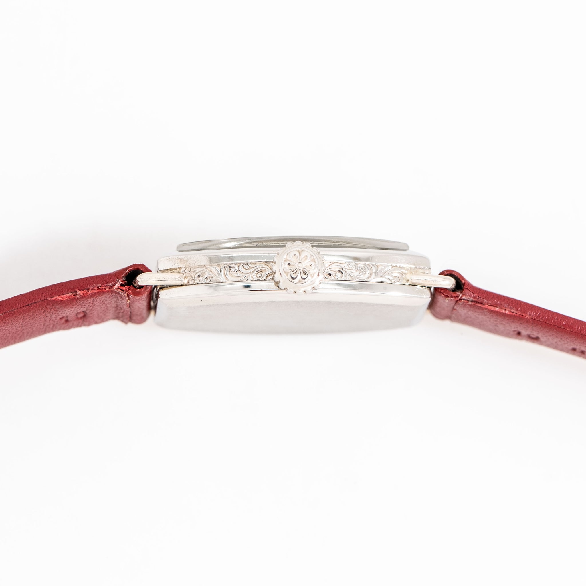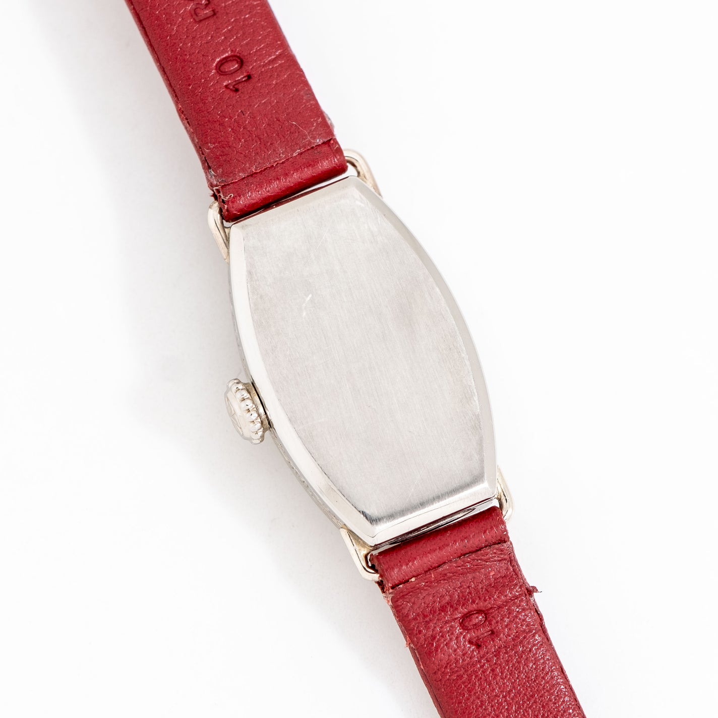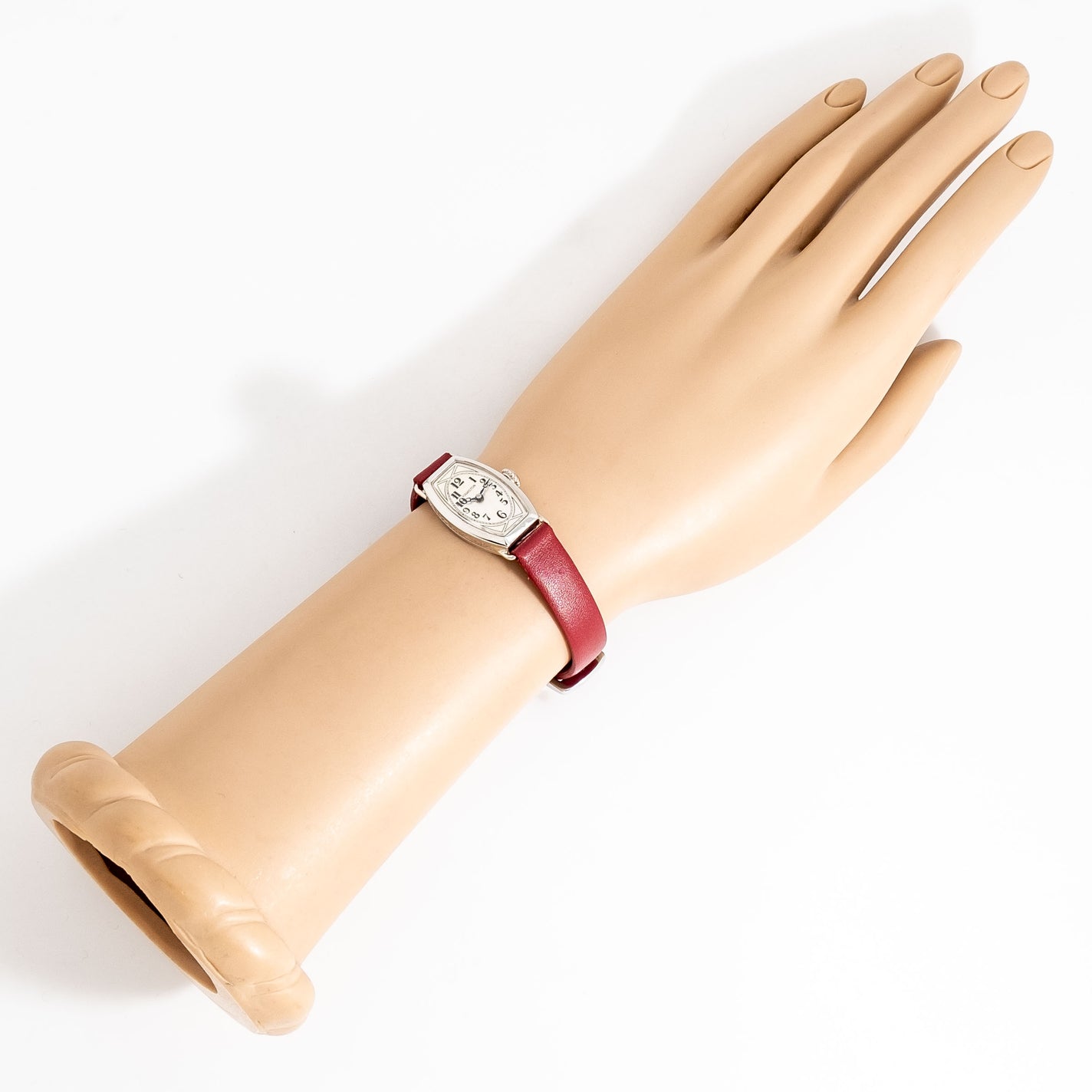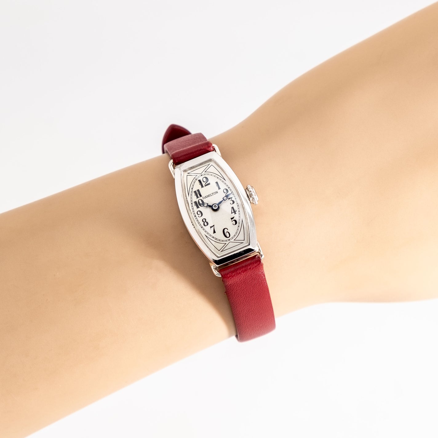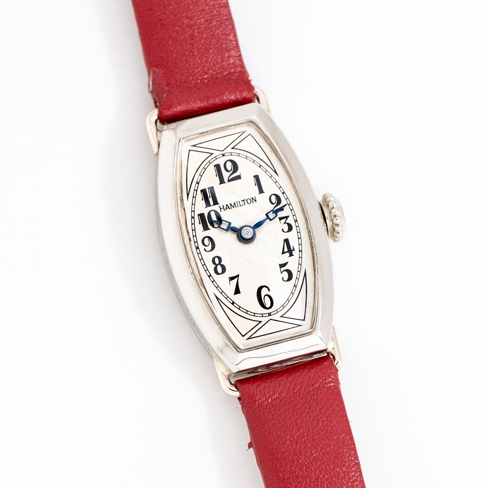 1920's Vintage Ladies Hamilton 14k White Gold Watch. Features a Professionally Restored Silver Dial in Very Good Condition with Printed Black Colored Arabic Numerals, Black Colored Minute Track, and Blued Steel Breguet Hands. Comes on a 10mm Genuine Leather Red Colored Strap. Powered by a 17 Jewel Caliber 989 Manual Winding Movement. Triple Signed. Swiss Made.