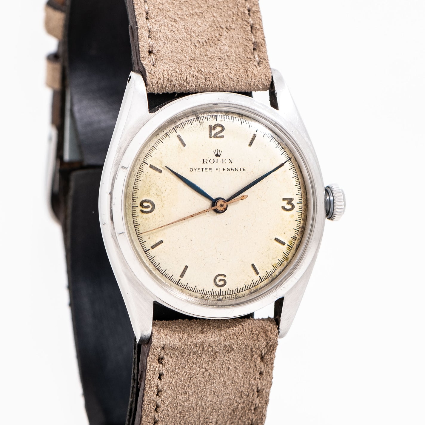 1946 Vintage Rolex Oyster Elegante Ref. 4365 Watch in Stainless Steel. Features an all Original Dial with Aged Patina, Applied Aged Arabic Numerals, Printed Black Colored Minute Track, and Blued Steel leaf Hands. Comes on a 19mm Genuine Suede Leather Beige Colored Strap. Powered by a 17 Jewel 10 1/2 Lignes Rolex Manual Winding Movement. Triple Signed. Swiss Made.