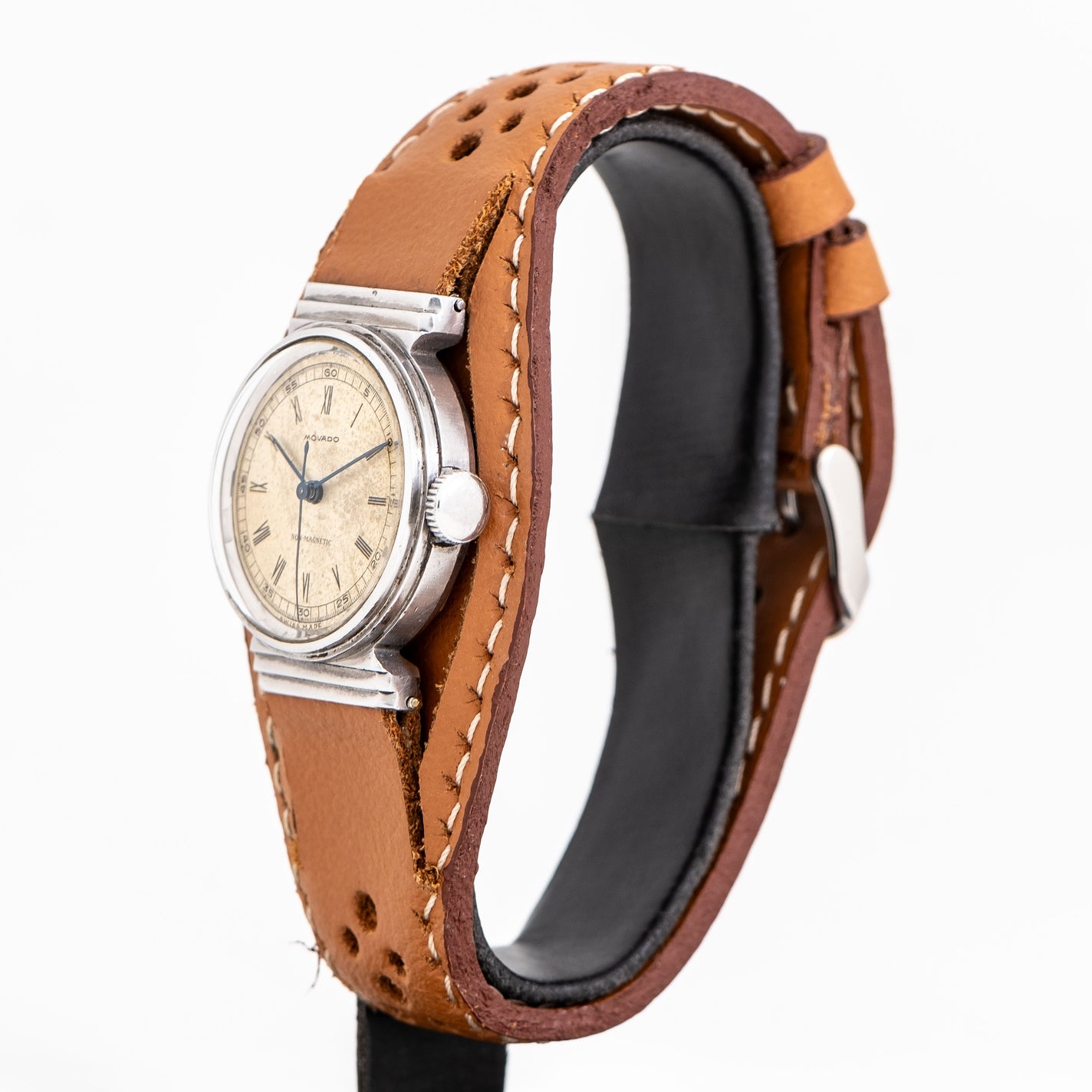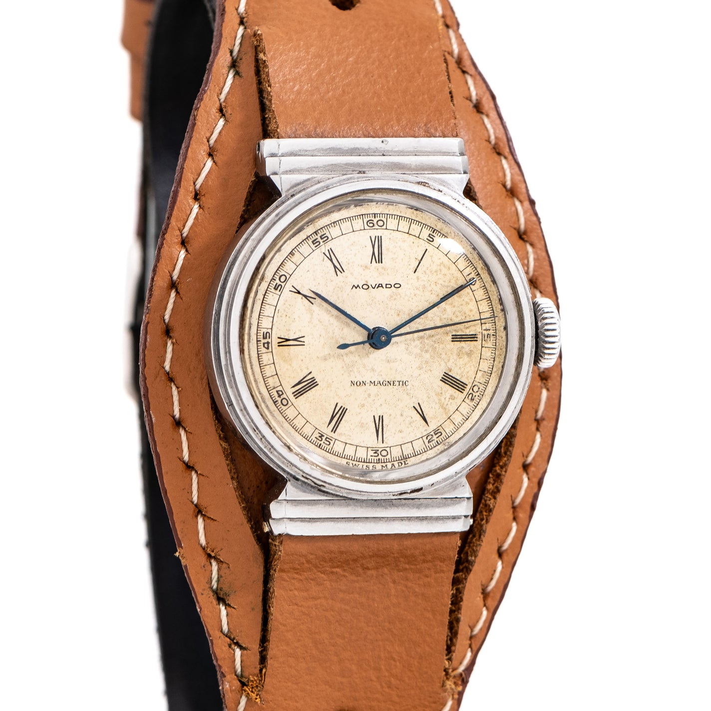 1950's Vintage Movado Non-Magnetic Ref. 11778 Stainless Steel Watch. Features an all Original Warm Aged Silver Dial with Aged Patina, Printed Black Colored Roman Numerals, a Center Seconds Sweeping Hand, and Blued Steel Stick Hands. The Case of this Watch is Manufactured by the Well Regarded François Borgel Company. The Watch comes on a 16mm Genuine Leather Brown Colored Bund Strap. Powered by a 15 Jewel Caliber 150MN Manual Winding Movement. Triple Signed. Swiss Made.