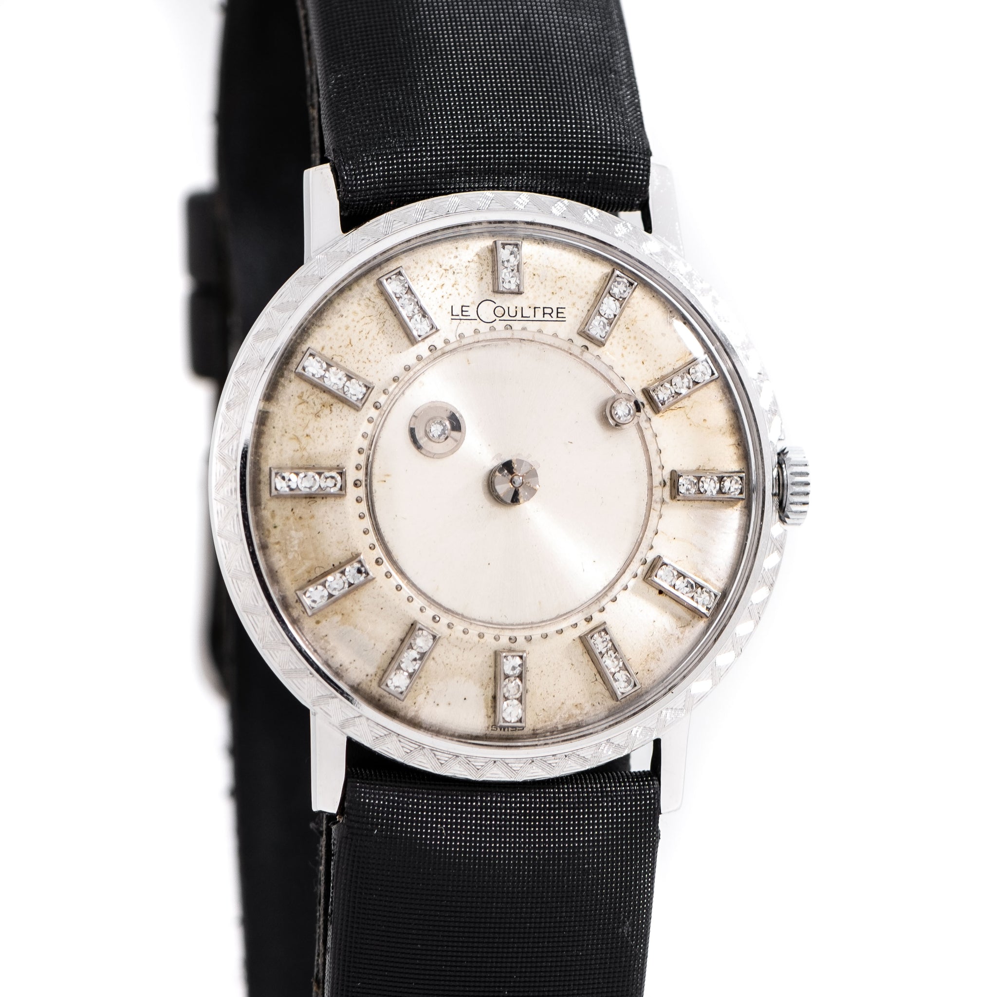 1950's Vintage LeCoultre Mystery Dial Ref. 195 Solid 18k White Gold Watch. Features an all Original Warm Aged Silver Mystery Dial with Aged Patina, Diamond Studded Applied Bar Hour Markers, and Diamond Studded Hour and Minute Discs. Comes on an 18mm Genuine Satin Black Colored Strap. Powered by a 17 Jewel Caliber K818/CW Manual Winding Movement. Triple Signed. Swiss Made.