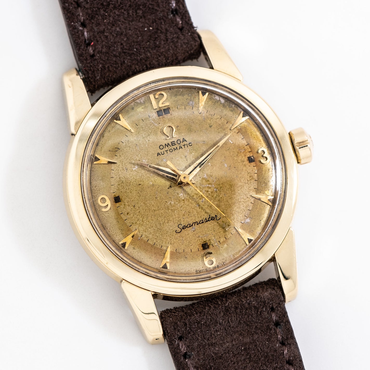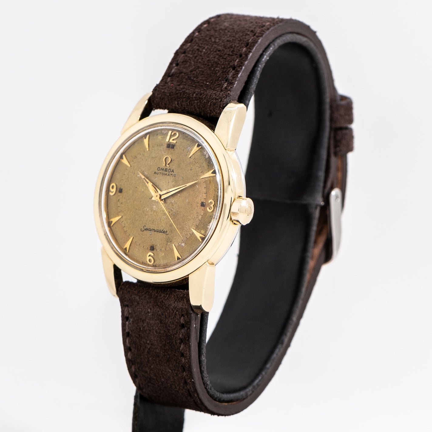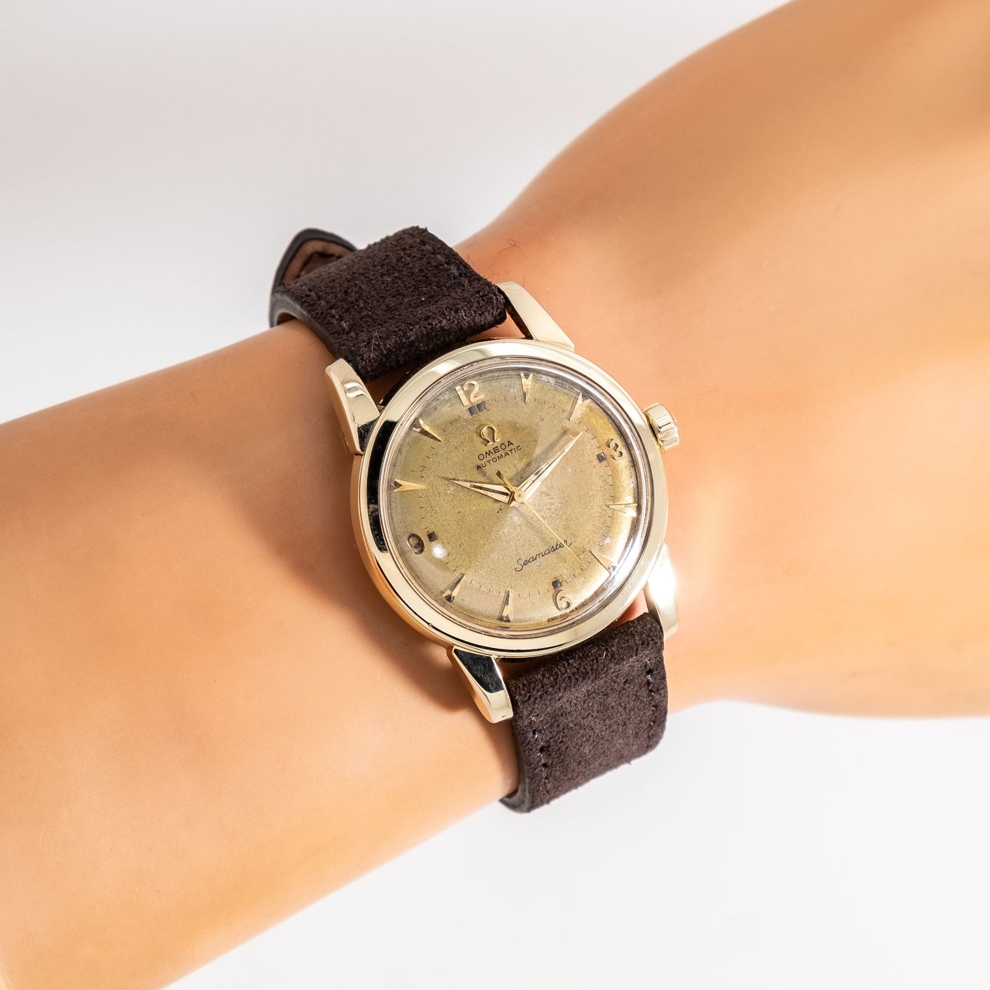 1952 Vintage Omega Seamaster Ref. 2767-11 SC 14k Yellow Gold Capped Stainless Steel Watch. Features an all Original Aged Champagne Colored Dial with Patina Applied 12, 3, 6, 9, Yellow Gold Colored Arabic Numerals, Applied Yellow Gold Colored Pointed Hour Markers with Aged Luminous Plots, and Yellow Gold Colored Dauphine Hands with Aged Luminous. Comes on an 18mm Genuine Suede Leather Brown Colored Strap. Powered by a 17 Jewel Caliber 342 Automatic Winding Bumper Movement. Triple Signed. Swiss Made.