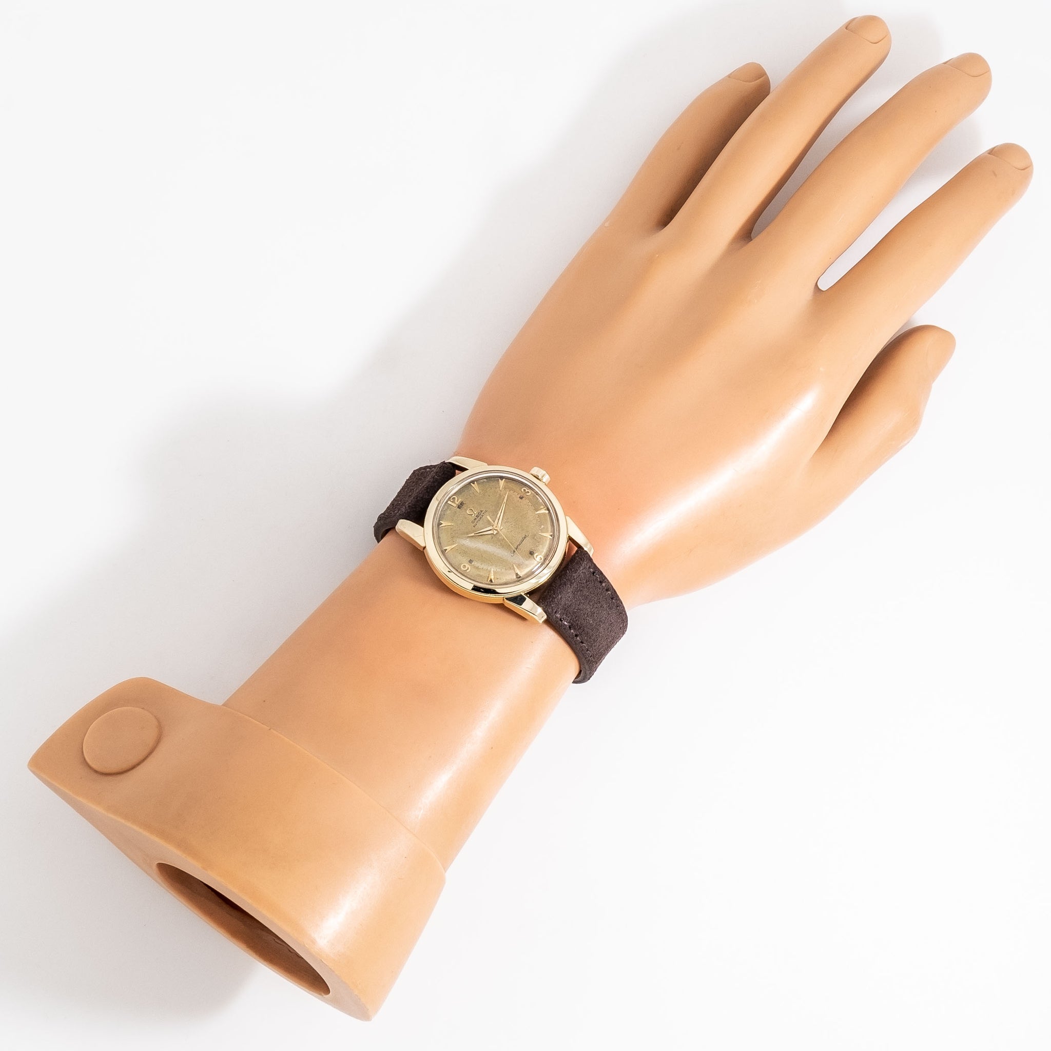 Original Genuine Omega Dial, Applied 12, 3, 6, 9, Yellow Gold Colored Arabic Numerals, Applied Yellow Gold Colored Pointed Hour Markers with Aged Luminous Plots |