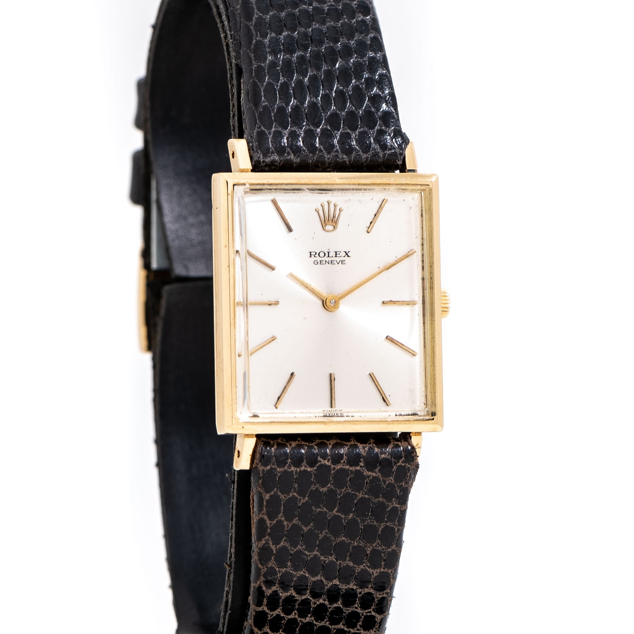 1966 Vintage Rolex Cellini Ref. 1298 in Solid 18k Yellow Gold. Features an all Original Silver Dial in Good Condition with Applied Yellow Gold Colored Stick Hour Markers, an Applied Yellow Gold Colored Rolex Emblem at the 12 o'clock Clock Position, and Yellow Gold Colored Stick Hands. Comes on a 17mm Genuine Leather Lizard Grain Black Colored Strap. Powered by a a 19 Jewel Caliber 1600 Manual Winding Movement. Triple Signed. Swiss Made.