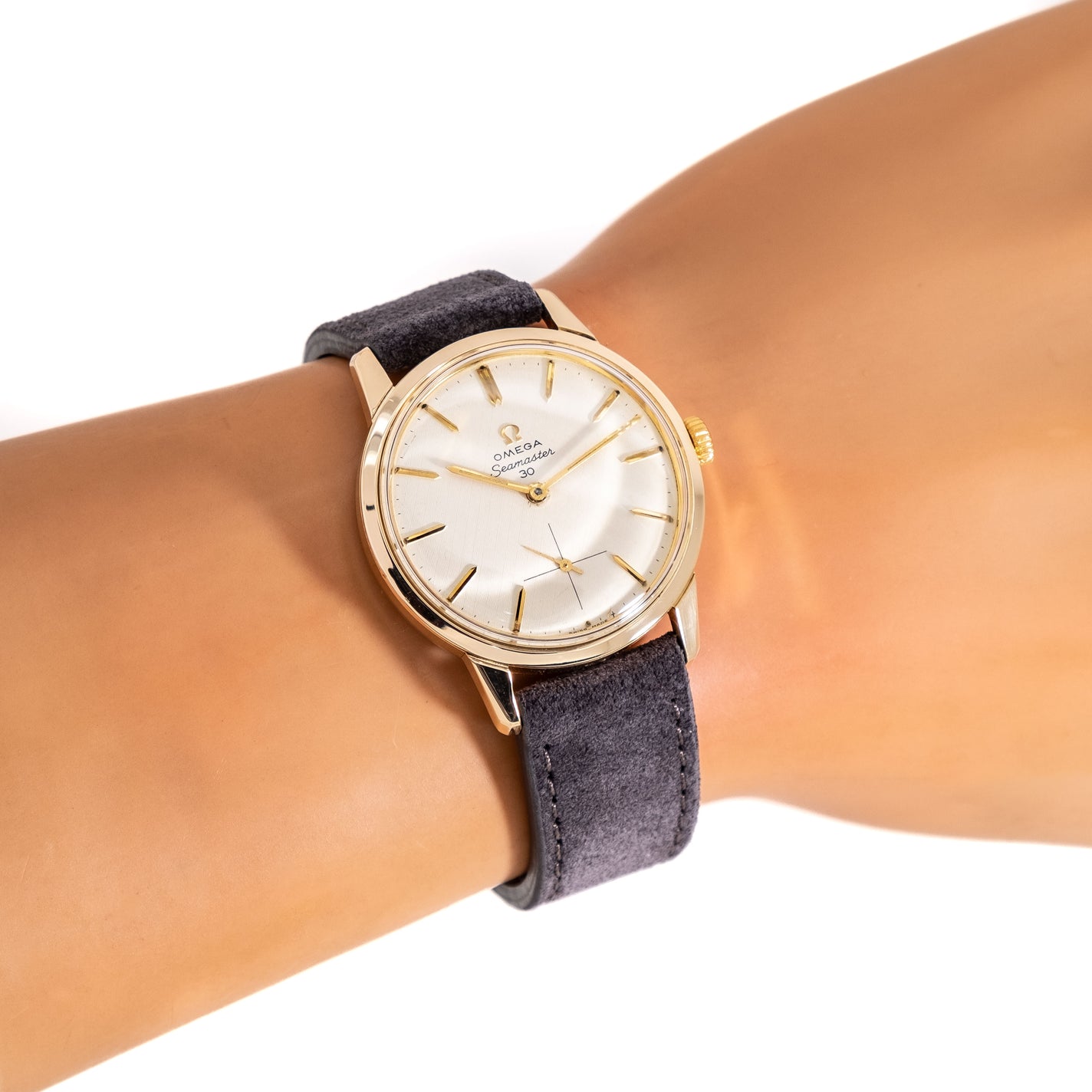 1964 Vintage Omega Seamaster 30 Ref. 125.007-63 18k Yellow Gold with Stainless Steel Case Back Watch. Features an all Original Warm Aged Dial with a Fine Textured Waffle / Guilloche Dial with Applied Yellow Gold Colored Pointed Hour Markers, a Sub Seconds Dial at the 6 o Clock Position, a Black Colored Minute Track, and Yellow Gold Colored Stick Hands. Comes on an 18mm Genuine Suede Leather Grey Colored Strap. Powered by a 17 Jewel Caliber 269 Manual Winding Movement. Triple Signed. Swiss Made.