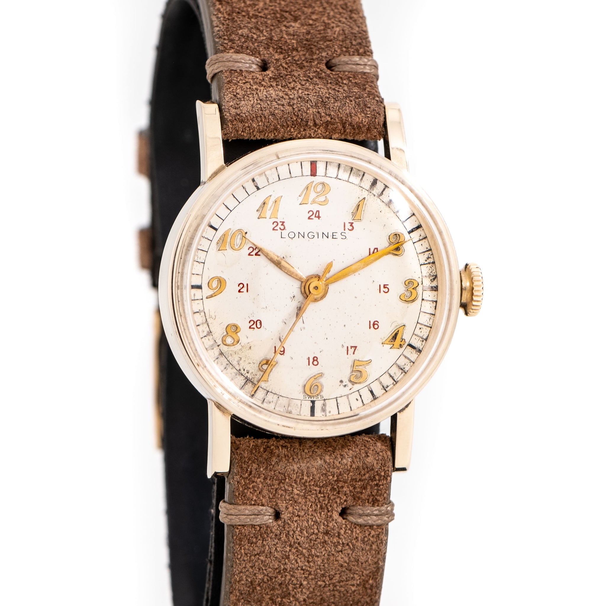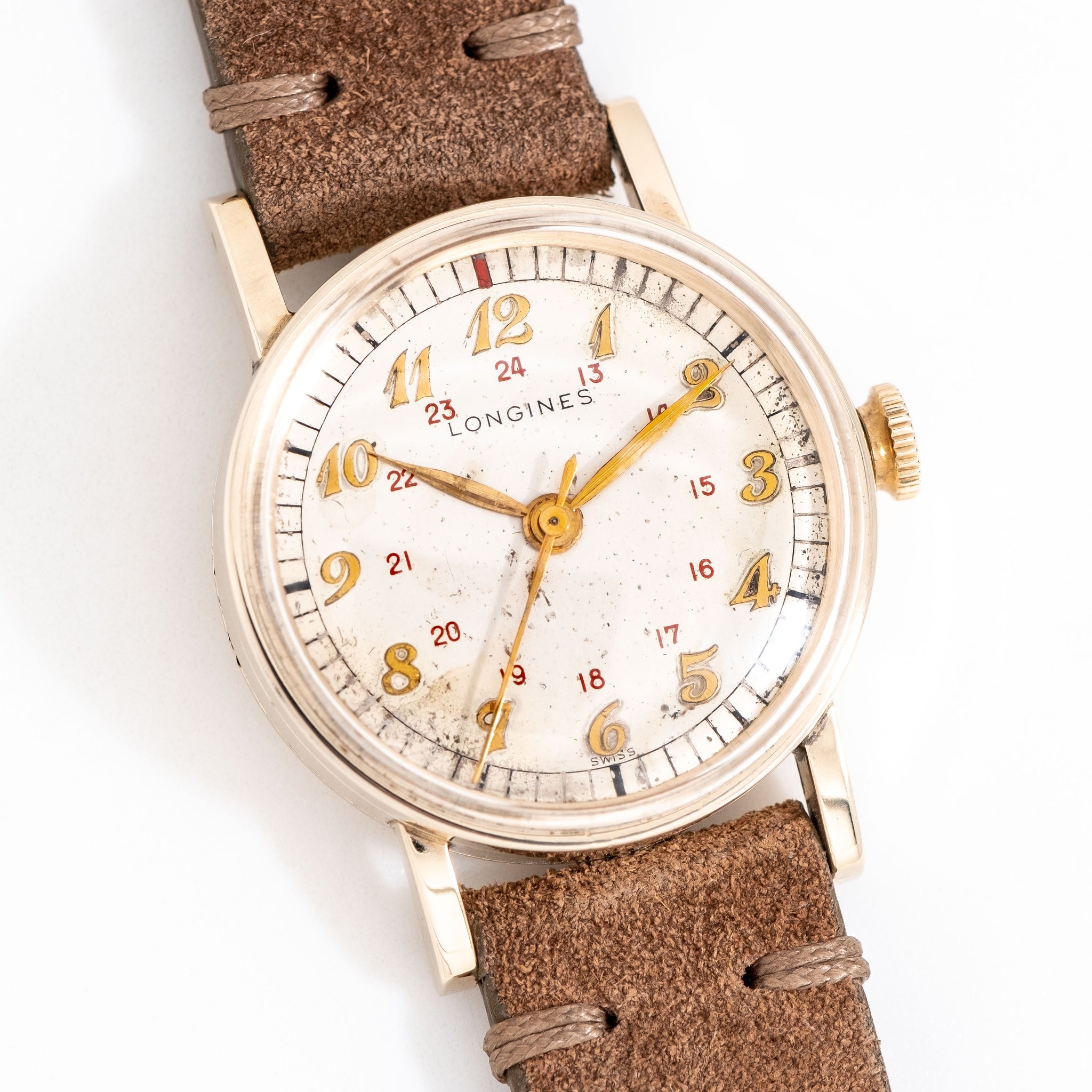 1950 Vintage Longines Military Style 10k Yellow Gold Filled Watch. Features an all Original Warm Aged Silver Dial with Aged Patina, Applied Yellow Gold Colored Breguet Numerals, Printed Red Colored 24 Hour Arabic Numerals, a Black Colored Minute Track, and Yellow Gold Colored Leaf Hands. Comes on a 17mm Genuine Suede Leather Brown Colored Strap. Powered by a 17 Jewel Caliber 12L Manual Winding Movement. Triple Signed. Swiss Made.