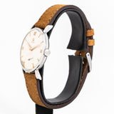 1954 Vintage Omega Ref. 2705-1 Manual Wind Stainless Steel Watch. Features an all Original Silver Dial with Aged Patina, Applied Rose Gold Colored Arabic Numerals & Pointed Arrow Markers, Rose Gold Colored Dauphine Hands with No Luminous, and a Sub Seconds Dial at the 6 o Clock Position. Comes on an 18mm Genuine Suede Leather Brown Colored Strap. Powered by a 17 Jewel Caliber 266 Manual Winding Movement. Triple Signed. Swiss Made.
