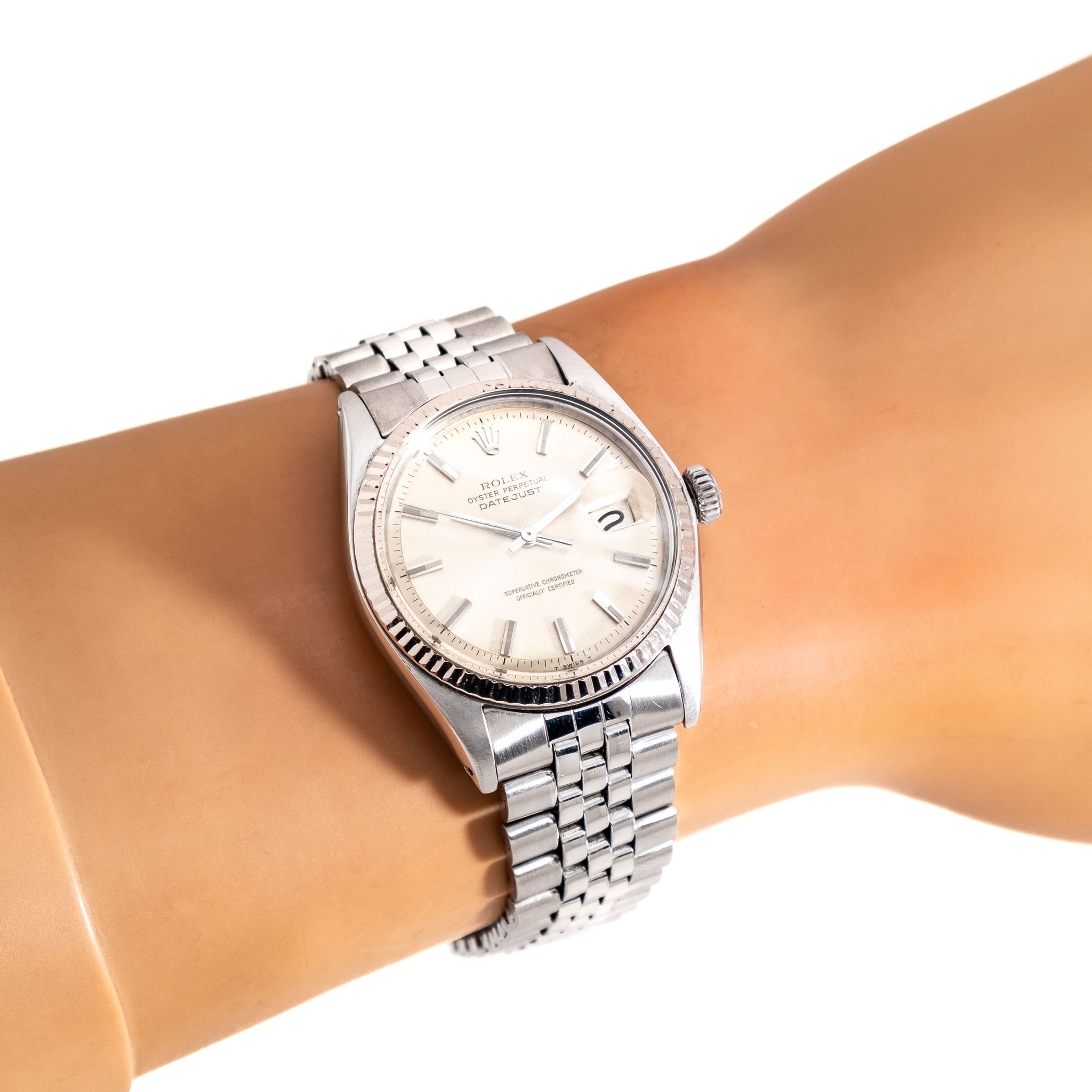 1968 Vintage Rolex Datejust Ref. 1601 in 14k White Gold Fluted Bezel & Stainless Steel. Features an all Original Warm Aged Silver Dial in Good Condition with Slight Patina, Applied Faceted Steel Bar Hour Markers, a Date Window at the 3 o Clock Position, and Steel Baton Hands. Comes on a Genuine Rolex 20mm Stainless Steel Jubilee Bracelet, Will Fit up to an 8 Inch Wrist. Powered by a 26 Jewel Caliber 1570 Automatic Winding Movement. Triple Signed. Swiss Made.