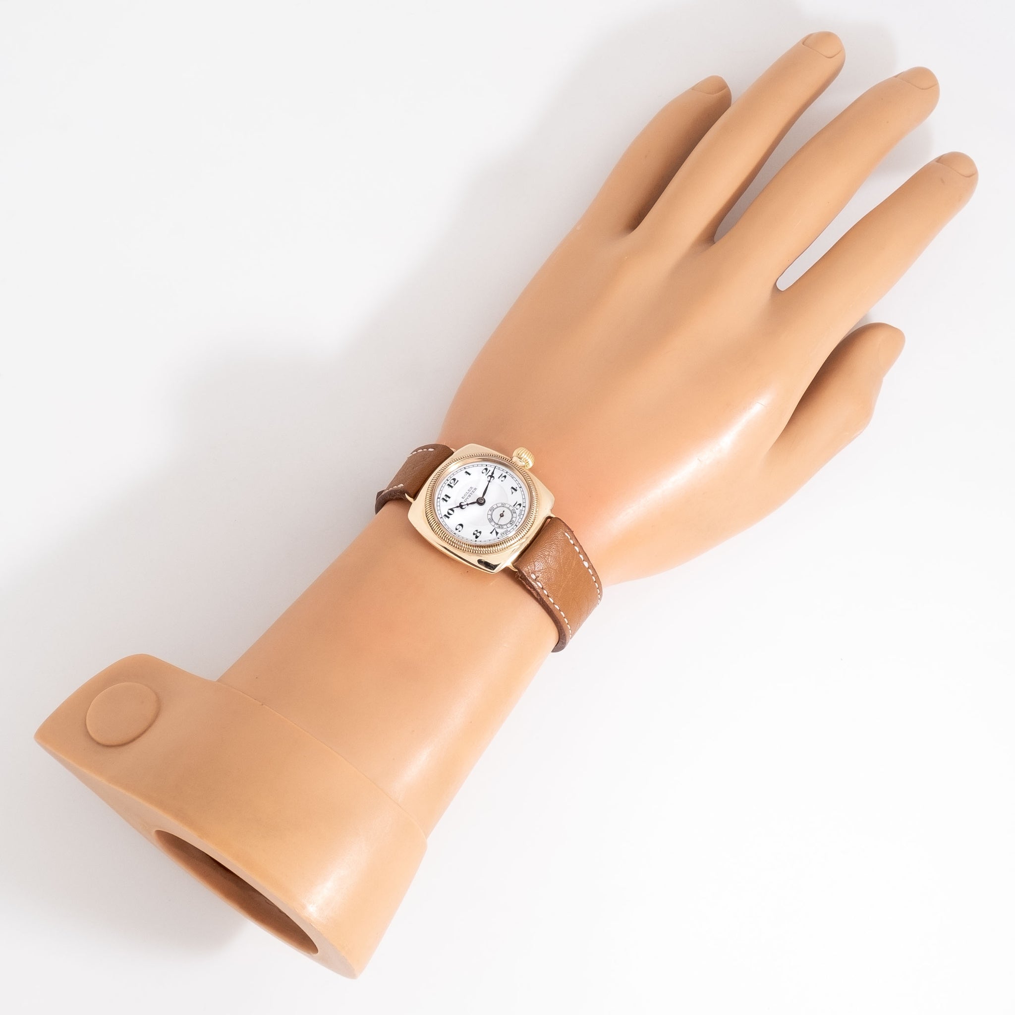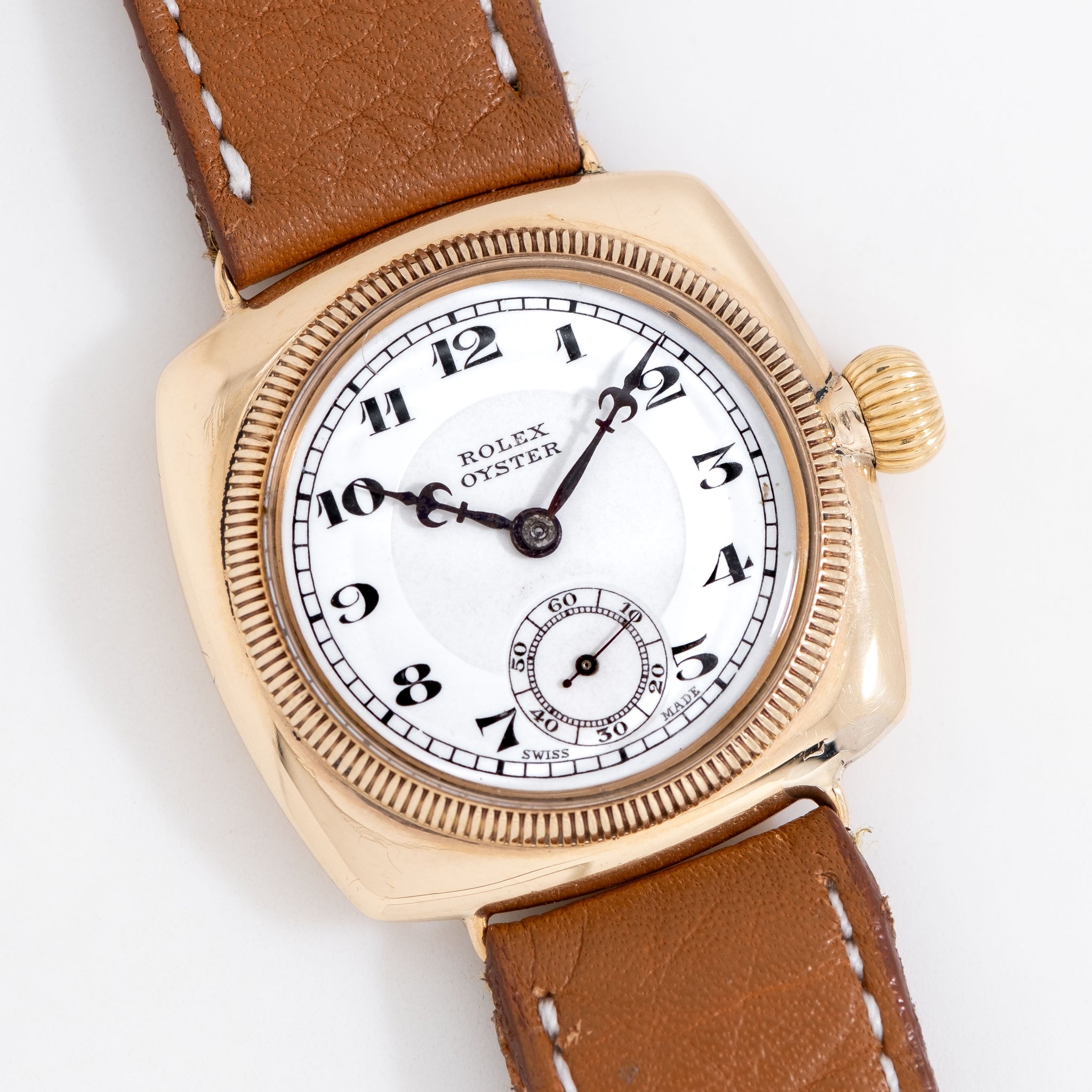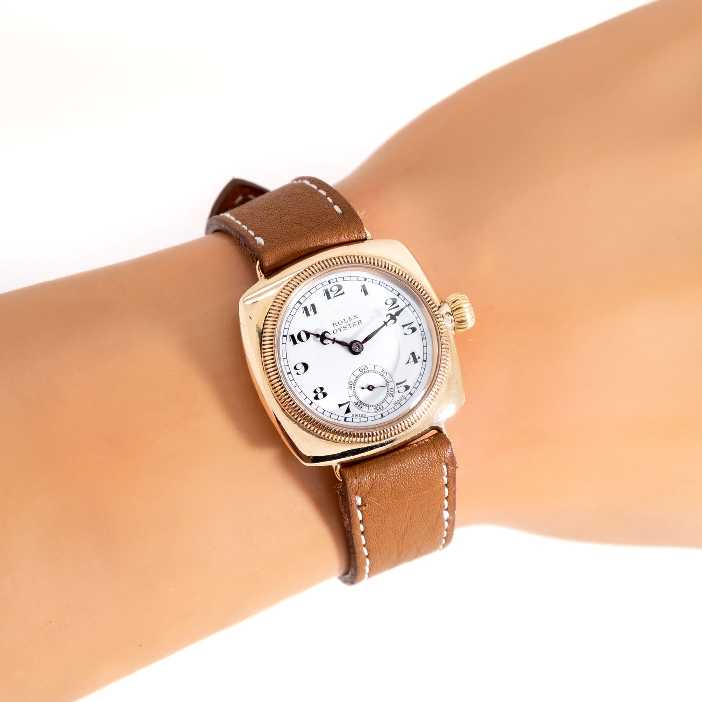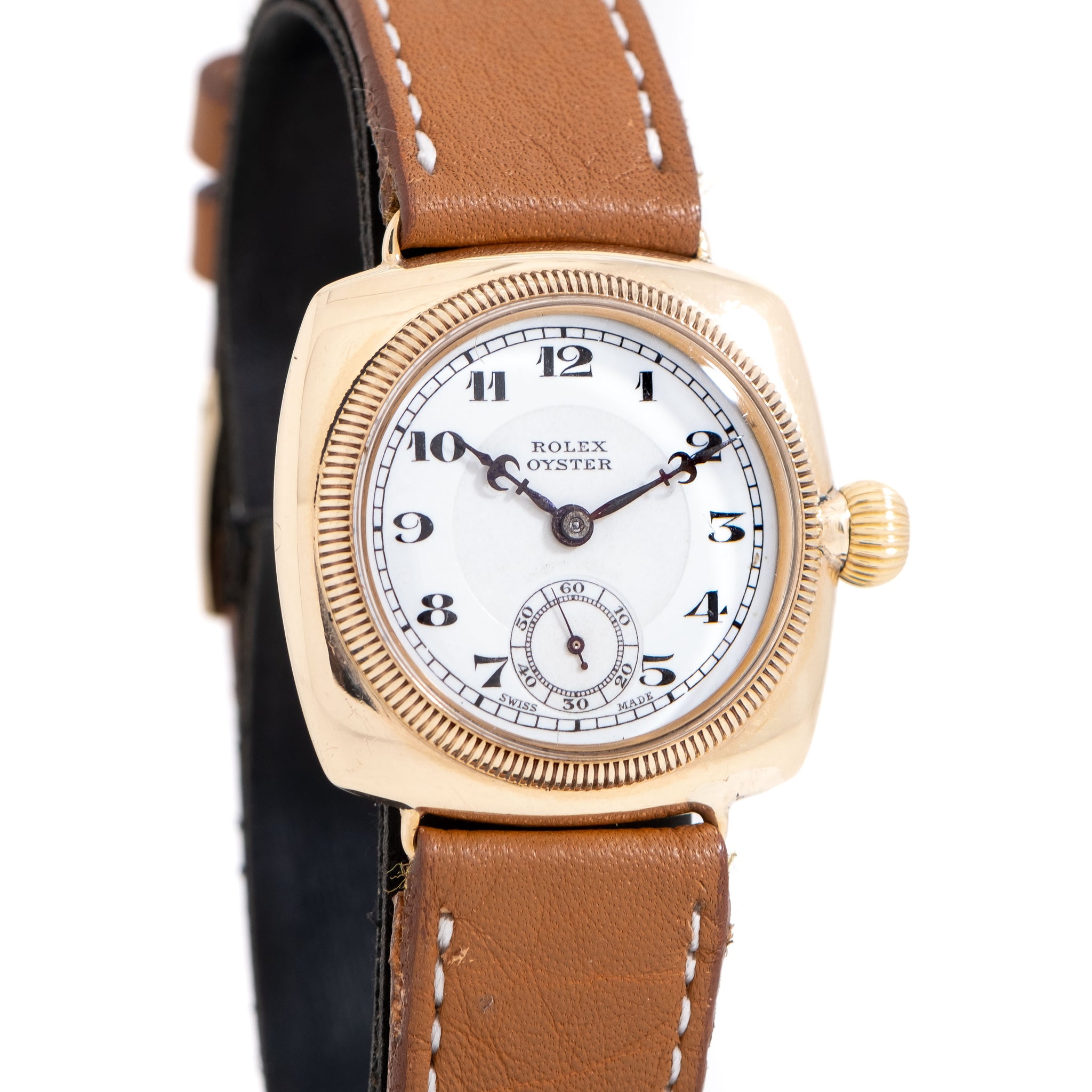 1920's Vintage Rolex Oyster 9k Yellow Gold Watch. Features an al Original Porcelain Dial in Excellent Condition with Printed Black Colored Breguet Numerals, a Sub Seconds Dial at the 6 o Clock Position, and Blued Steel Cathedral Hands. Comes on a 16mm Genuine Leather Fold Over Brown Colored Strap with a Newer Rolex Buckle. Powered by a 15 Jewel Rolex Caliber 10 1/2 H Manual Winding Movement. Triple Signed. Swiss Made.