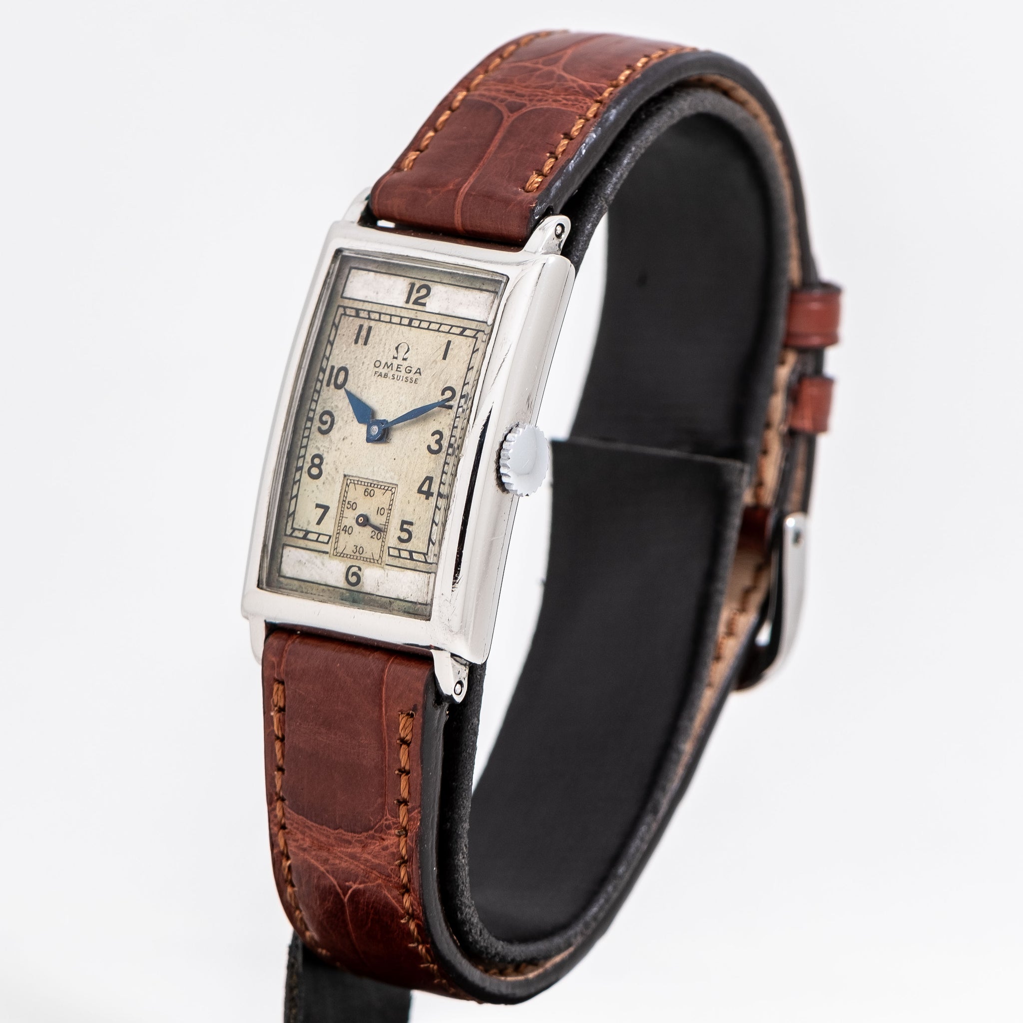 1934 Vintage Omega Rectangular T17 Stainless Steel Watch. Features an all Original Aged Silver Dial with Beautifully Aged Patina, Printed Black Colored Arabic Numerals, Sub Seconds Dial at the 6 o Clock Position, and Blued Steel Lance Hands. Comes on a 16mm Genuine Alligator Brown Colored Strap. Powered by a 15 Jewel Caliber T17 Manual Winding Movement. Triple Signed. Swiss Made.