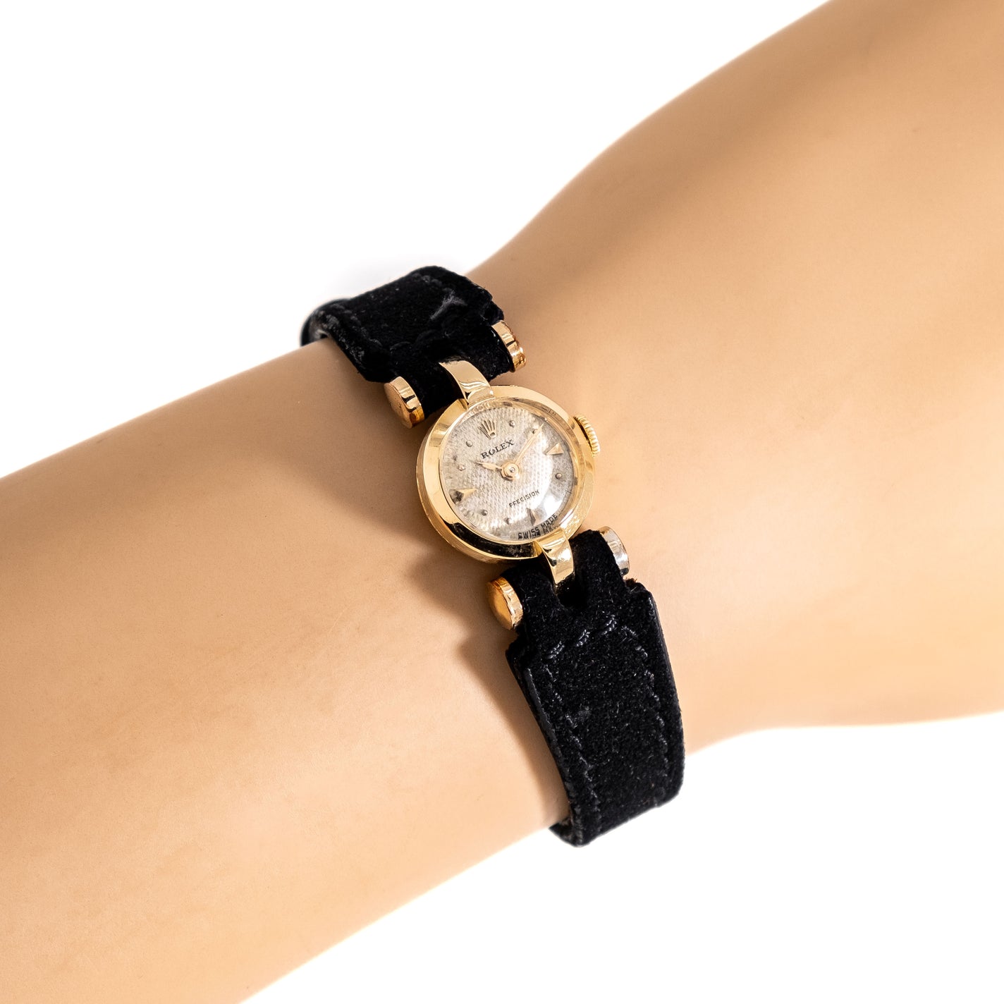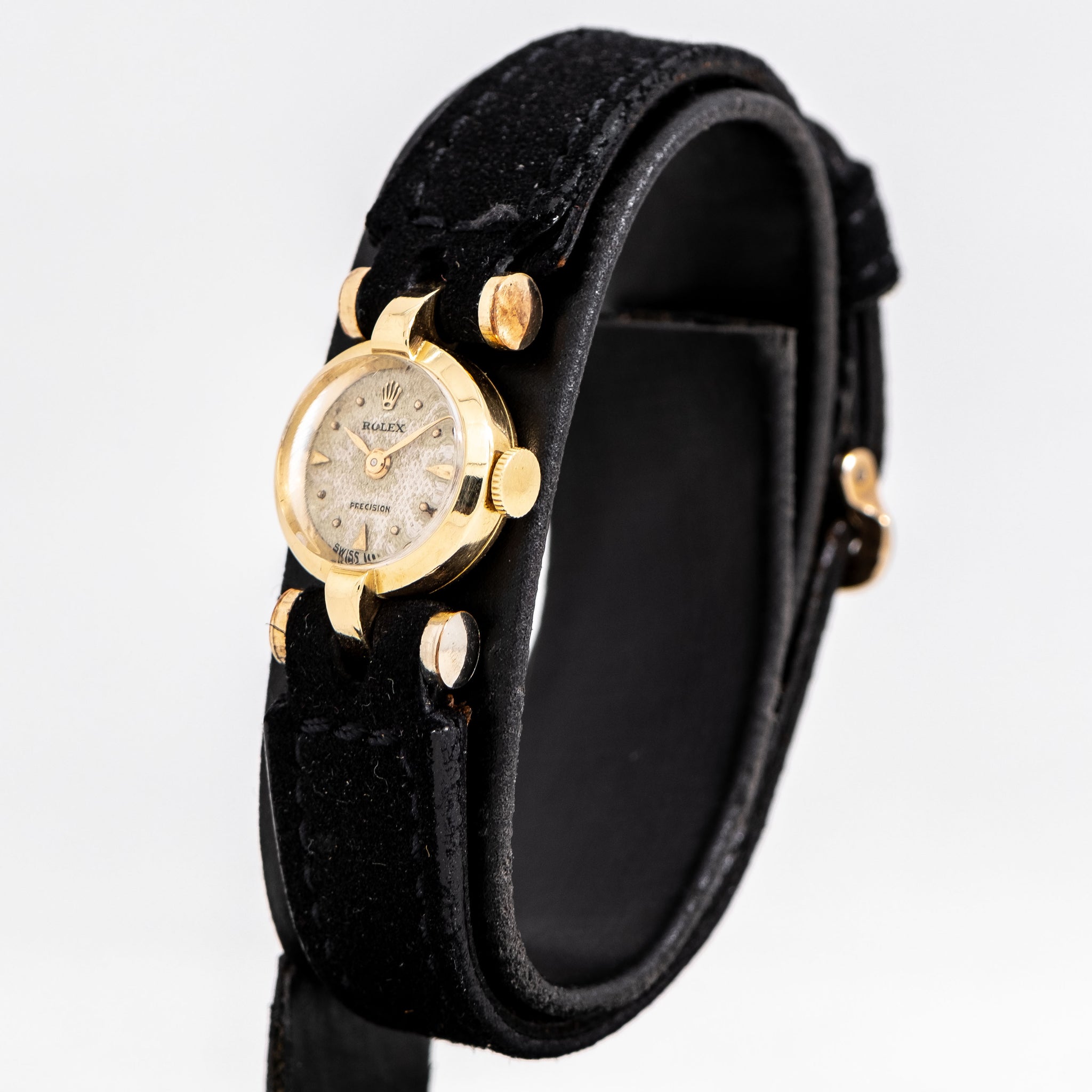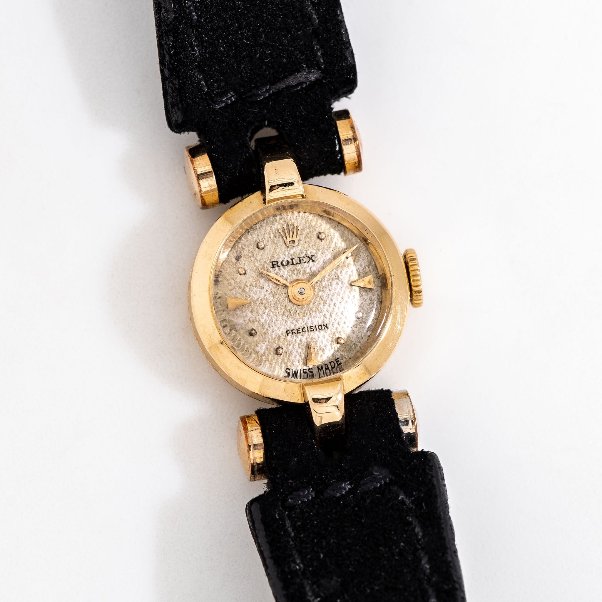 1950's Vintage Ladies Rolex Precision "Waffle" Textured Dial Ref. 8106 Solid 18k Yellow Gold Watch. Features an all Original Waffle Textured Warm Aged Silver Dial with Patina, Applied Yellow Gold Colored Triangle Markers, Applied Yellow Gold Colored Rolex Emblem, and Yellow Gold Colored Leaf Hands. Comes on a Genuine Suede Leather Black Colored Strap. Powered by a 17 Jewel Caliber 280 Manual Winding Movement. Triple Signed. Swiss Made.