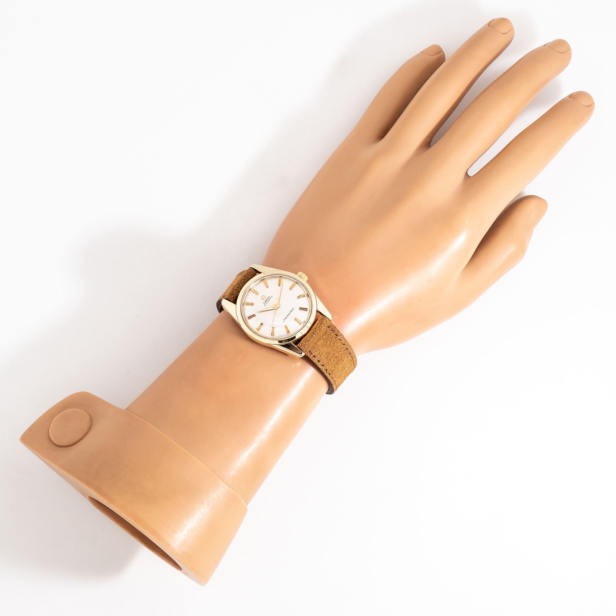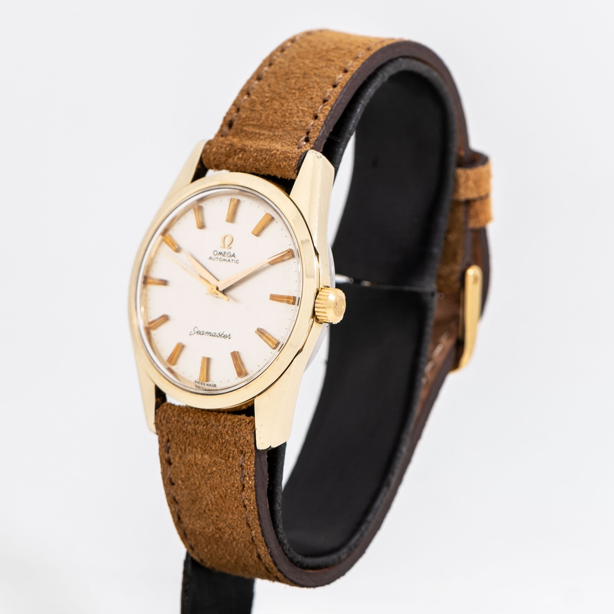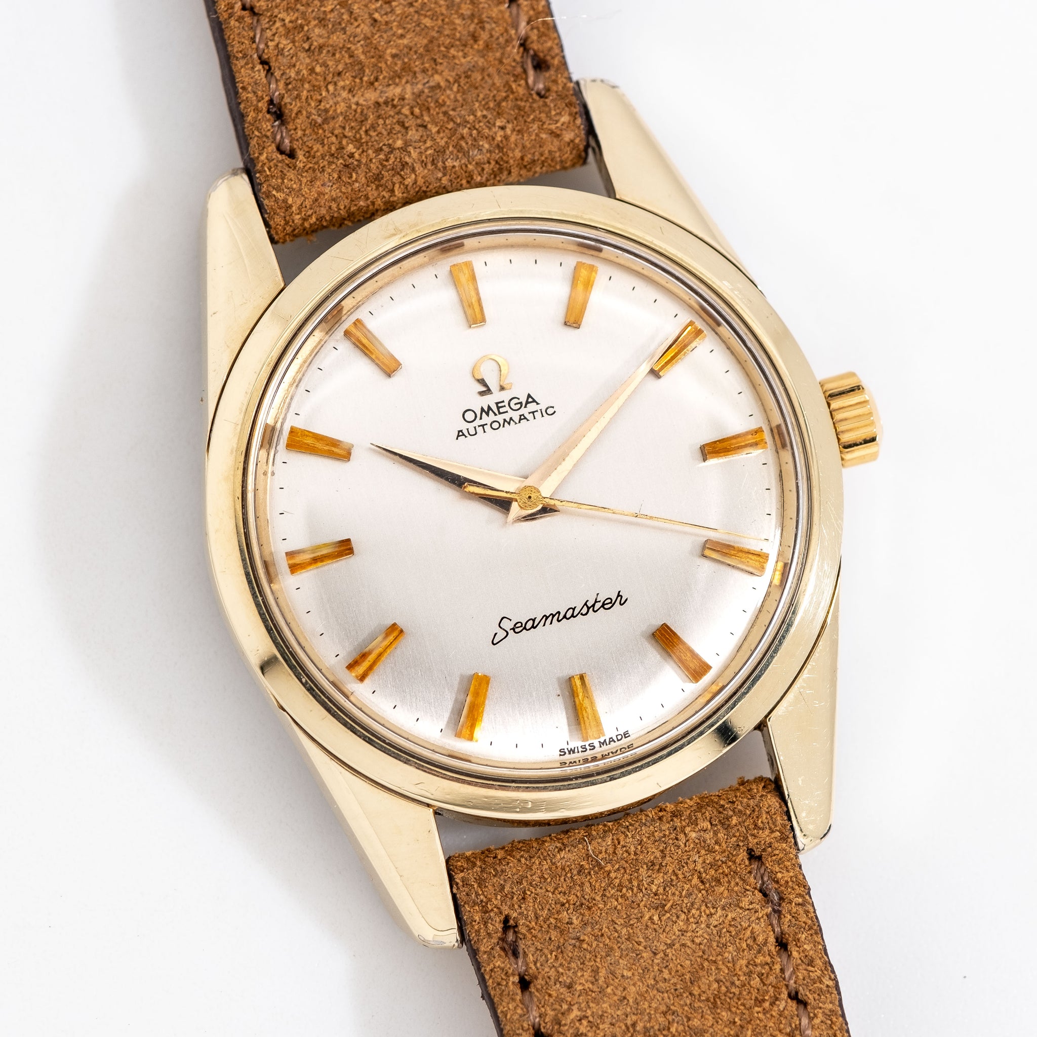 1961 Vintage Omega Seamaster Ref. 14700 61 SC 14k Yellow Gold Shell/Cap Stainless Steel Watch. Features an all Original Omega No Lume Silver Dial in Very Good Condition, Applied Yellow Gold Colored Faceted & Tapered Bar Markers, an Applied Yellow Gold Colored Omega Emblem, and Yellow Gold Colored Dauphine Hands with No Luminous. Comes on a 18mm Genuine Suede Leather Brown Colored Strap. Powered by a 24 Jewel Caliber 552 Automatic Winding Movement. Triple Signed. Swiss Made.