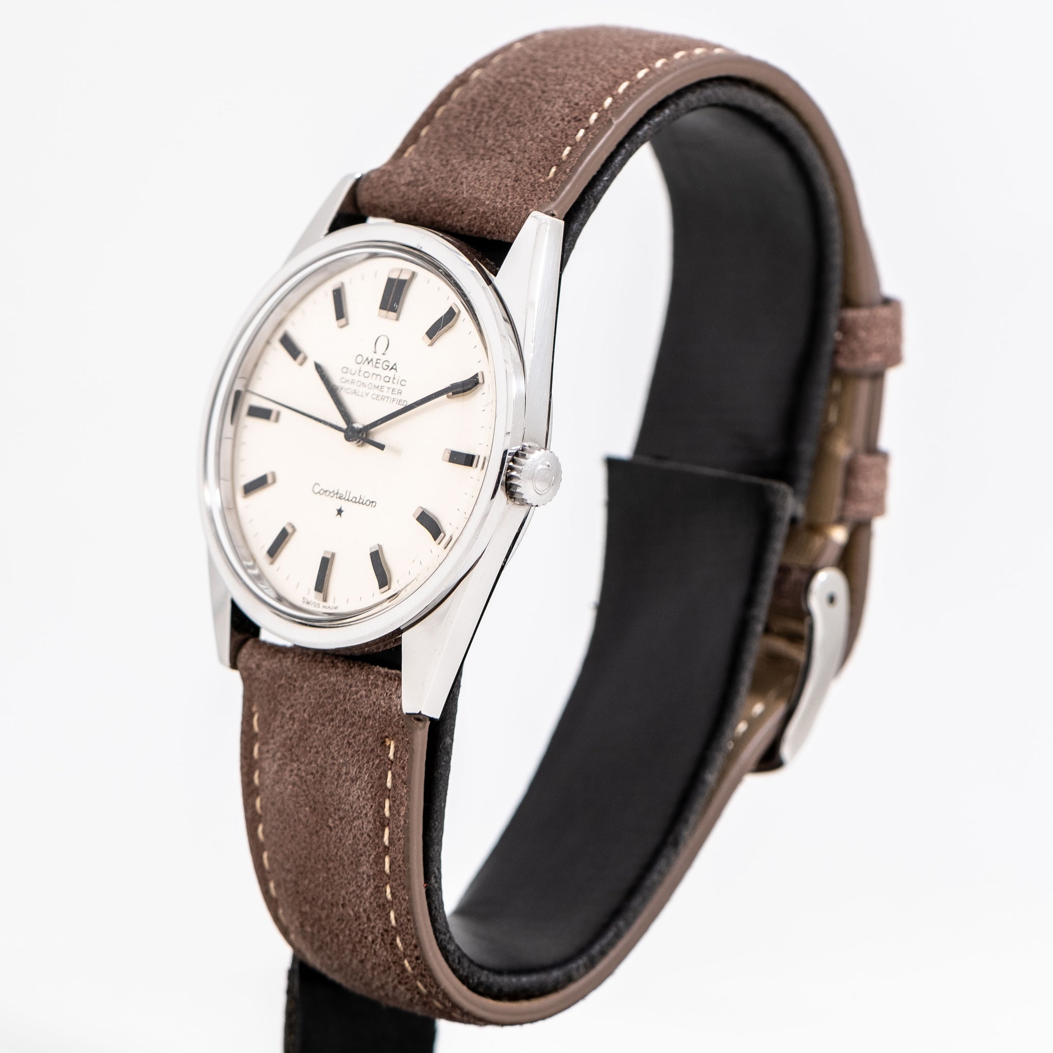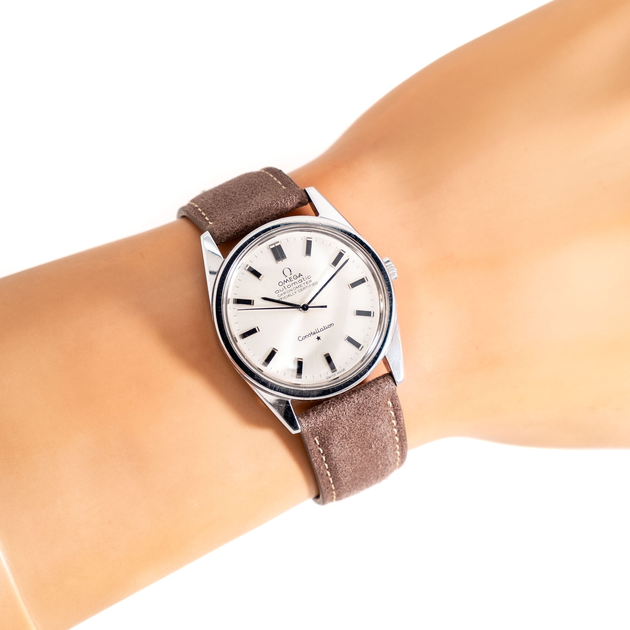 1966 Vintage Omega Constellation Ref. 167.021 Stainless Steel Watch. Features an all Original Silver Dial in Very Good Condition Block Hour Markers with Black Colored Accents with Aged Luminous Plots and Black Colored Stick Hands. Comes on a 19mm Genuine Suede Leather Taupe / Brown Colored Strap. Powered by a Chronometer Certified 24 Jewel Caliber 712 Automatic Winding Movement. Triple Signed. Swiss Made.