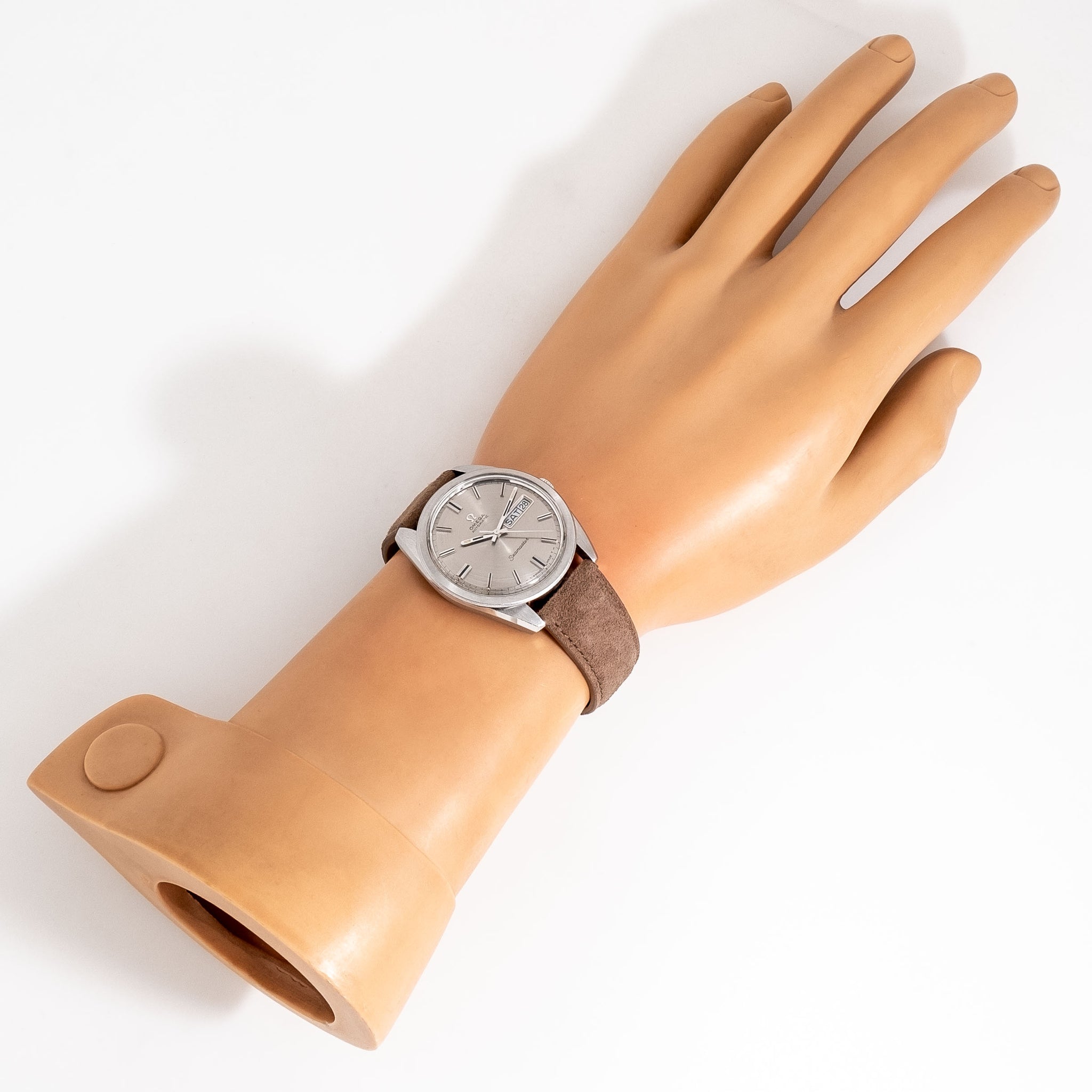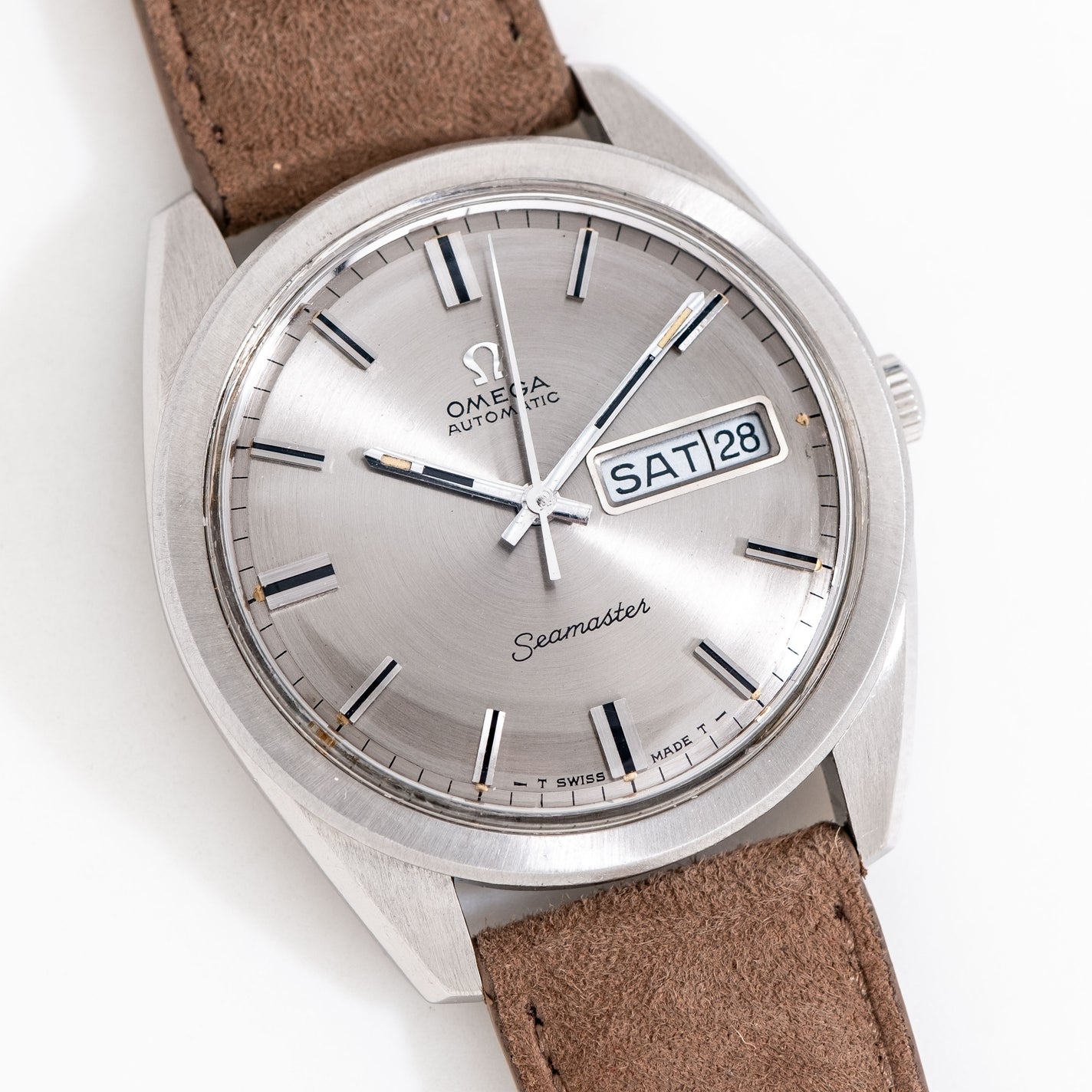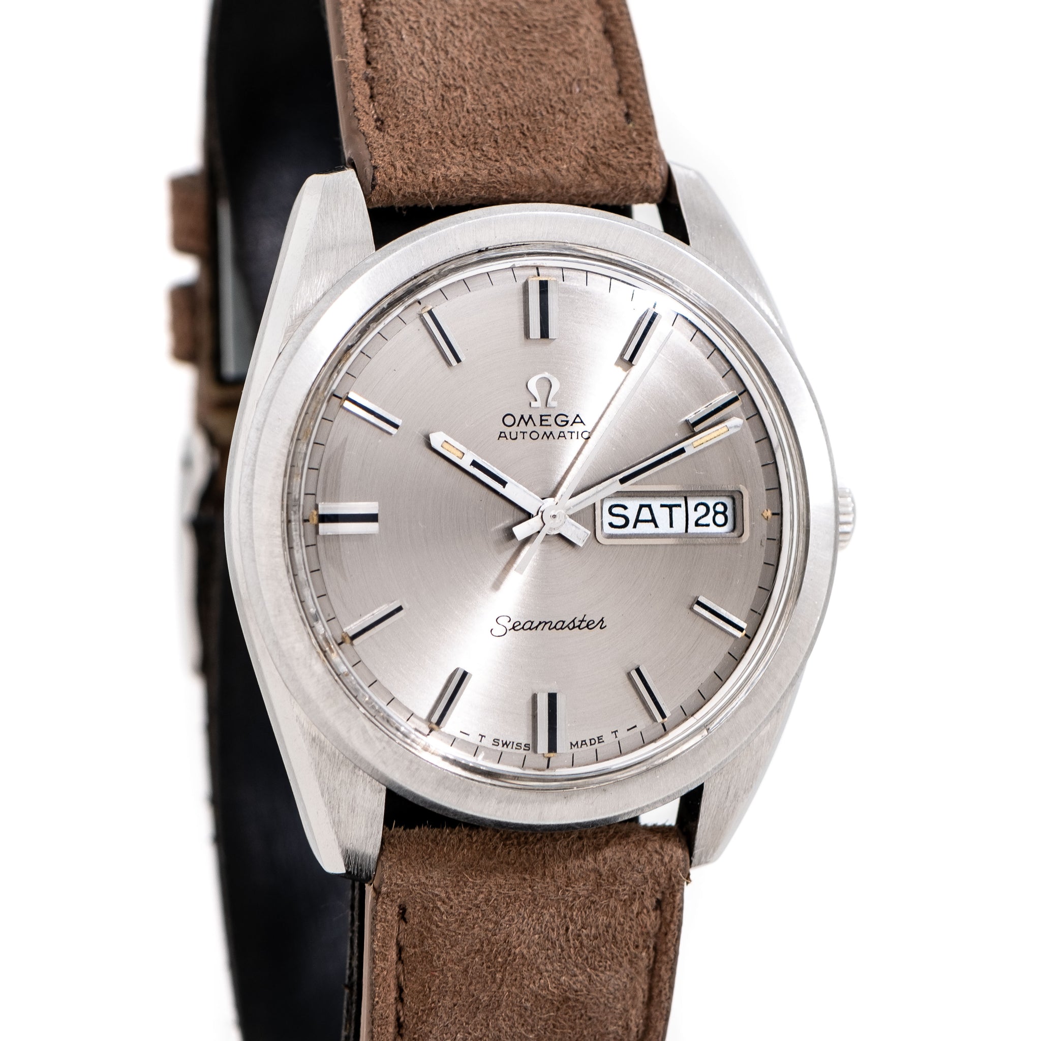 1969 Vintage Omega Seamaster Day Date Ref. 168.023 Stainless Steel Watch. Features an all Original Silver / Grey Colored Dial in Excellent Condition with Applied Steel Bar Hour Markers with Black Colored Inlays, Day Date Window at the 3 o Clock Position, Recessed Black Colored Printed Minute Track, and Steel Baton Hands with Aged Luminous & Black Colored Inlays . Powered by a 17 Jewel Caliber 750 Automatic Winding Movement. Comes on a 19mm Genuine Suede Leather Brown Colored Strap. Triple Signed. Swiss Made.