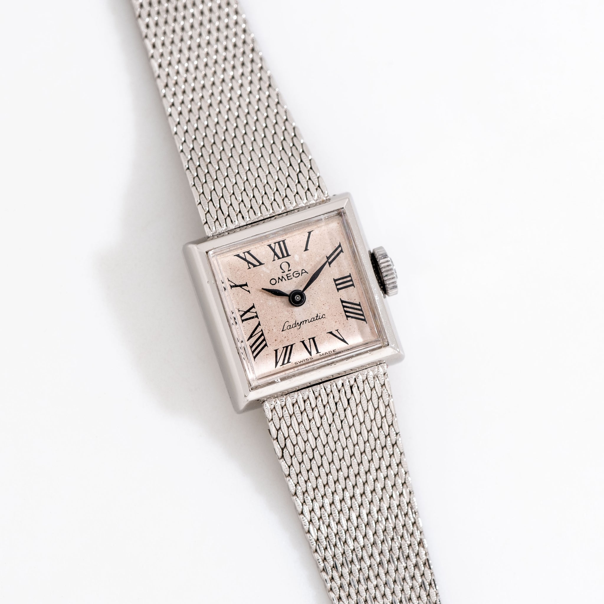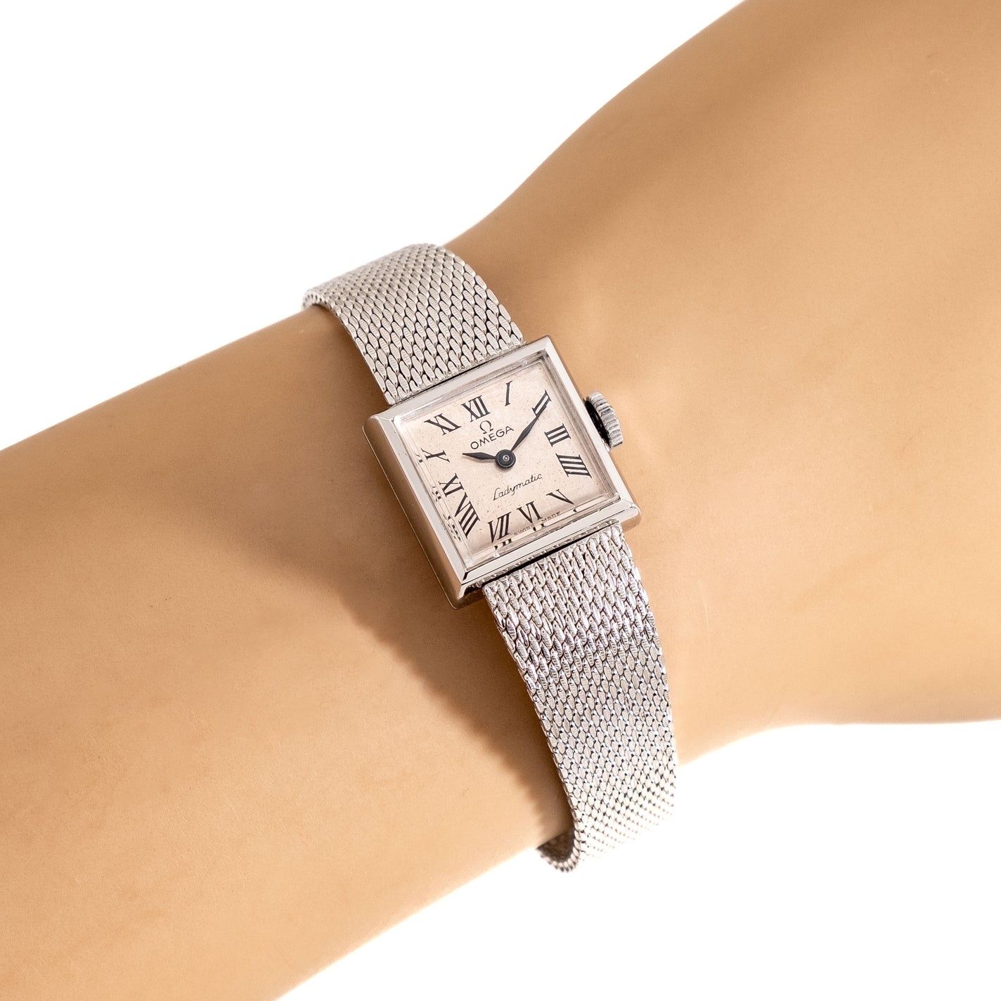 1972 Vintage Ladies Omega Ladymatic Ref. SS-5329 10k White Gold Filled Watch. Features an all Original Warm Aged Silver Dial with Beautifully Aged Patina, Printed Black Colored Roman Numerals, and Black Colored Leaf Hands. Comes on the Original Omega 10k White Gold Filled Adjustable Mesh Bracelet. Powered by a 17 Jewel Caliber 660 Automatic Winding Movement. Triple Signed. Swiss Made.