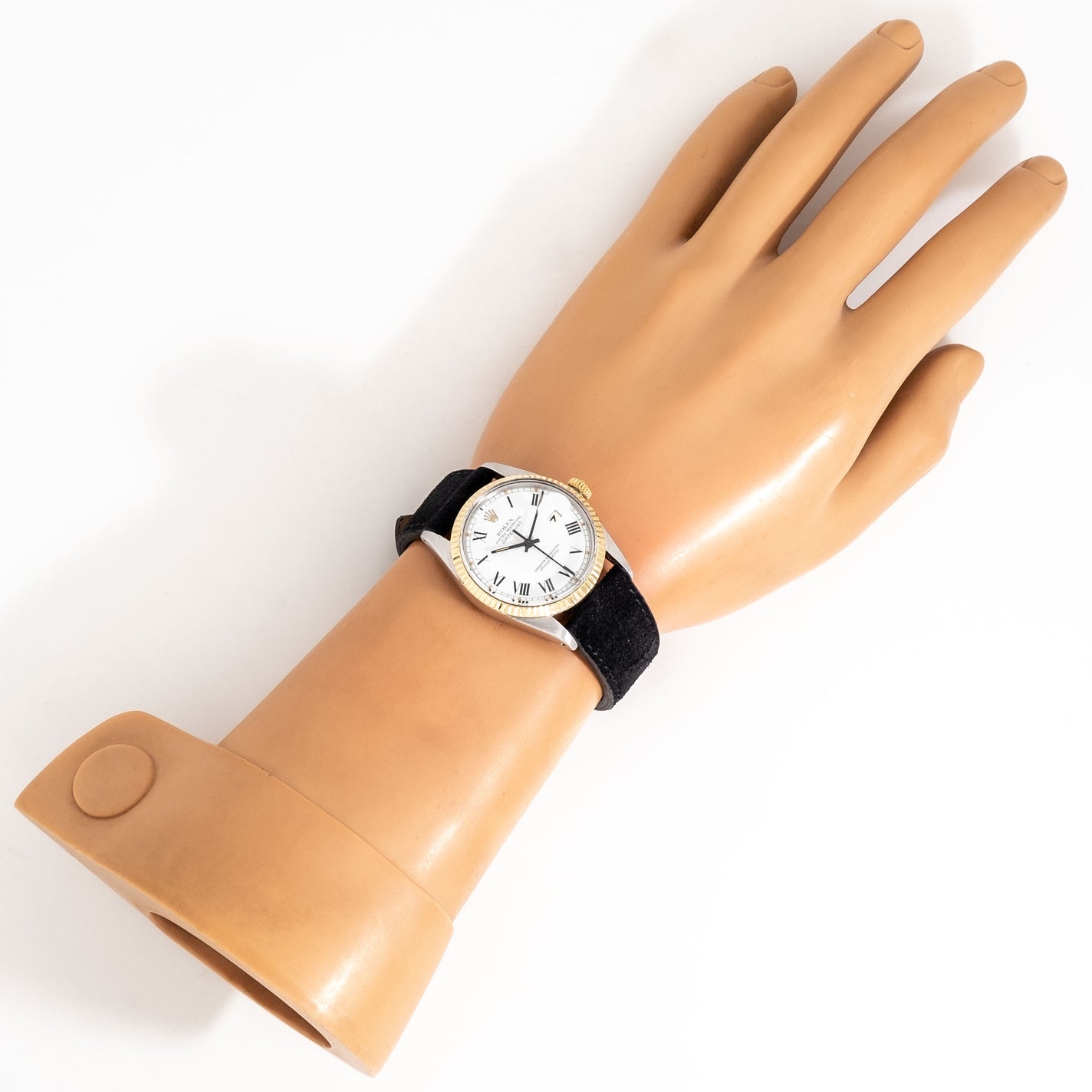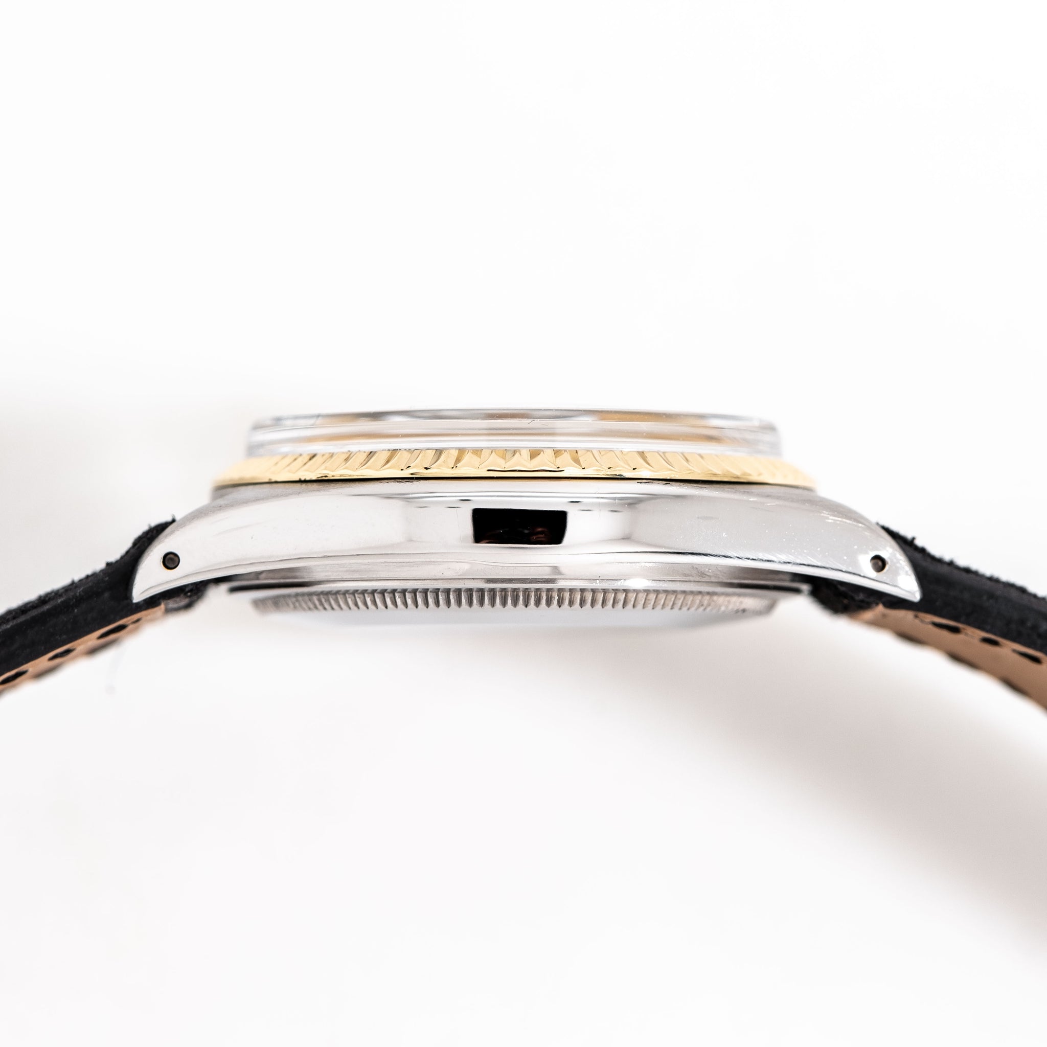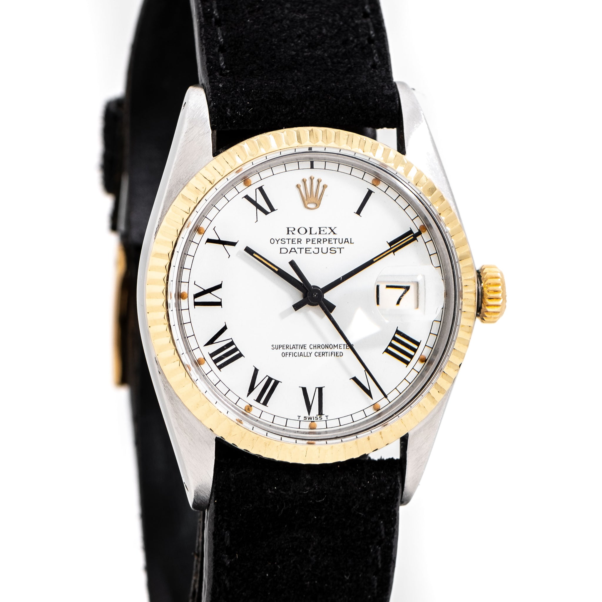 1979 Vintage Rolex Datejust Ref. 16030 "Buckley" Dial 18k Yellow Gold & Stainless Steel Two Tone Watch. Features an all Original White Colored "Buckley" Dial in Excellent Condition with Printed Black Colored Roman Numerals with Mint Pumpkin Colored Lume Plots, and Black Colored Baton Hands with Pumpkin Colored Luminous. Comes on a 20mm Genuine Suede Leather Black Colored Strap. Powered by a 27 Jewel Caliber 3035 Automatic Winding Movement. Triple Signed. Swiss Made.