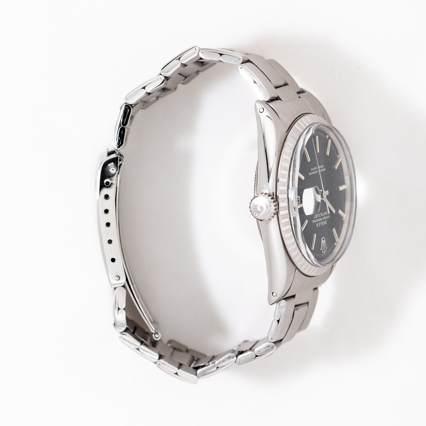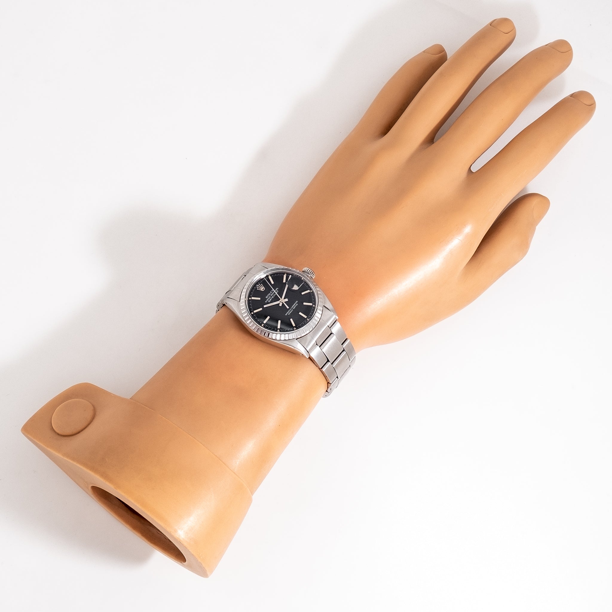 | Dial | Original Rolex Black Dial, Applied Steel Bar Hour Markers with white Colored Accents & Warm Aged Luminous Plots, Date Window at the 3 o Clock Position, White Colored Text |