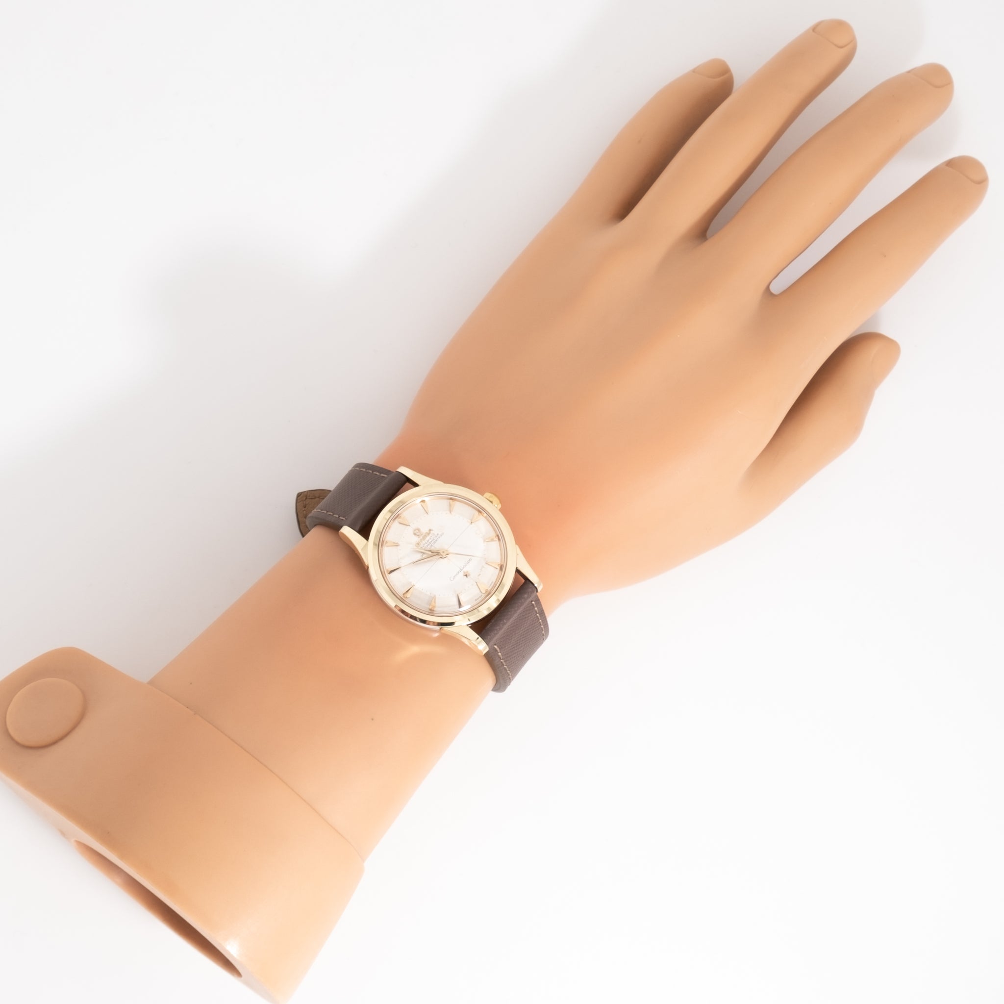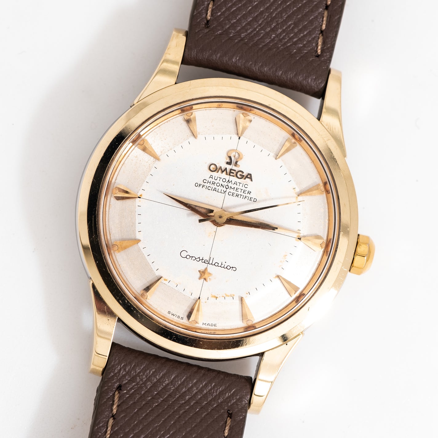 1958 Vintage Omega Constellation Reference 2852-16SC "Pie Pan" Dial in 14k Yellow Gold Cap over Stainless Steel. Features an all Original Genuine Omega Silver Pie "Pan Dial" with Subtle Warm Patina in Great Condition, applied Yellow Gold Colored Beveled Arrow Markers, and Yellow Gold Dauphine Hands with Luminous. Comes on a 18mm new 100% Genuine "Saffiano" Style Leather Brown Colored Strap. Powered by a 24 Jewel Caliber 505 Automatic Winding Movement, Tested in 5 Positions. Triple Signed. Swiss Made.