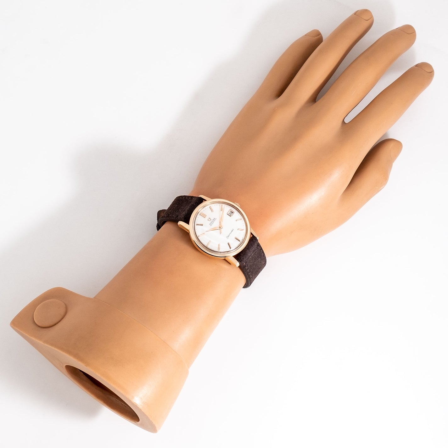 Original Omega Dial, Applied Rose Gold Colored Bar Hour Markers, Date Window at the 3 o Clock Position, Applied Rose Gold Colored Omega Emblem at the 12 o Clock Position |