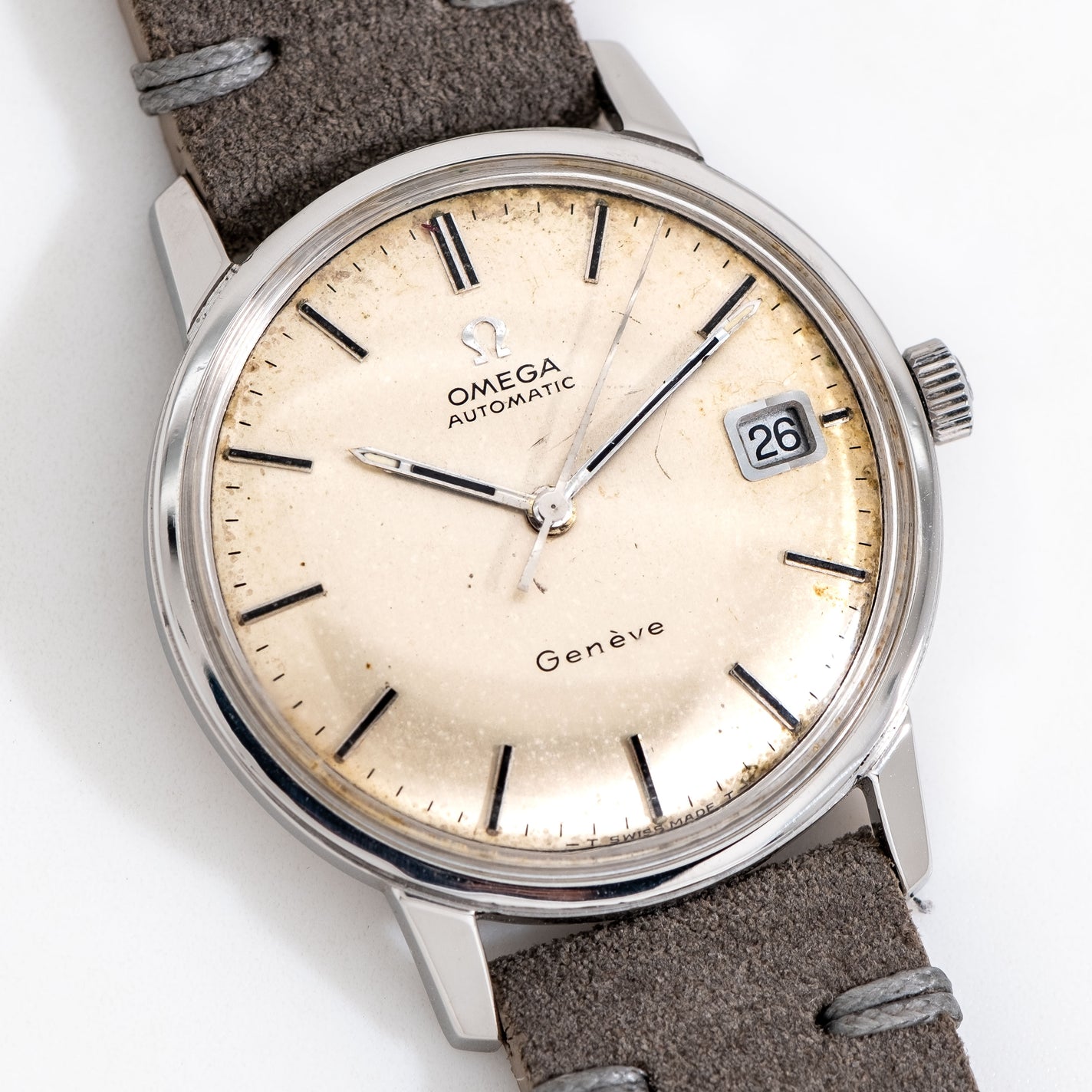 Original Omega Dial, Applied Steel Pointed Stick Markers with Aged Luminous Plots, Date Window at the 3 o Clock Position |