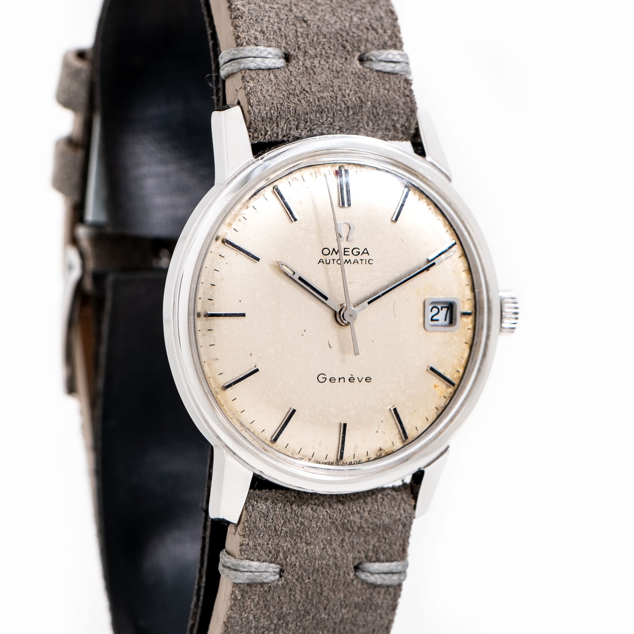 1968 Vintage Omega Seamaster Date Automatic Ref. 166.002 in Stainless Steel. Features an all Original Silver Dial with Aged Speckled Patina, Applied Steel Pointed Stick Hour Markers with Luminous Plots, Steel Stick Hands with Luminous, and a Date Window at the 3 o Clock Position. Comes on an 18mm New 100% Genuine Suede Leather Grey Colored Strap. Powered by a 24 Jewel Caliber 565 Automatic Winding Movement. Triple Signed. Swiss Made.