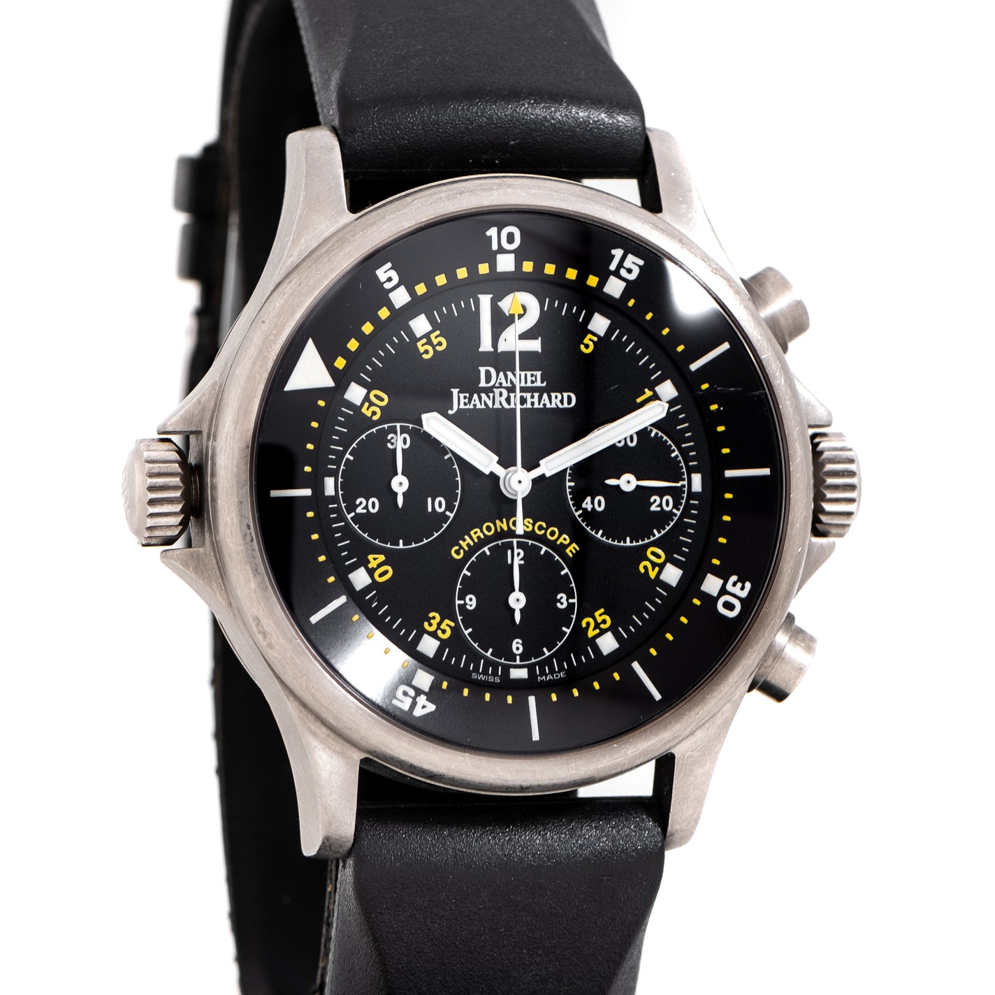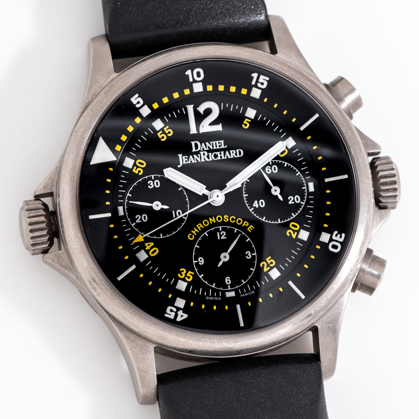 2000's Daniel JeanRichard Chronoscope Ref. 25020 Automatic Titanium Watch. Features an all Original Black Colored Dial in Excellent Condition with Printed White Colored Block Hour Markers, Printed White Colored Oversized 12 Arabic Numerals, Three Register Chronograph Sub Dials, Rotating Numerated Inner Bezel Controlled by the Crown on Left side of Case, and White Colored Index Hands with Luminous. Comes on a 22mm Original JeanRichard Rubber Strap with the Original Buckle. Powered by a an ETA 2824-2 Caliber, 51 Jewel Automatic Winding Movement. Triple Signed. Swiss Made.