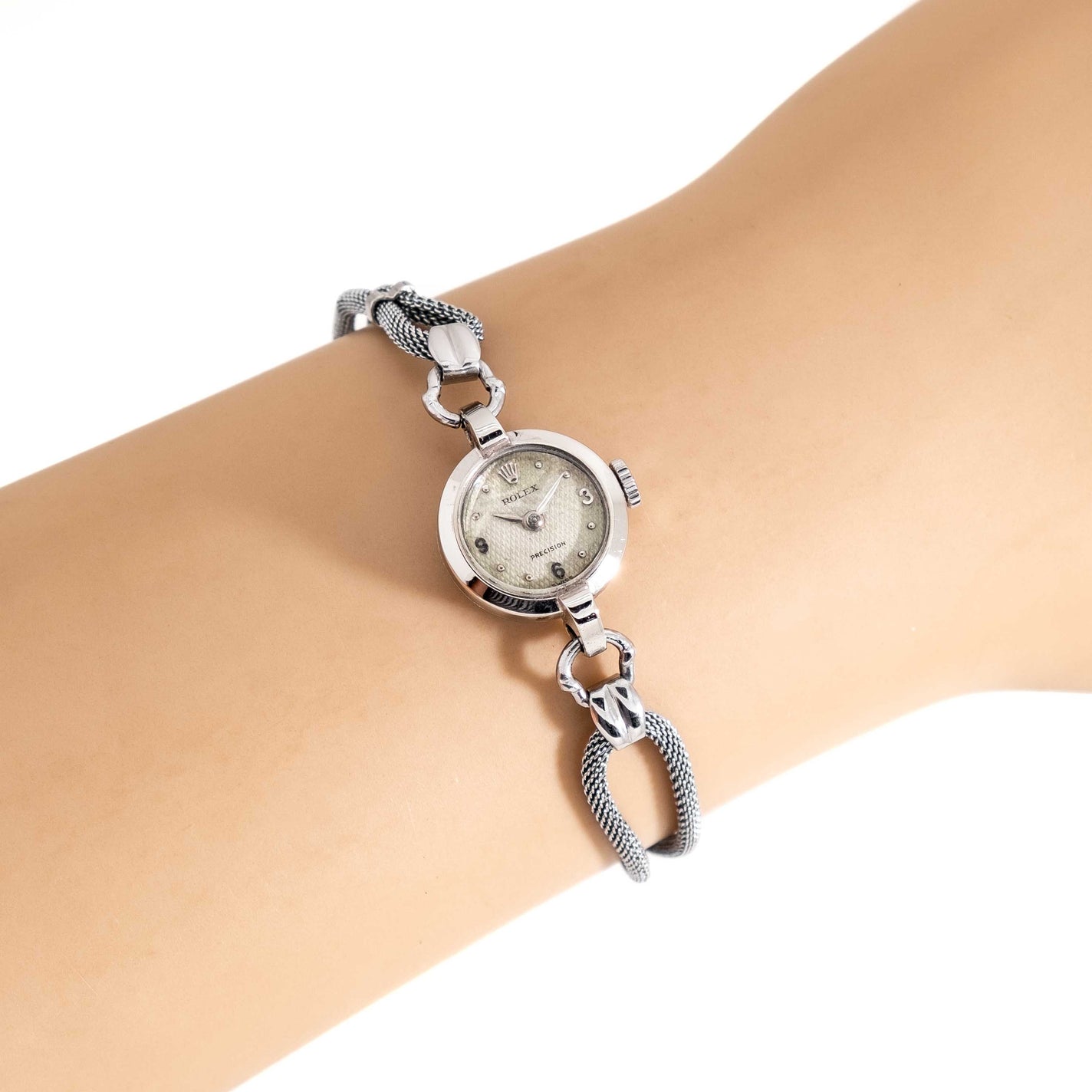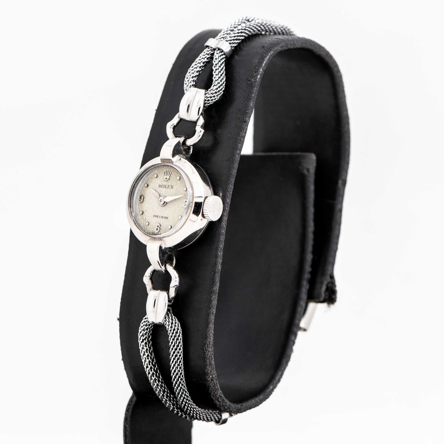 1940's Vintage Ladies Rolex Precision Waffle Dial 10k White Gold Watch. Features an all Original Waffle Textured Aged Silver Dial with Applied Steel 3, 6, 9, Arabic Numerals, Applied Steel Rolex Emblem at the 12 o Clock Position, and Steel Colored Lance Hands. Comes on a Stainless Steel Rope that Will fit up to a 6 1/2 Inch Wrist. Powered by a 17 Jewel Caliber 281 Manual Winding Movement. Triple Signed. Swiss Made.