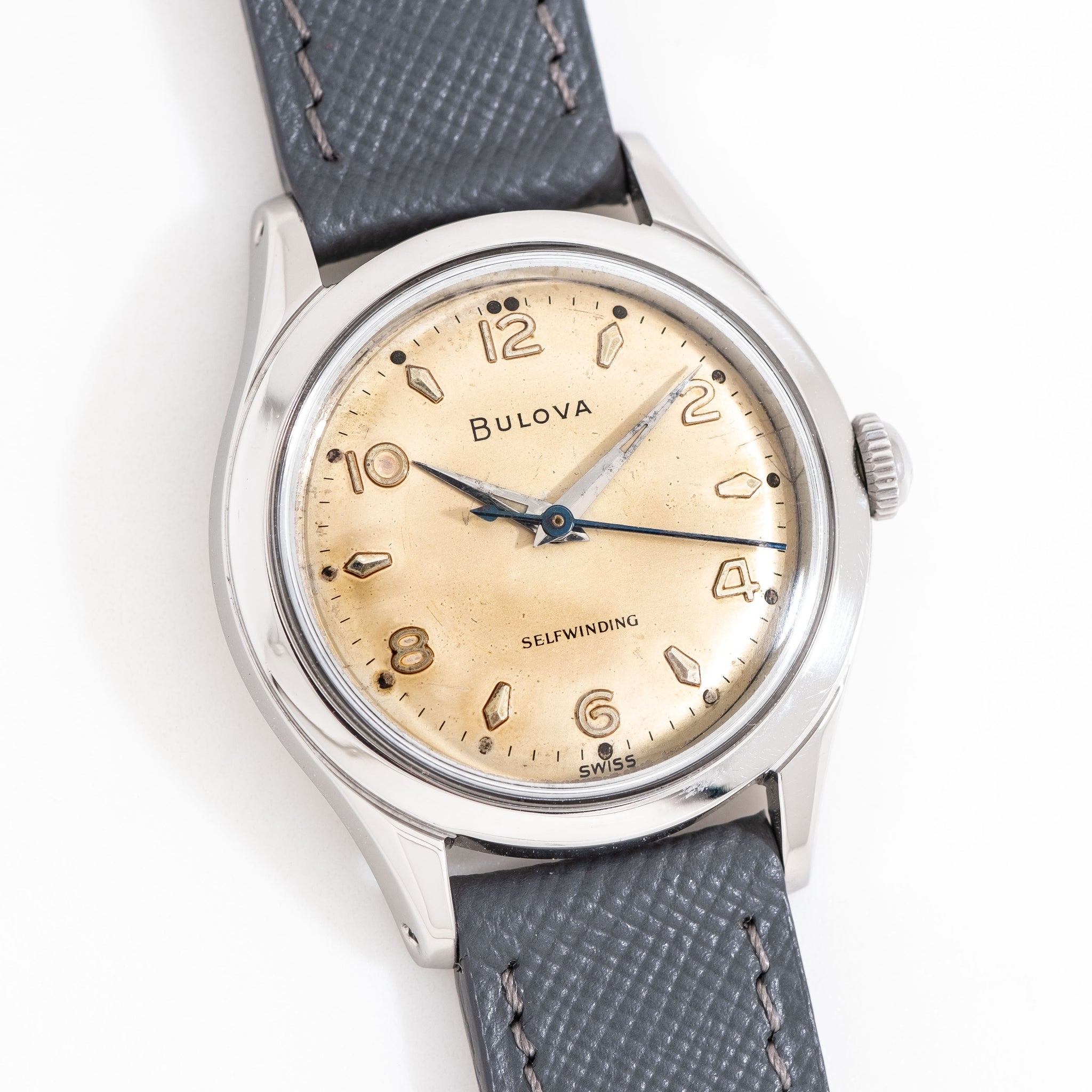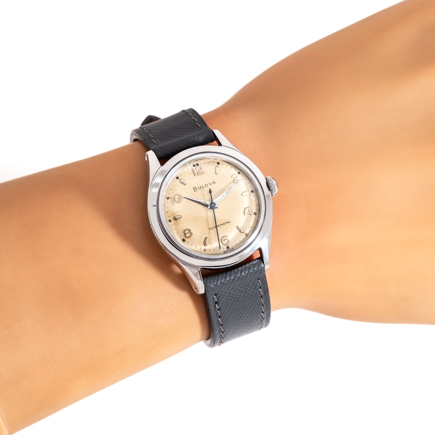 1950's Vintage Automatic Bulova Clamshell Case Stainless Steel Watch. Features an all Original Warm aged Silver Dial with Patina, Applied Steel Colored Arabic Numerals with Dark Aged Luminous Plots, a Printed Black Colored Minute Track, and Steel Colored Dauphine Hands. Comes on a 17mm Genuine "Saffiano" Style Grey Leather Strap. Powered by a 17 Jewel Caliber 10 CBAC Automatic Winding Movement. Triple Singed. Swiss Made.