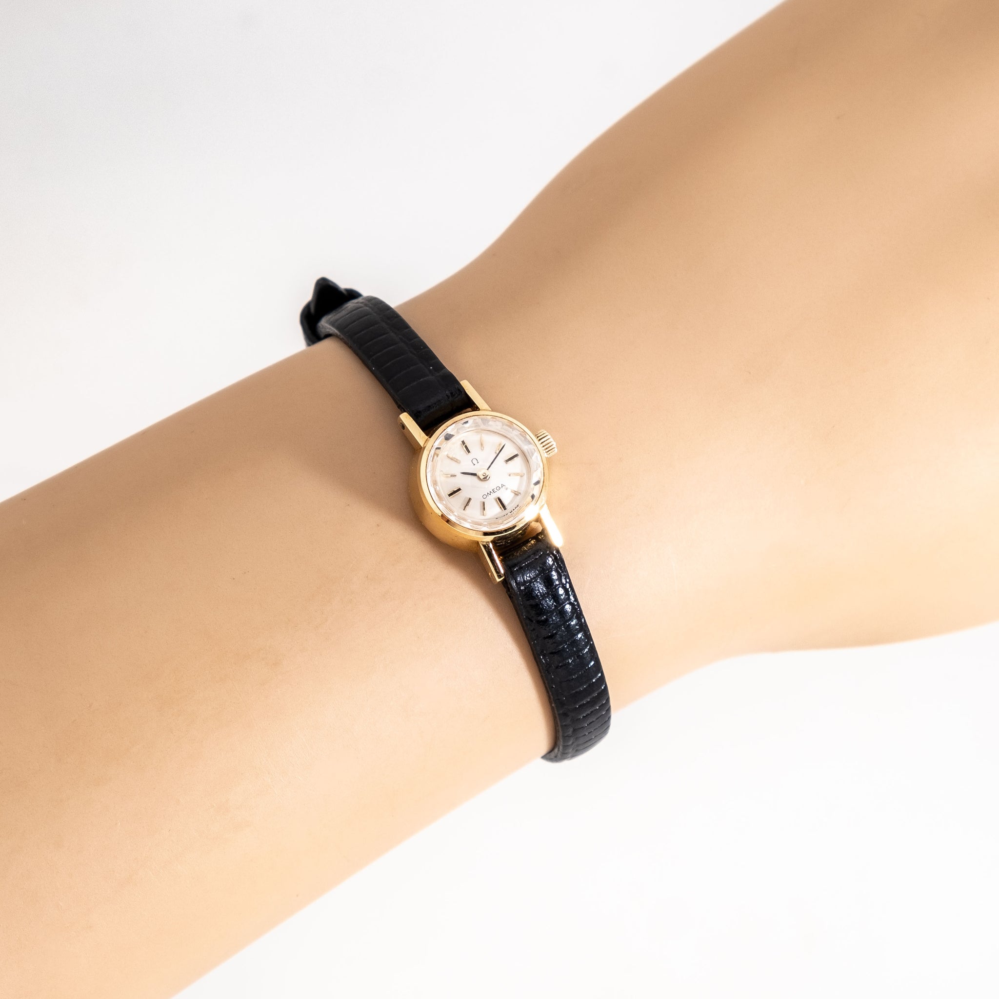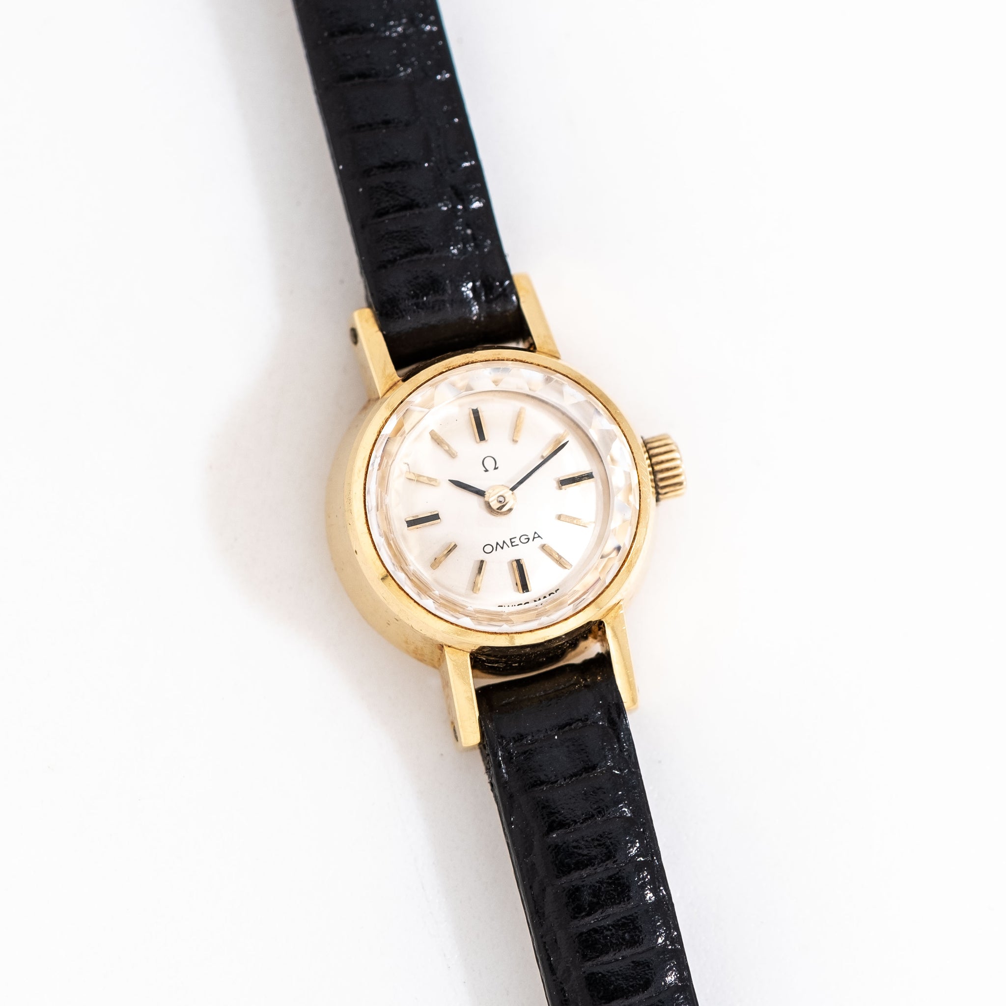1964 Vintage Ladies Omega Solid 18k Yellow Gold Watch. Features an all Original Silver Dial in Very Good Condition with Applied Yellow Gold Colored Stick Hour Markers with Black Colored Accents, a Printed Black Colored Omega Emblem, and Black Colored Stick Hands. Comes on a Genuine Leather Black Colored Strap with an Omega Yellow Gold Plated Buckle. Powered by a 17 Jewel Caliber 650 Manual Winding Movement. Triple Signed. Swiss Made.
