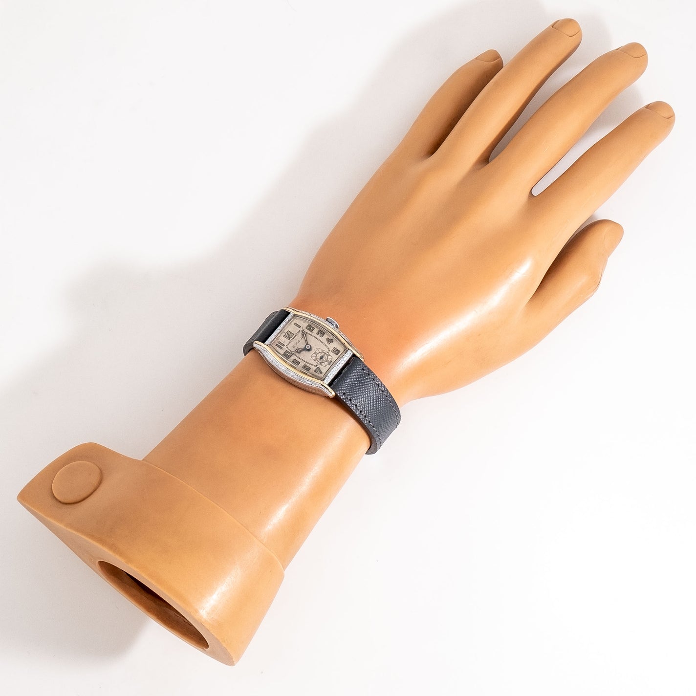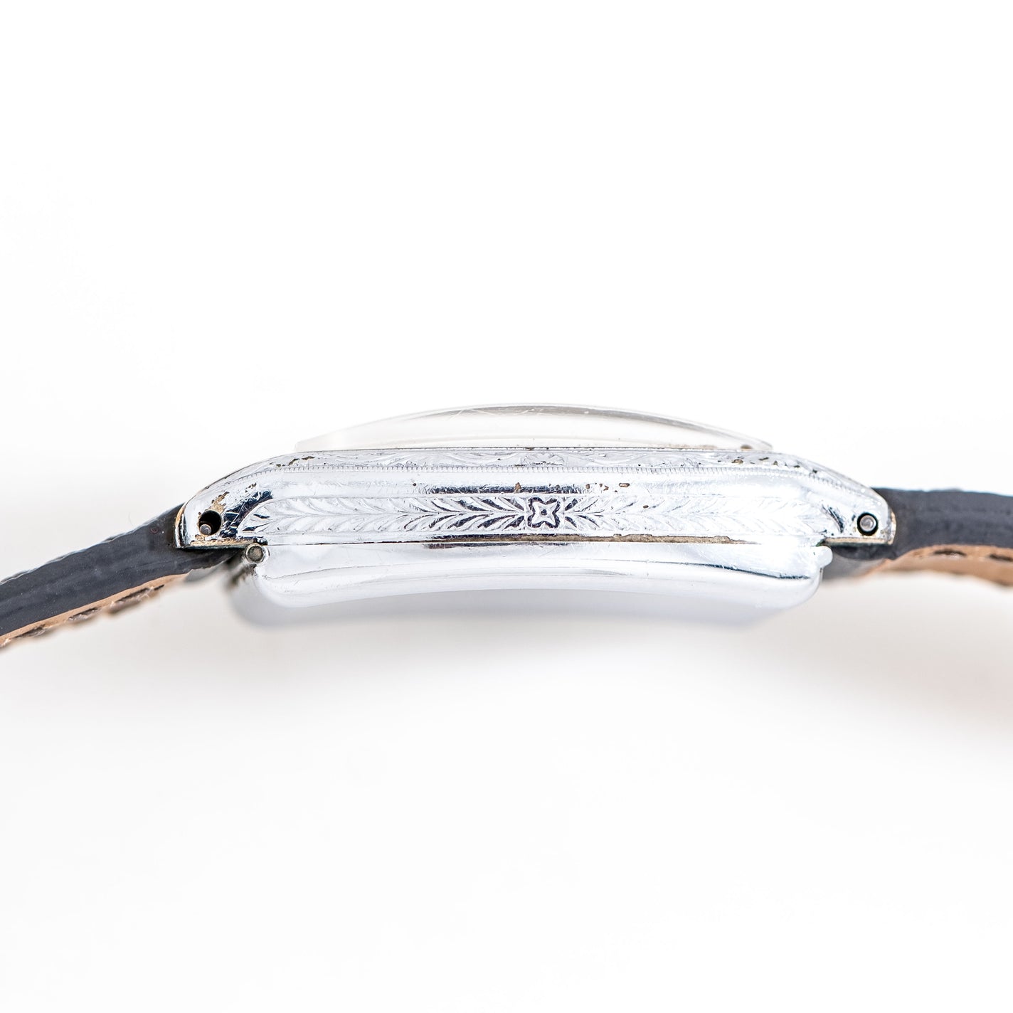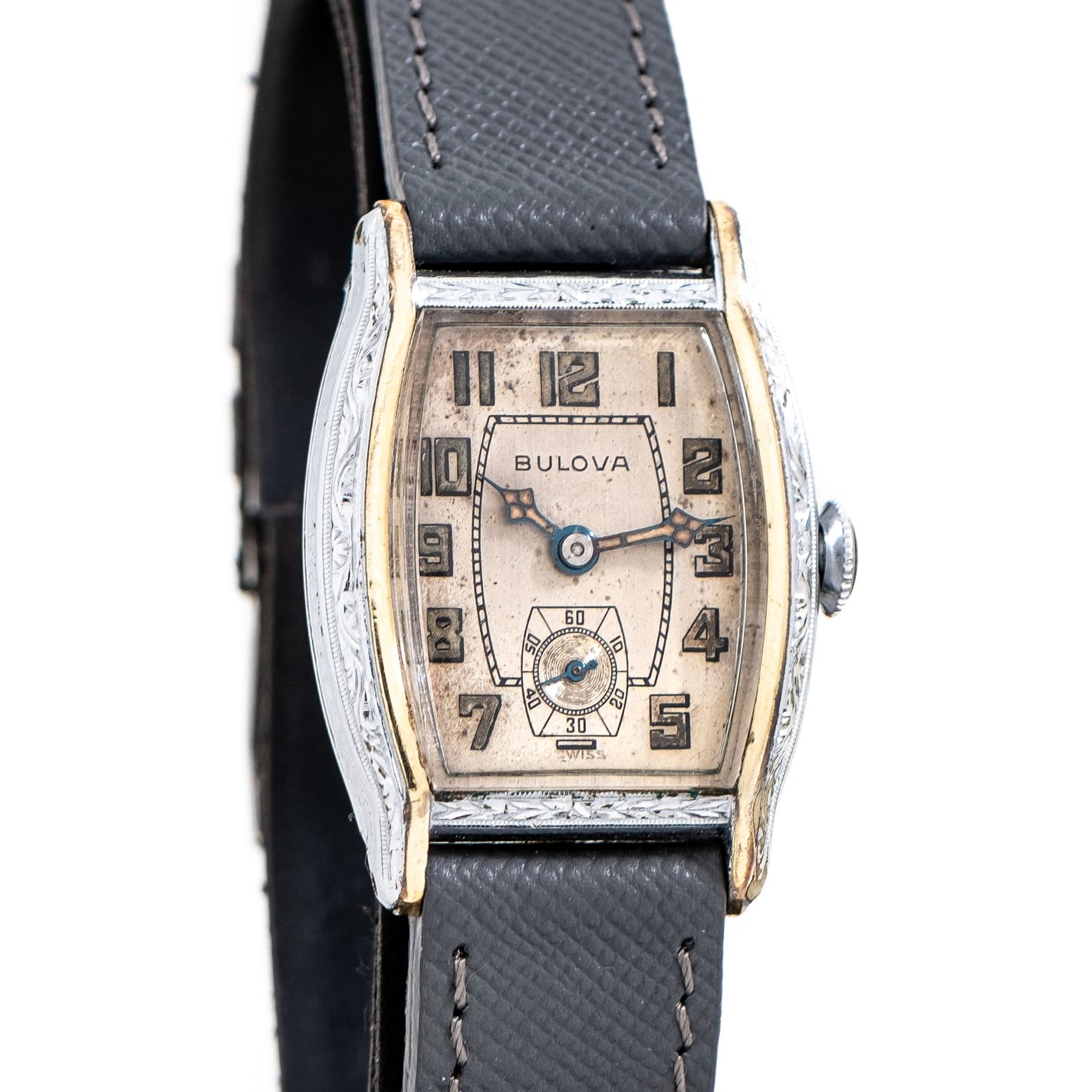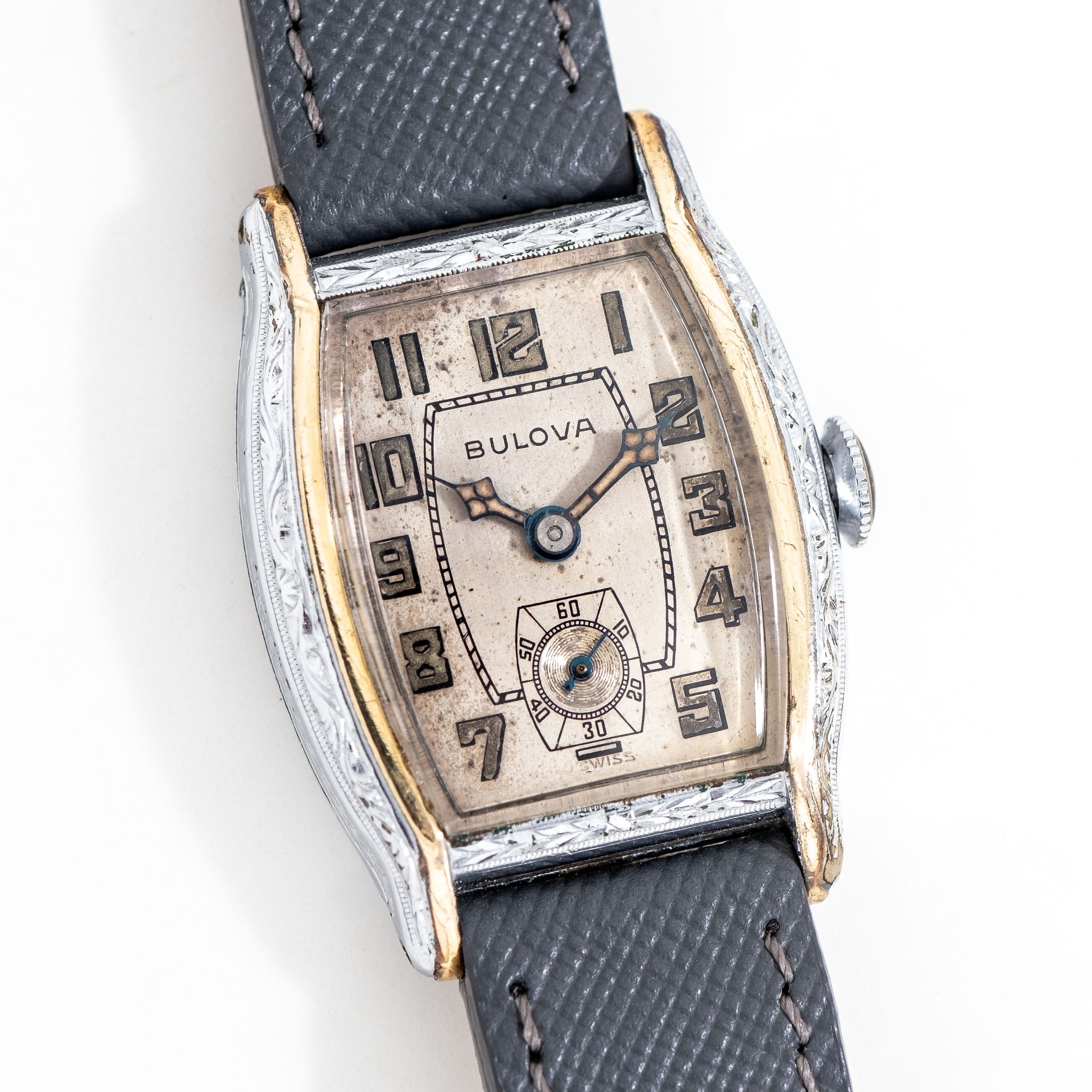 1930 Vintage Bulova Tonneau Shaped Two-Tone Chrome Plated Watch. Features an all Original Warm Aged Silver Dial with Aged Patina, Printed Luminous Arabic Numerals, Blued Steel Cathedral Hands with Luminous, and an Ornate Engraved Art Deco Case. Comes on a 16mm Genuine "Saffiano" Style Leather Grey Colored Strap. Powered by a 17 Jewel Caliber 10AN Manual Winding Movement. Triple Signed. Swiss Made.