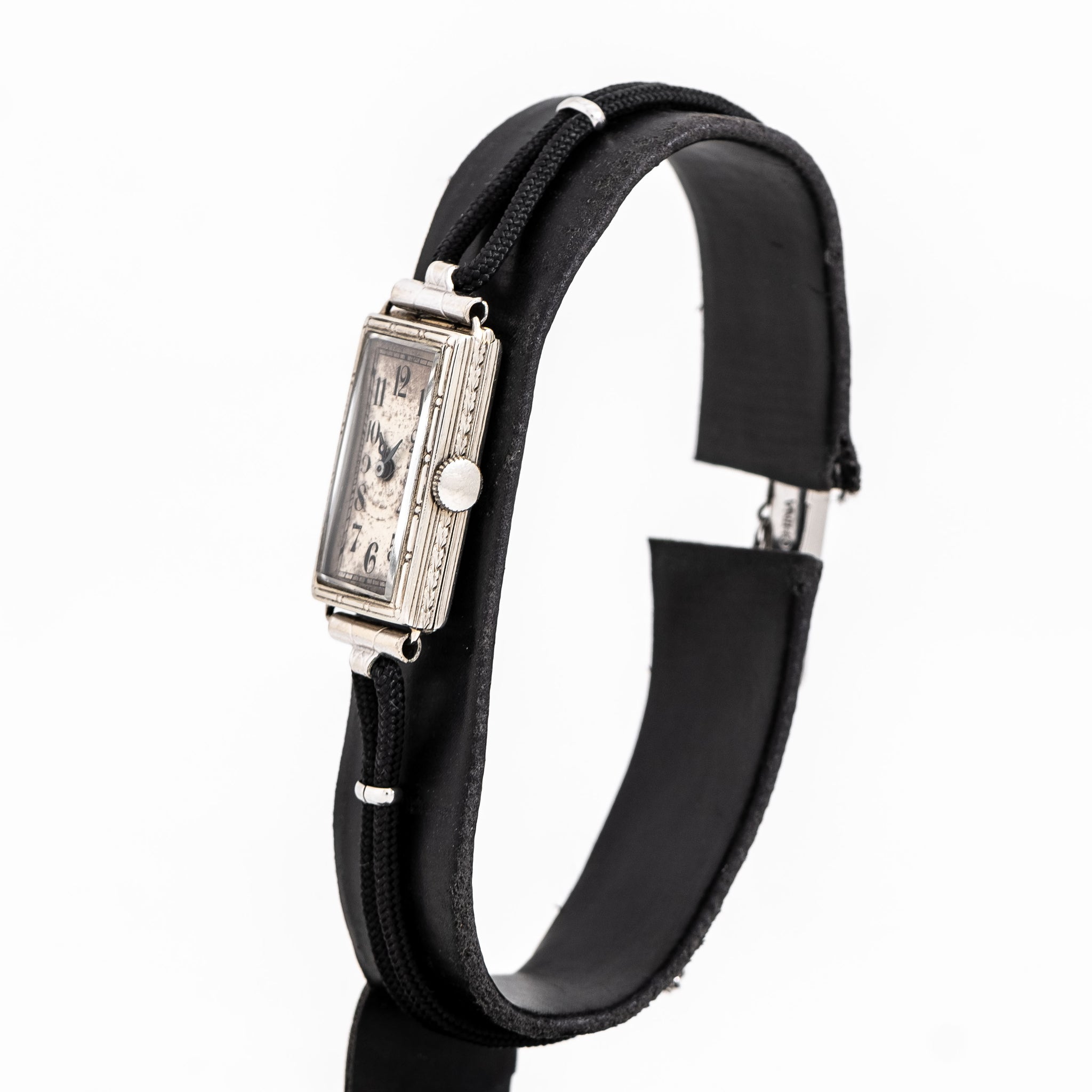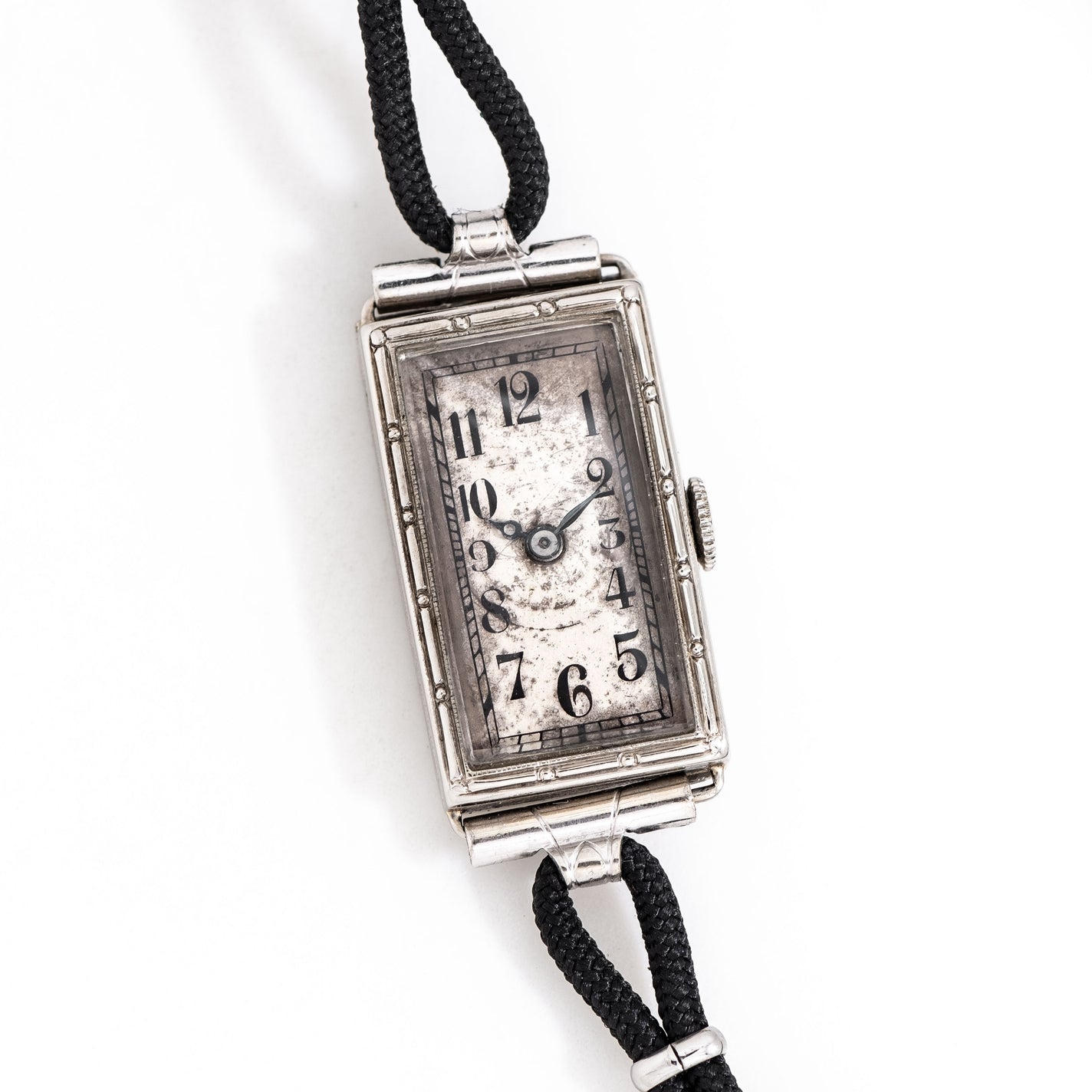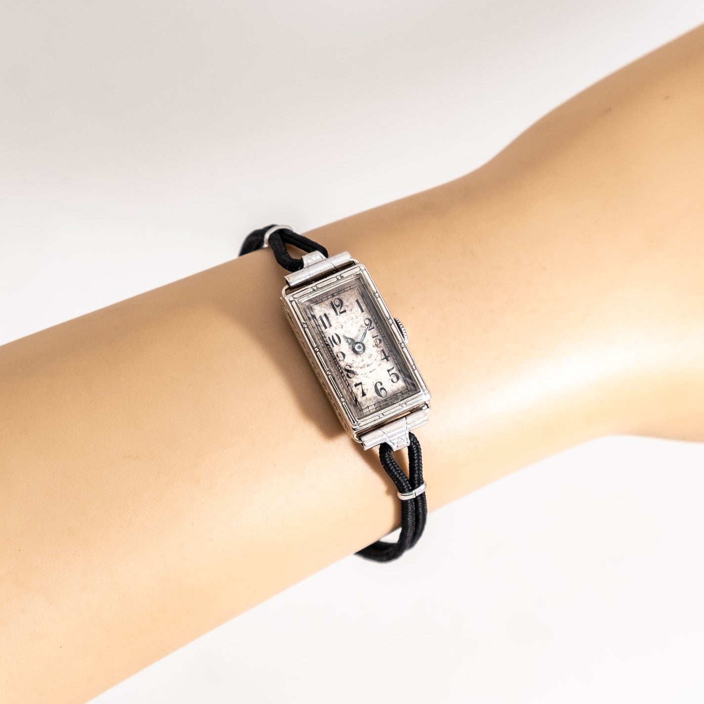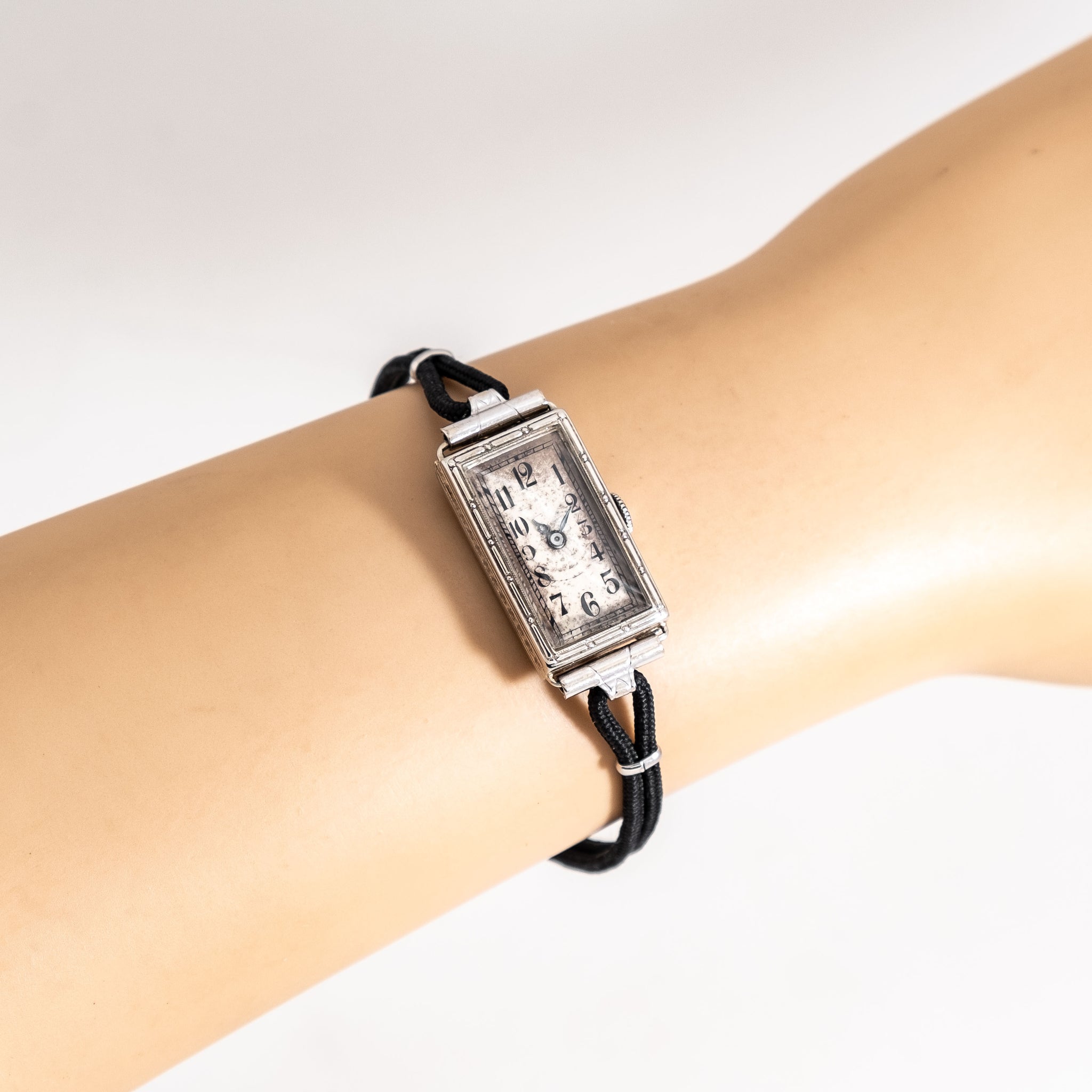 1930's Vintage American Watch Case Co. Ladies Art Deco 18k White Gold Watch. Features an all Original Silver Dial with Aged Patina, Blued Steel Breguet Hands and, Printed Black Colored Arabic Numerals. Comes on a New Braided Rope Strap, Will fit up to a 7 1/2 Inch Wrist . Powered by a 17 Jewel Manual Winding Movement. Swiss Made.