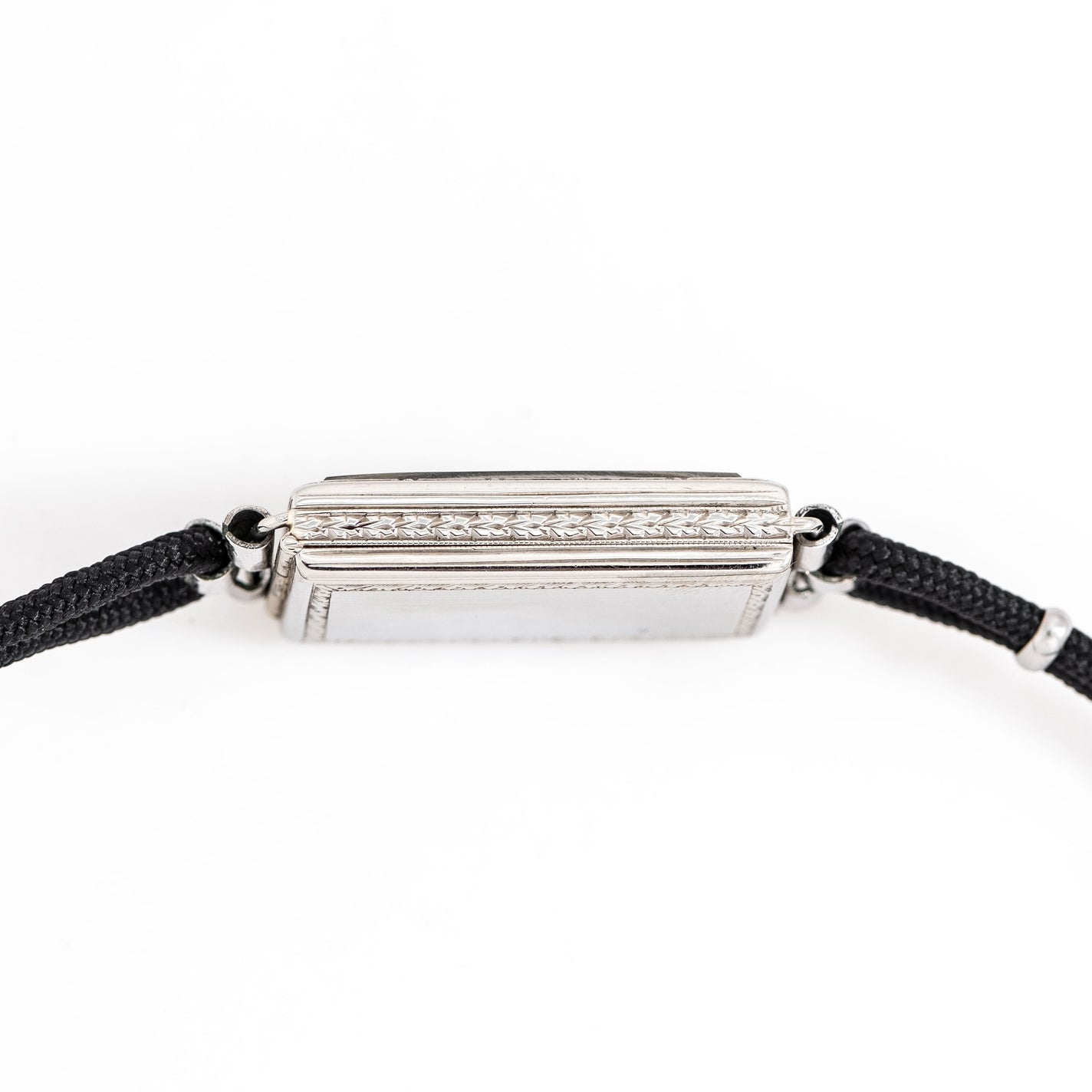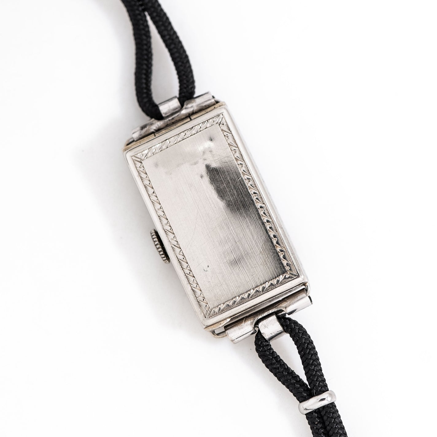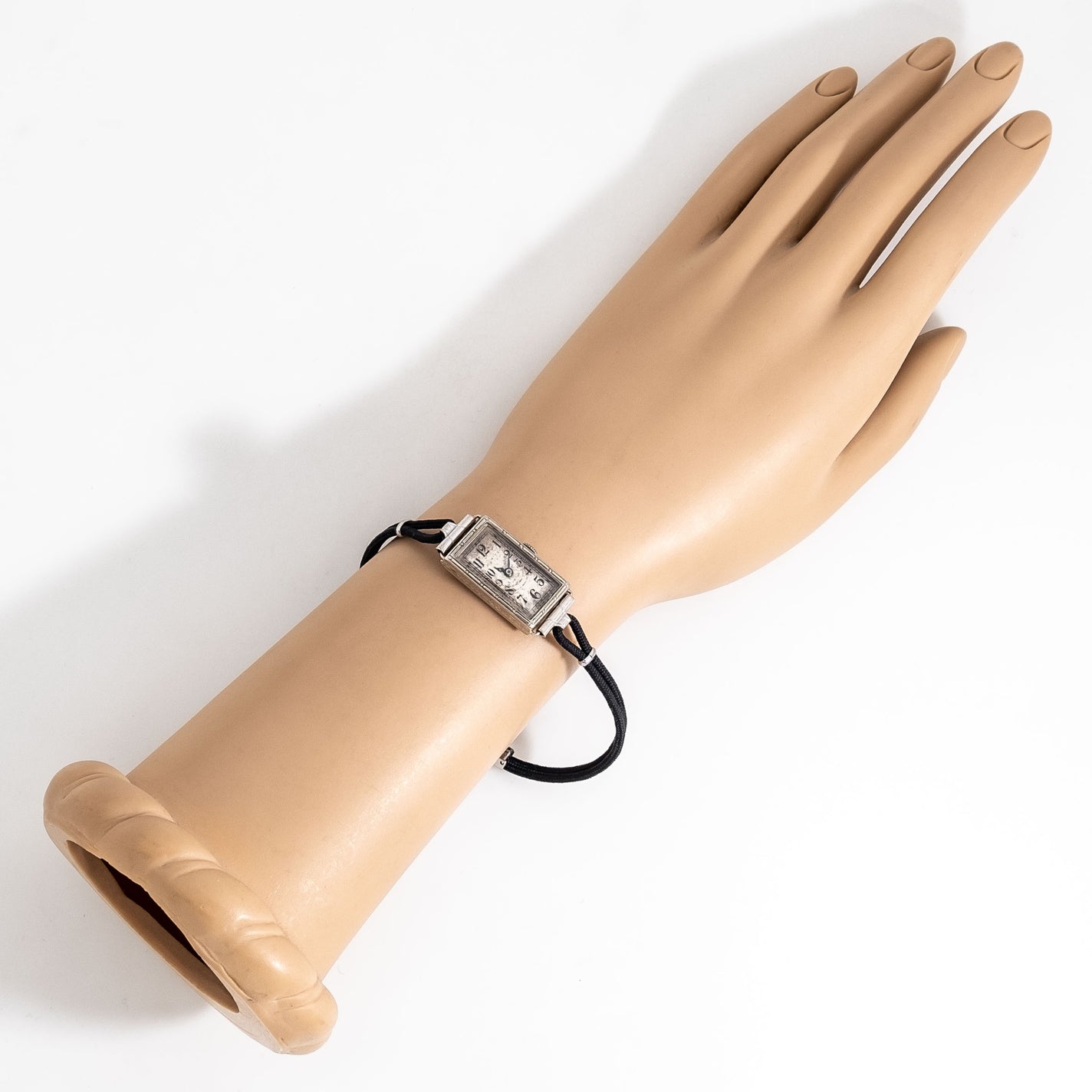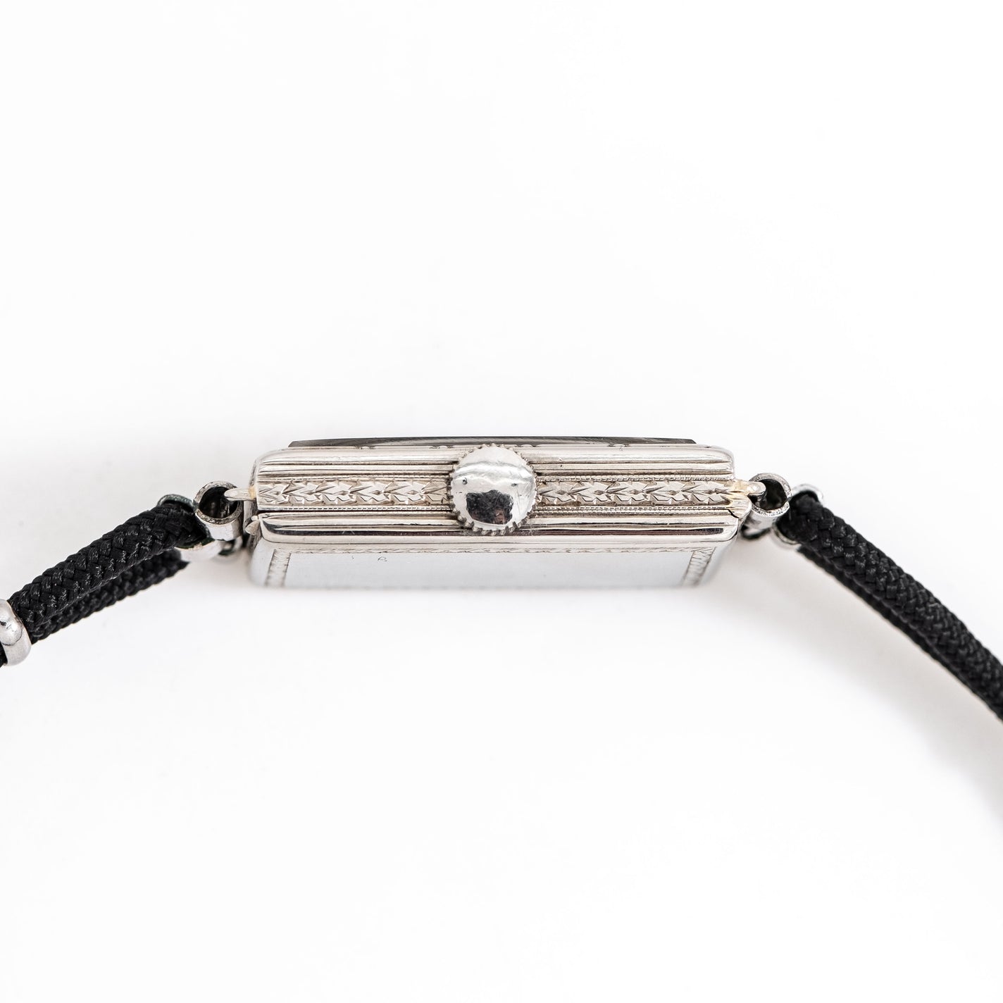 1930's Vintage American Watch Case Co. Ladies Art Deco 18k White Gold Watch. Features an all Original Silver Dial with Aged Patina, Blued Steel Breguet Hands and, Printed Black Colored Arabic Numerals. Comes on a New Braided Rope Strap, Will fit up to a 7 1/2 Inch Wrist . Powered by a 17 Jewel Manual Winding Movement. Swiss Made.