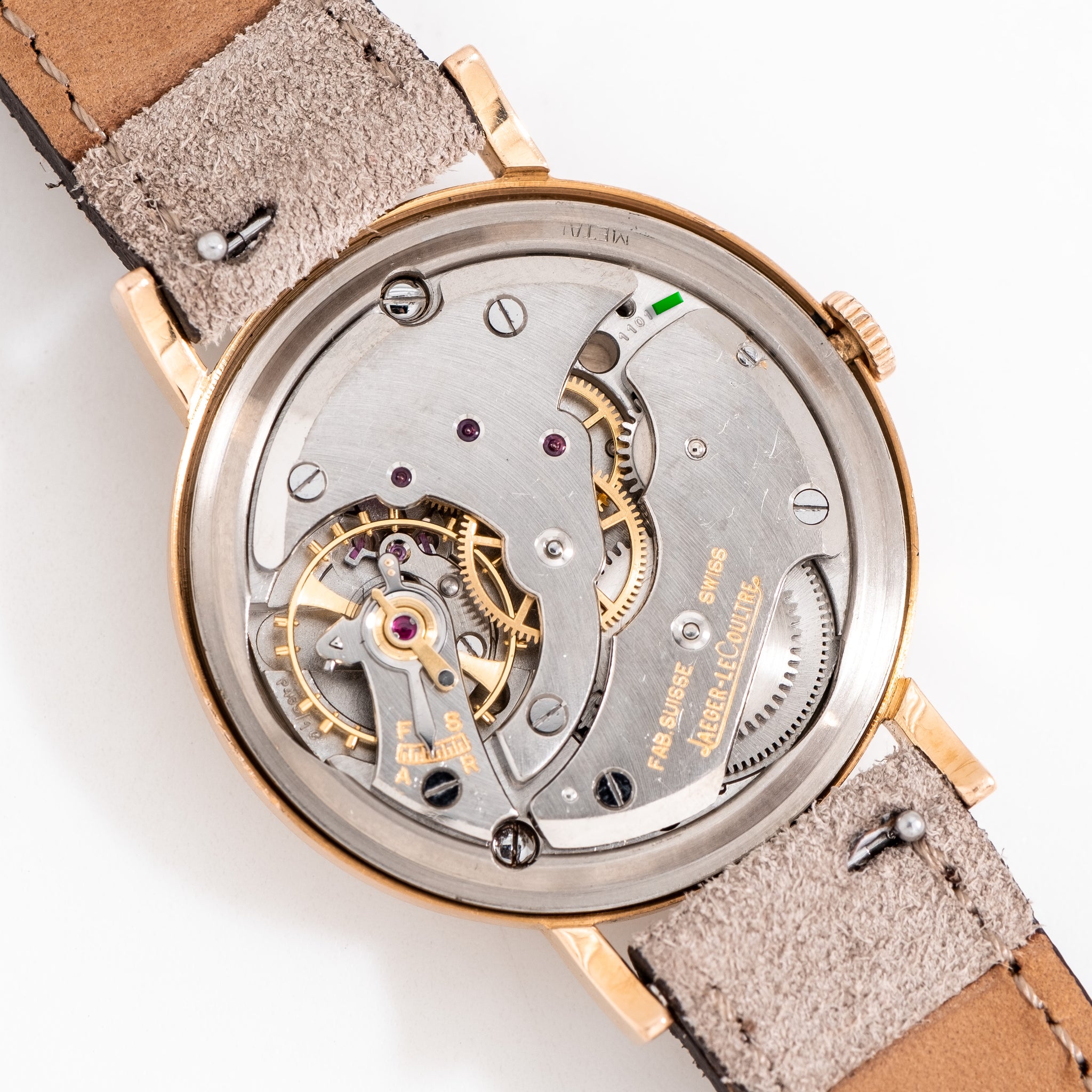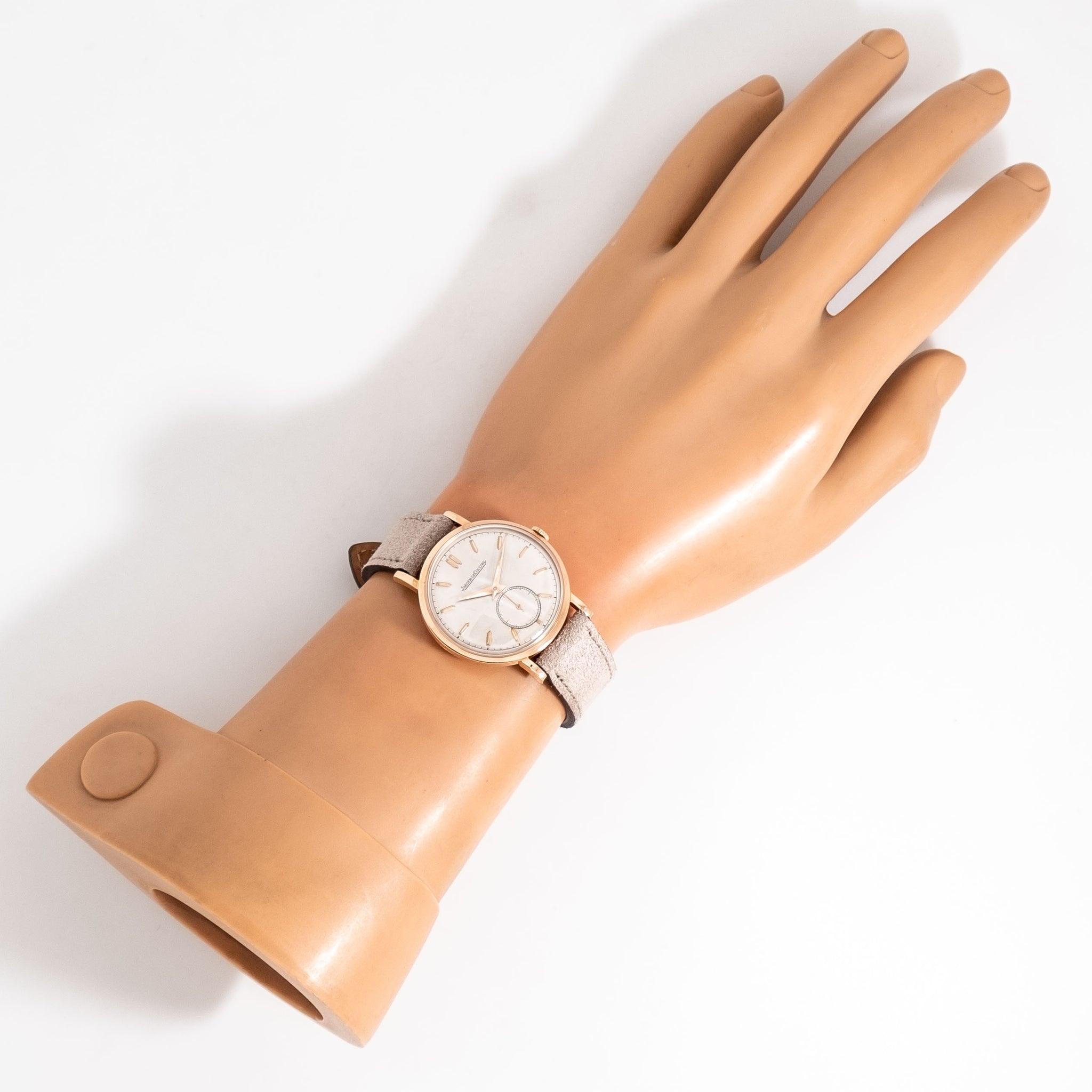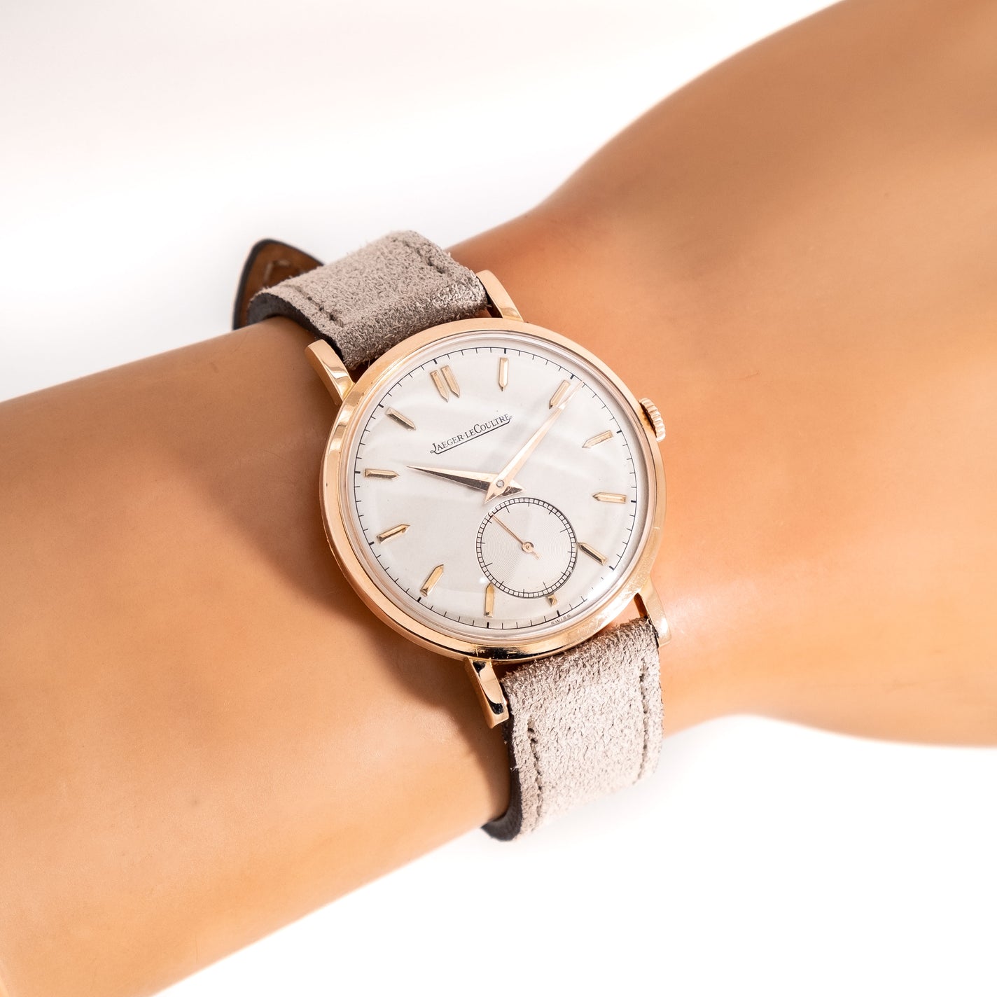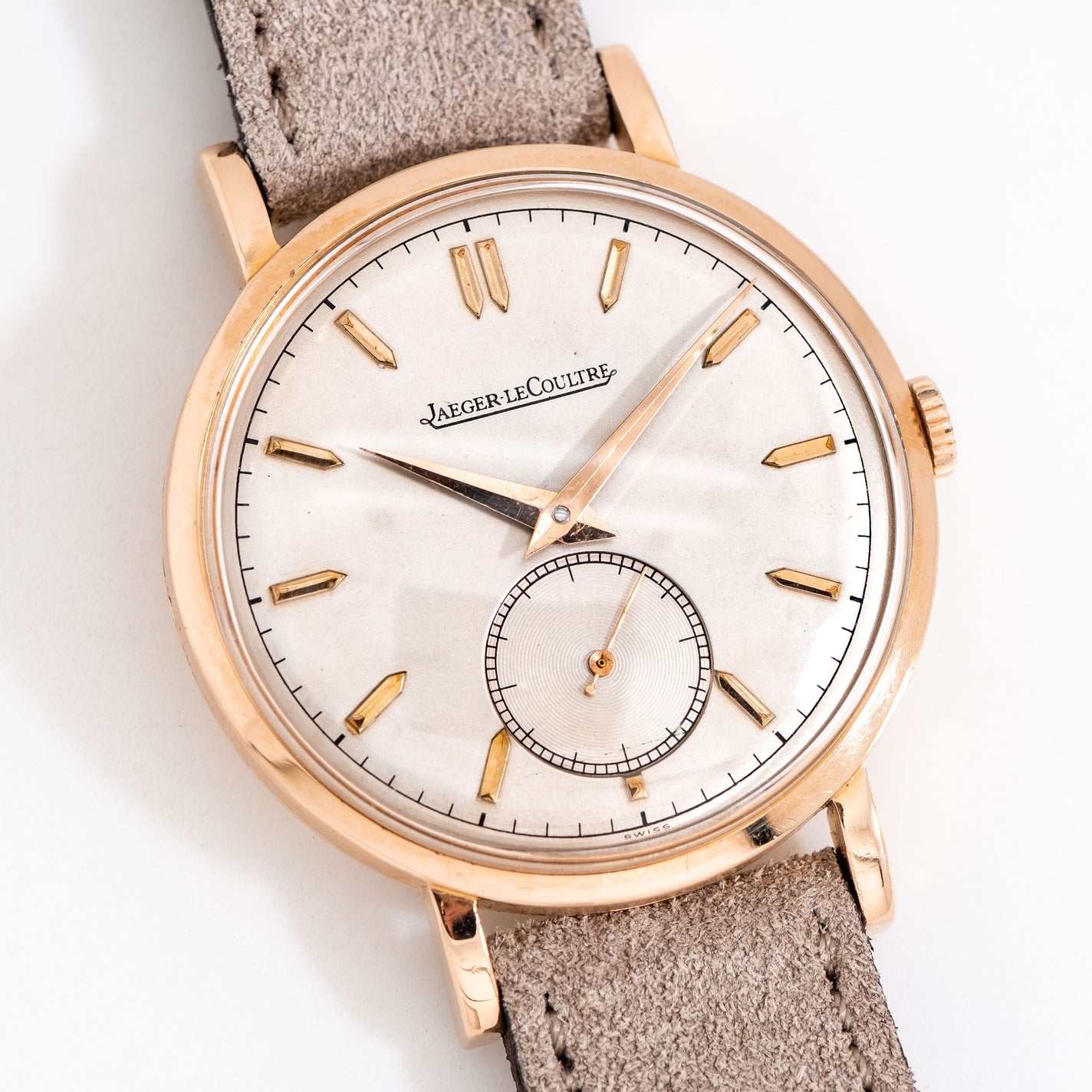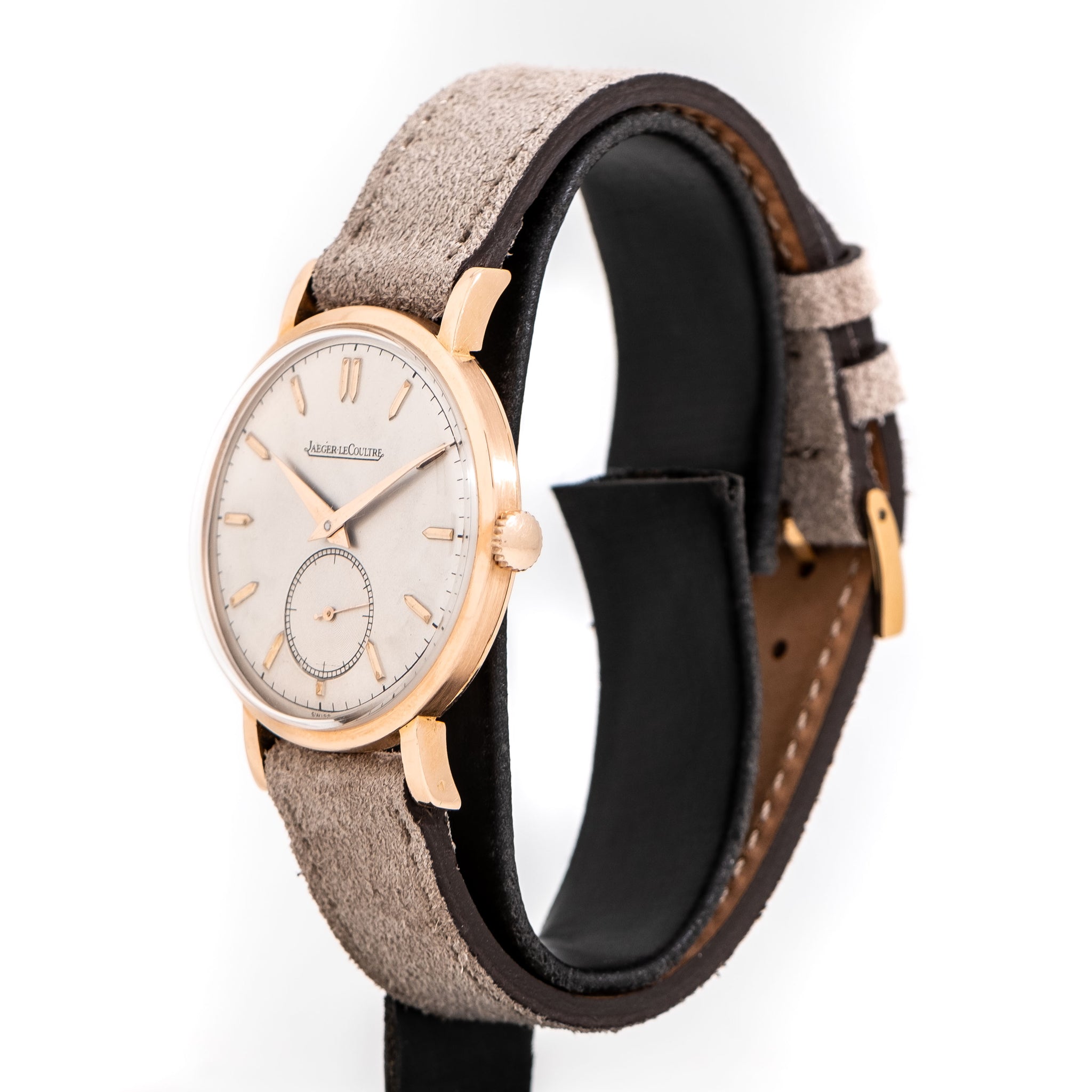 1940's Vintage Jaeger-LeCoultre Cal. P469/1C Solid 18k Rose Gold Watch. Features an all Original Silver Dial in Excellent Condition with Applied Rose Gold Colored Pointed Hour Markers, Sub Seconds Dial at the 6 o Clock Position, a Black Colored Printed Minute Track, and Rose Gold Colored Dauphine Hands. Comes on a 17mm Genuine Suede Leather Beige / Tan Colored Strap. Powered by a 17 Jewel Caliber P469/1C Manual Winding Movement. Triple Signed. Swiss Made.
