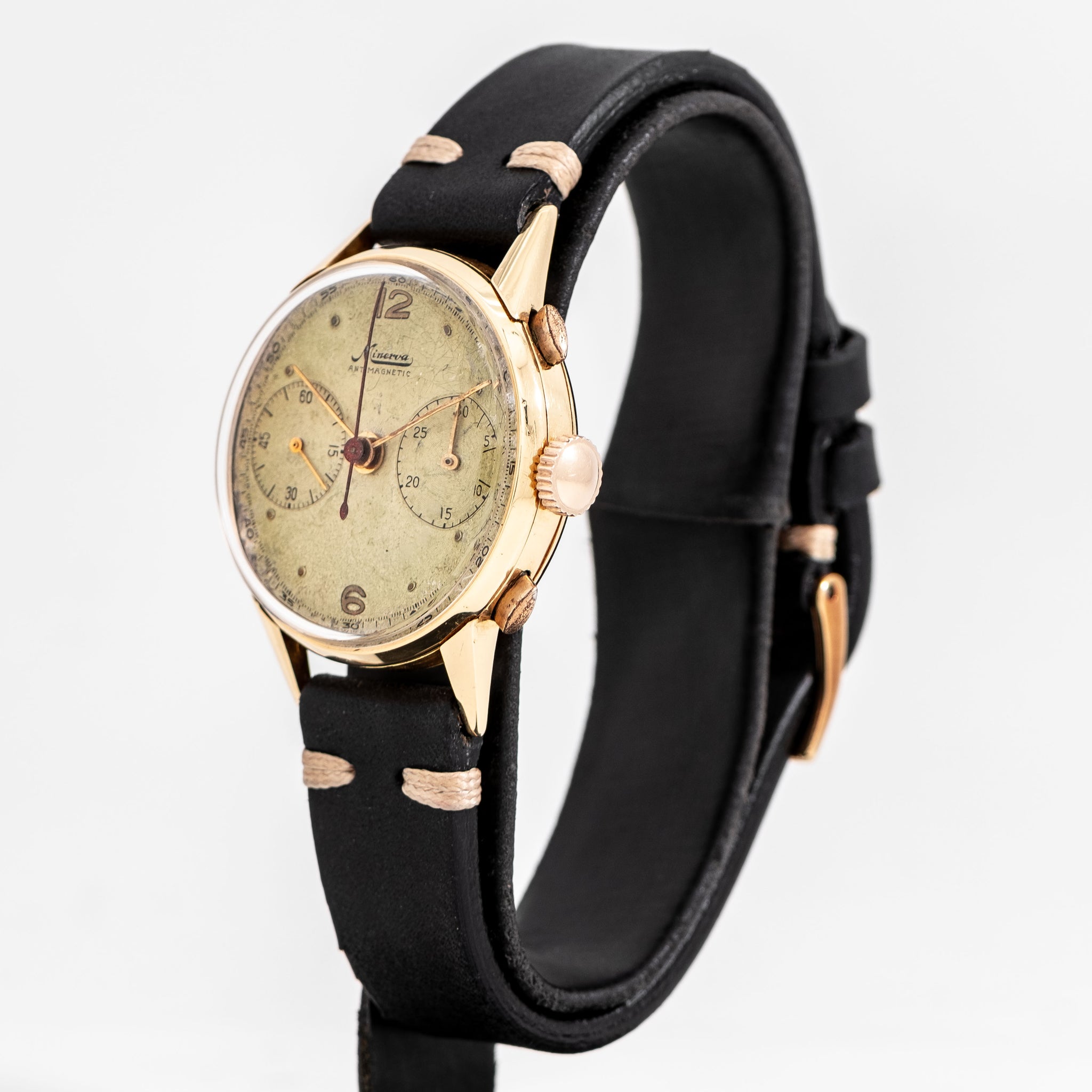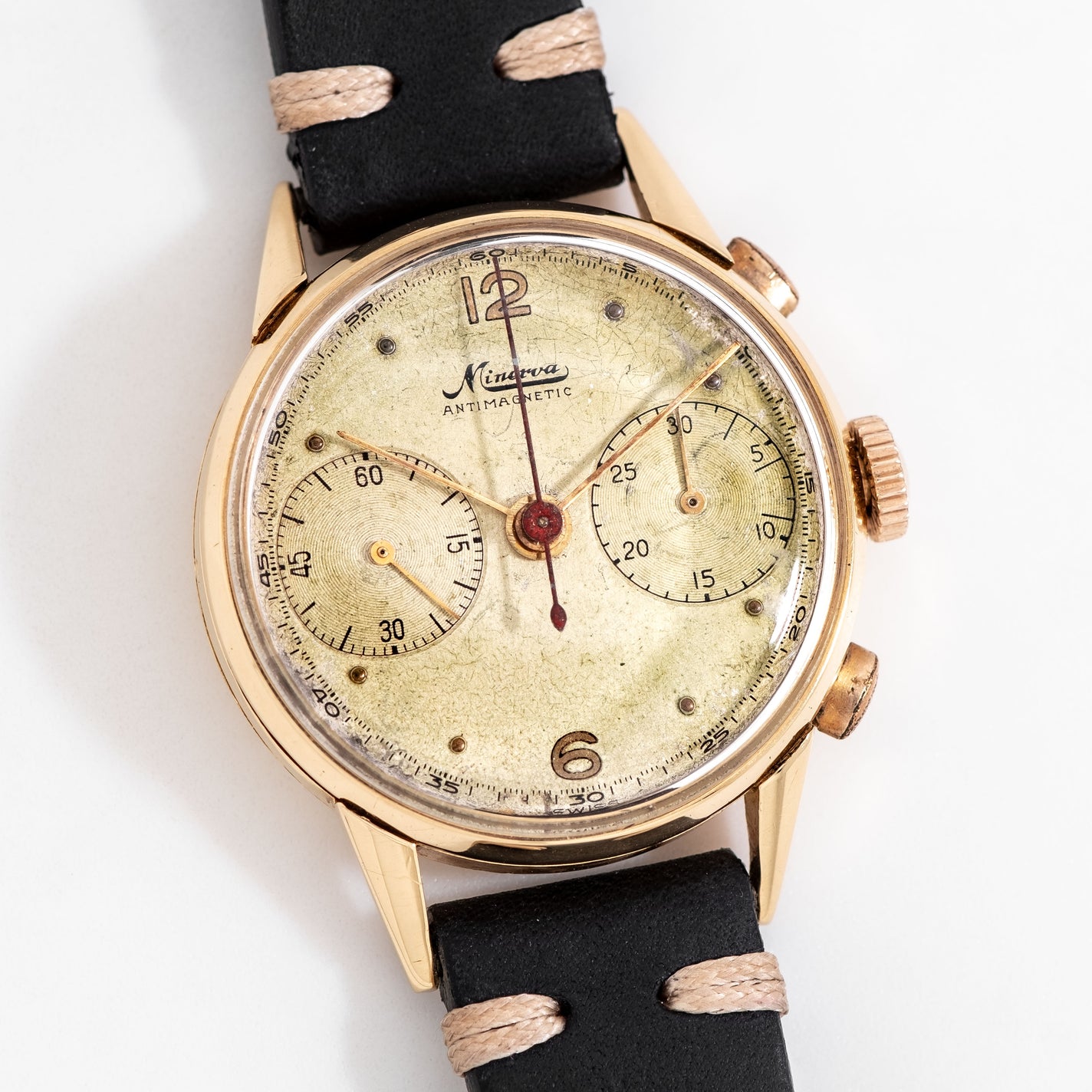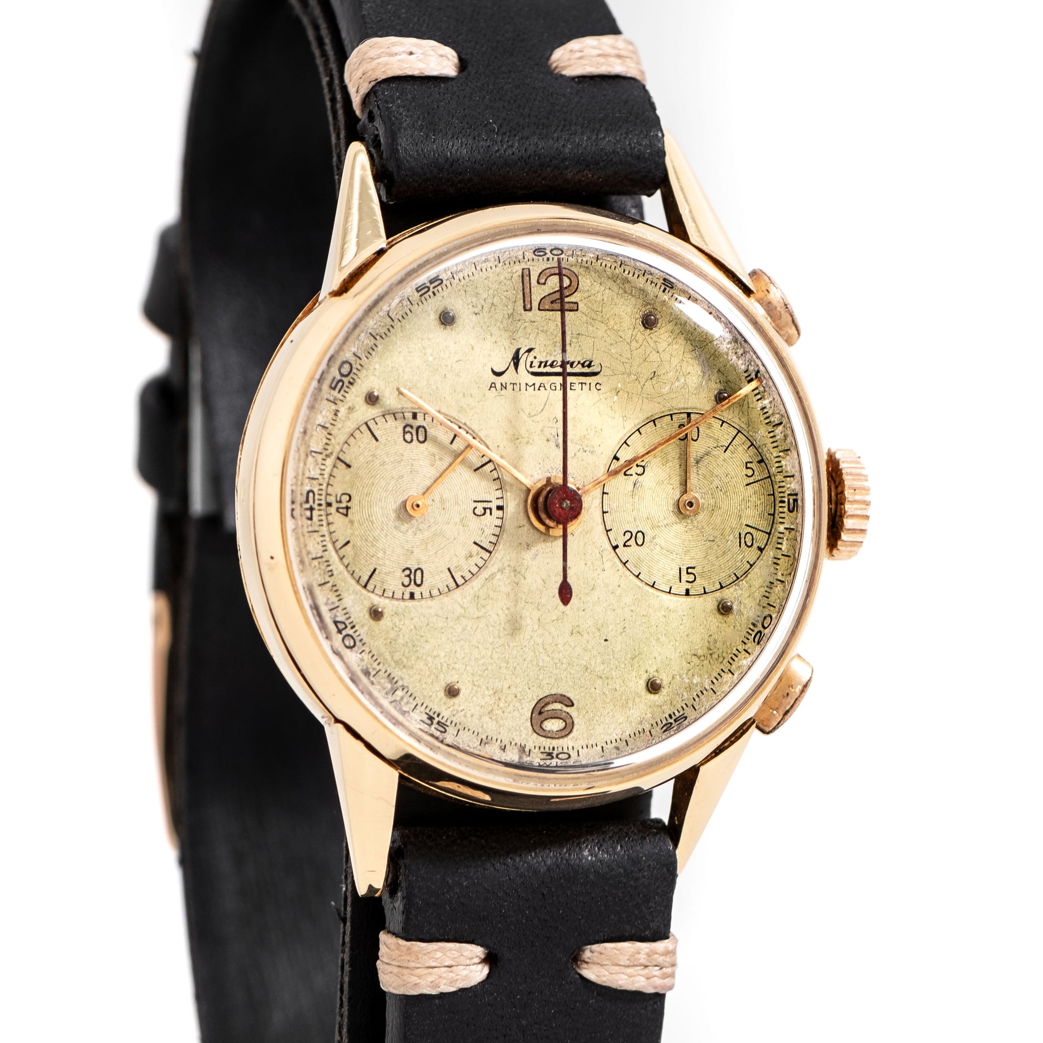 1940's Vintage Minerva Antimagnetic Chronograph Solid 18k Yellow Gold Watch. Features an all Original Silver Dial with Aged Patina, Applied Yellow Gold Colored Plots, Applied Yellow Gold Colored 12 and 6 Arabic Numerals, Two Sub Dial, a Black Colored Printed Minute Track, and Yellow Gold Colored Stick Hands. Comes on a 16mm Genuine Leather Black Colored Strap. Powered by a 17 Jewel Caliber 13-20 Manual Winding Chronograph Movement. Triple Signed. Swiss Made.