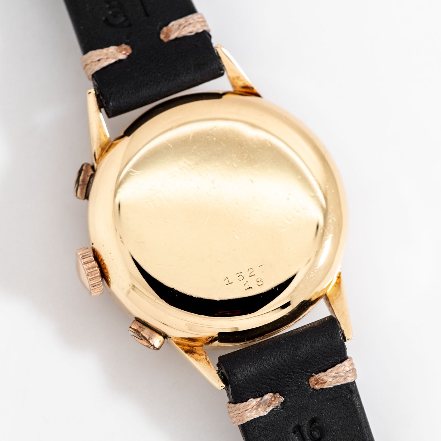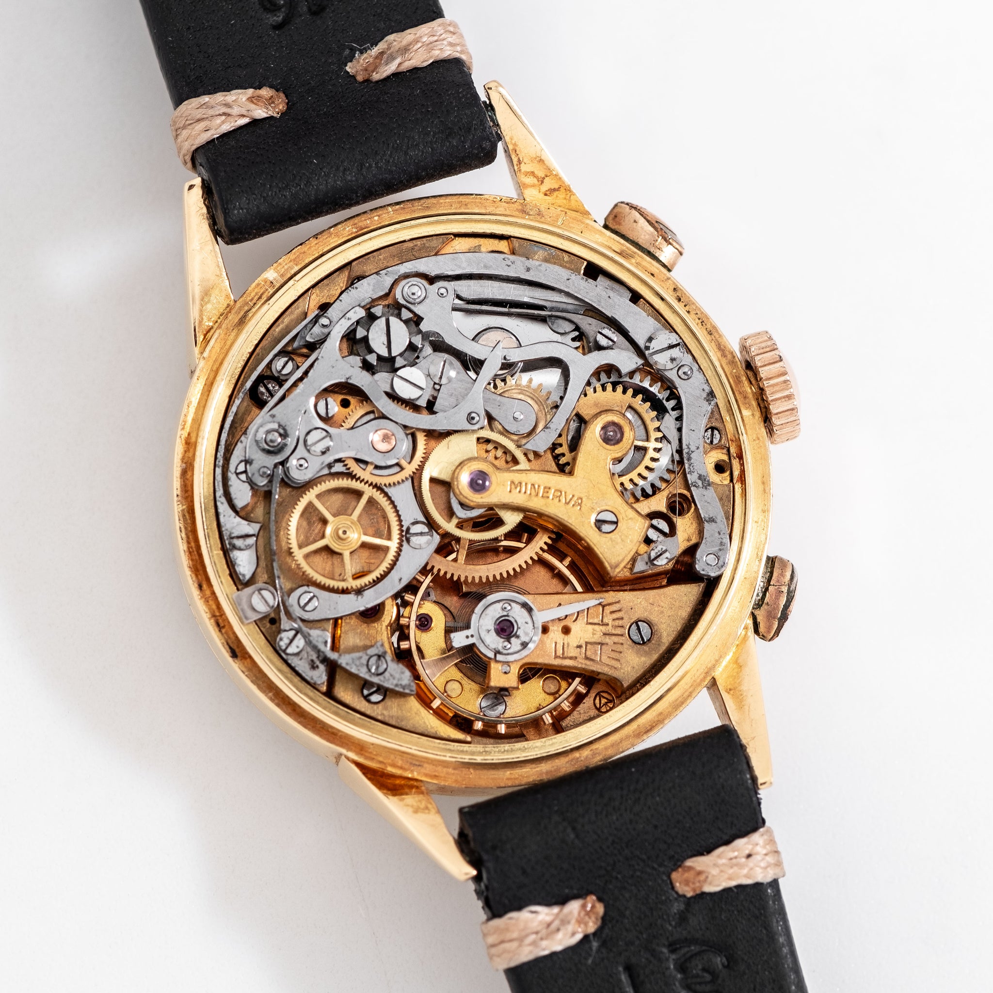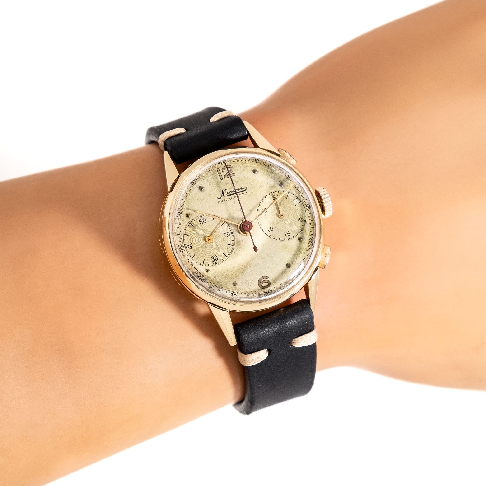 1940's Vintage Minerva Antimagnetic Chronograph Solid 18k Yellow Gold Watch. Features an all Original Silver Dial with Aged Patina, Applied Yellow Gold Colored Plots, Applied Yellow Gold Colored 12 and 6 Arabic Numerals, Two Sub Dial, a Black Colored Printed Minute Track, and Yellow Gold Colored Stick Hands. Comes on a 16mm Genuine Leather Black Colored Strap. Powered by a 17 Jewel Caliber 13-20 Manual Winding Chronograph Movement. Triple Signed. Swiss Made.