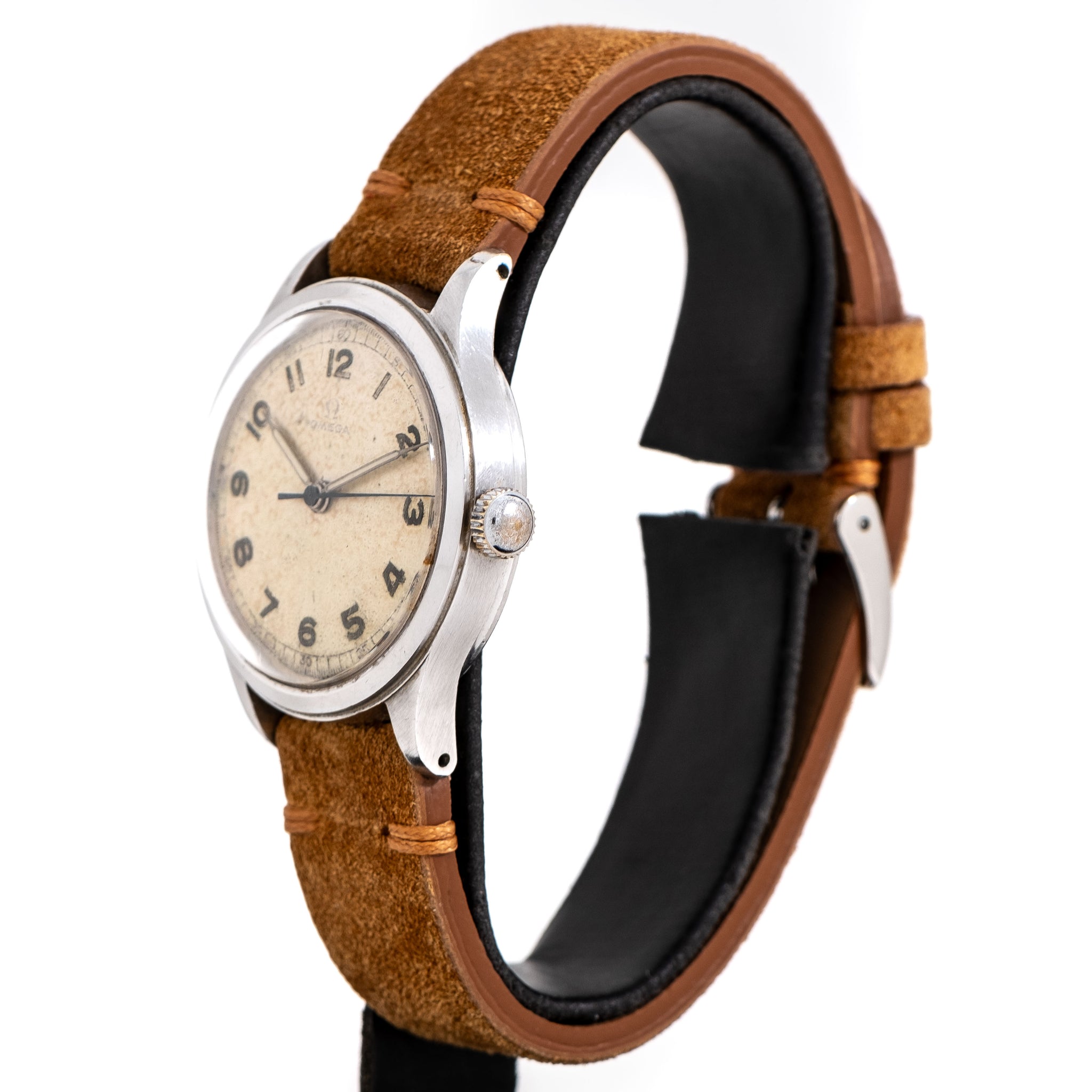 1943 Vintage Omega WWII Era Military "US ARMY" Ref. 2179 in Stainless Steel. Features an all Original Warm Aged Silver Dial with Patina, Printed Luminous Arabic Numerals, Printed Black Colored Outer Chapter Ring, and Warm Aged Index Hands with Aged Luminous. The Case Diameter Measures at a Sizable 35mm. Comes on an 18mm new 100% Genuine Suede Leather Brown Colored Strap. Powered by a 16 Jewel Caliber 30T2SC Manual Winding Movement. Triple Signed. Swiss Made.
