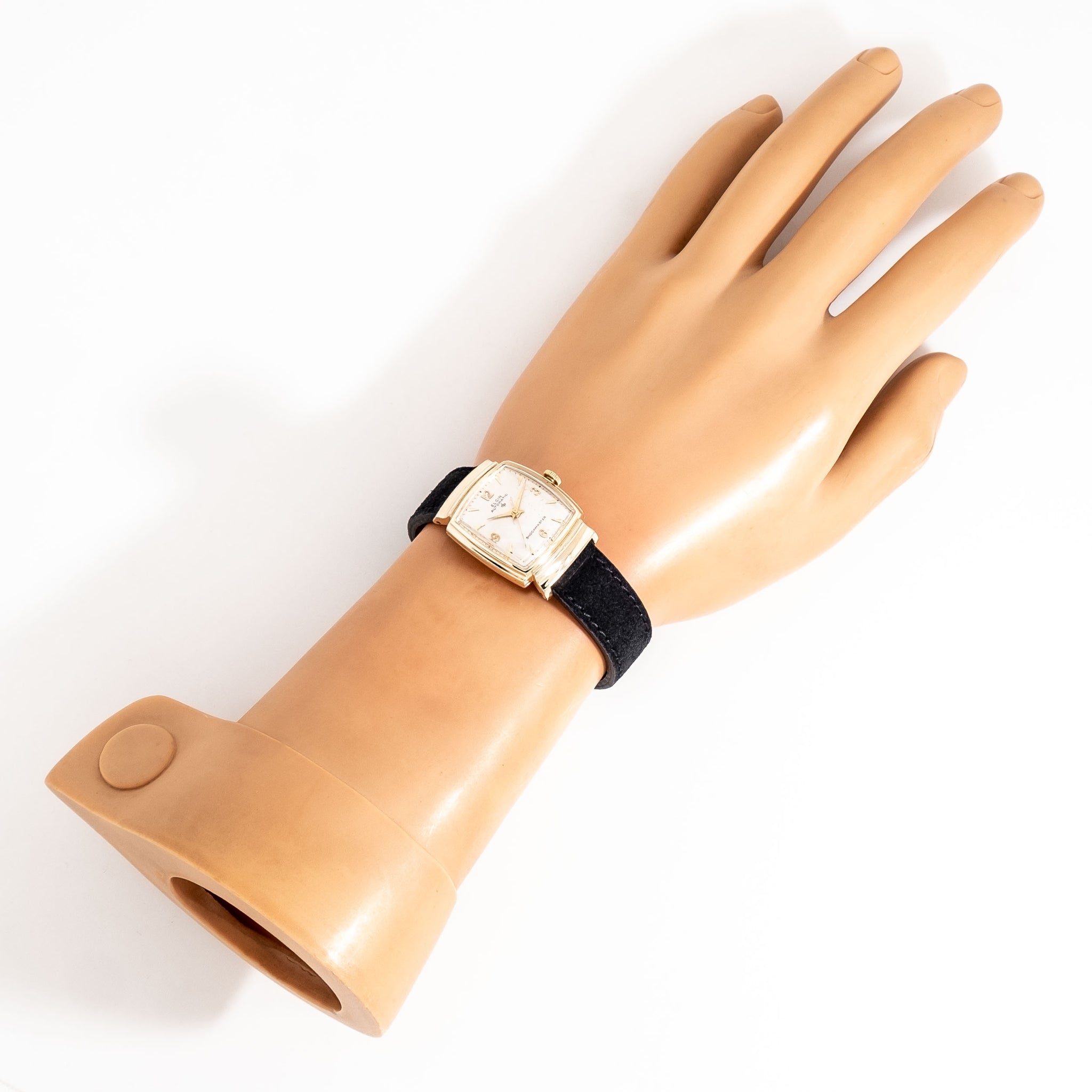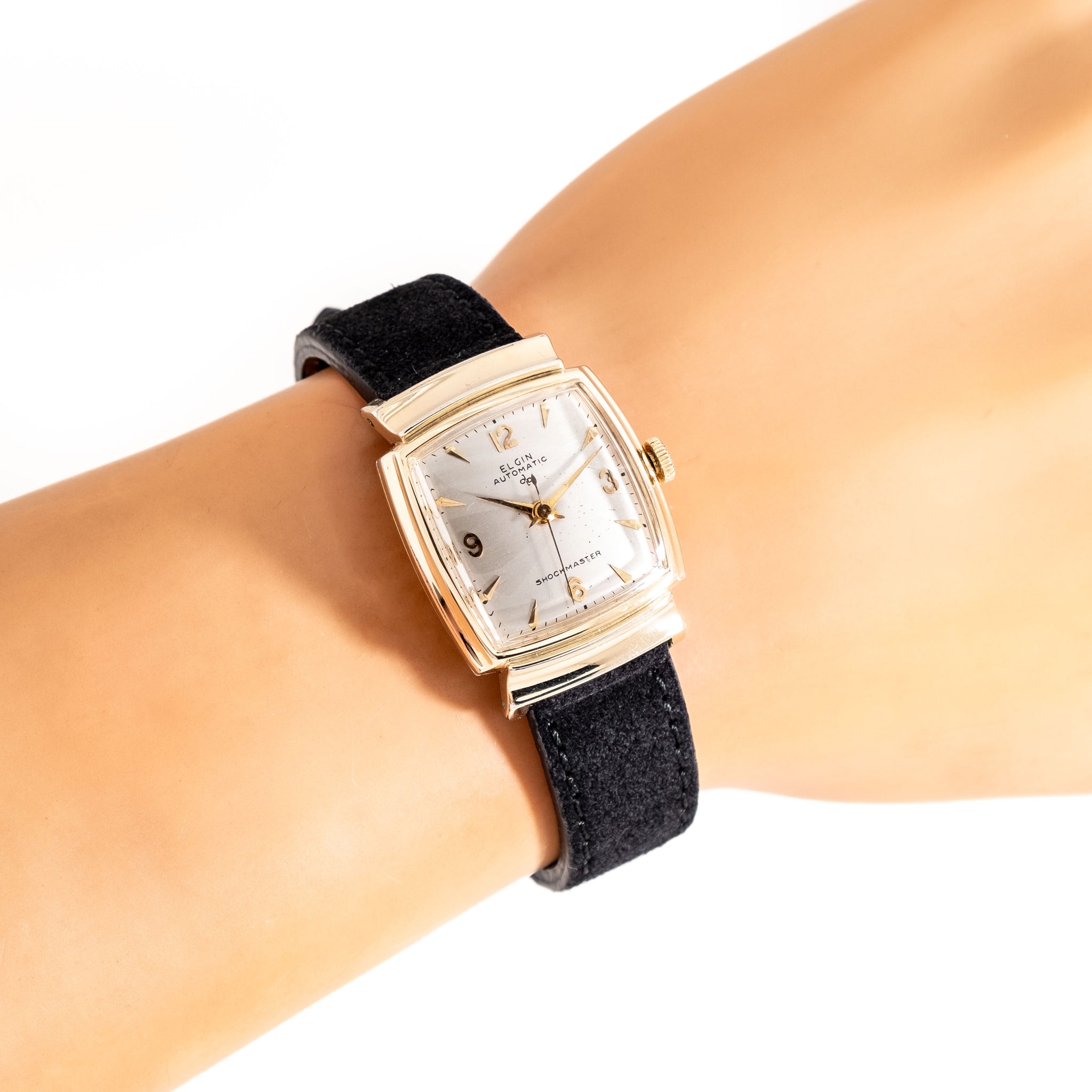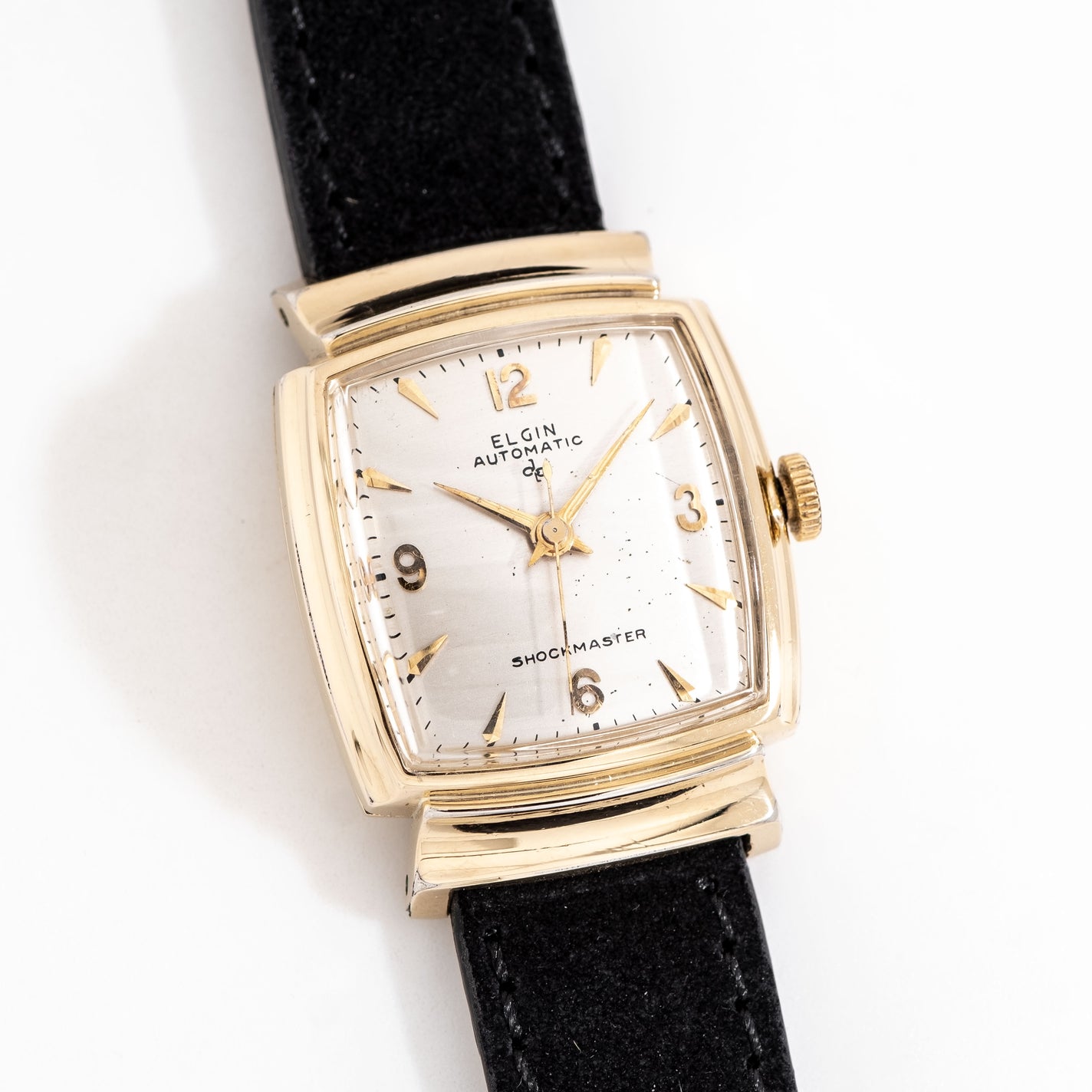1950 Vintage Elgin Ref. 6809 Shockmaster Automatic 10k Yellow Gold Filled Watch. Features an Original Professionally Restored Silver Dial in Very Good Condition with Applied Yellow Gold Colored Pointed Hour Markers, Applied Yellow Gold Colored Arabic Numerals, and Yellow Gold Colored Dauphine Hands. Comes on a 16mm Genuine Suede Leather Black Colored Strap. Powered by a 17 Jewel Caliber 645 Automatic Winding Movement. Triple Signed. Swiss Made.