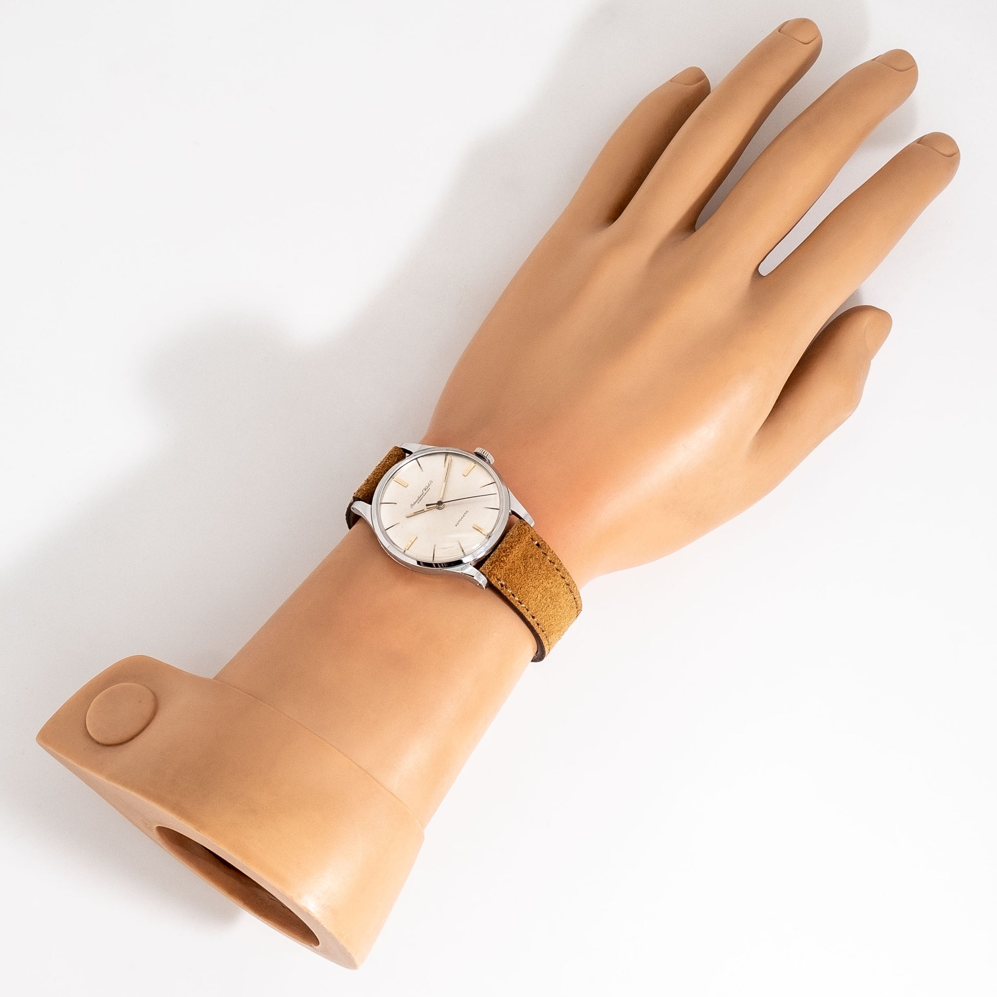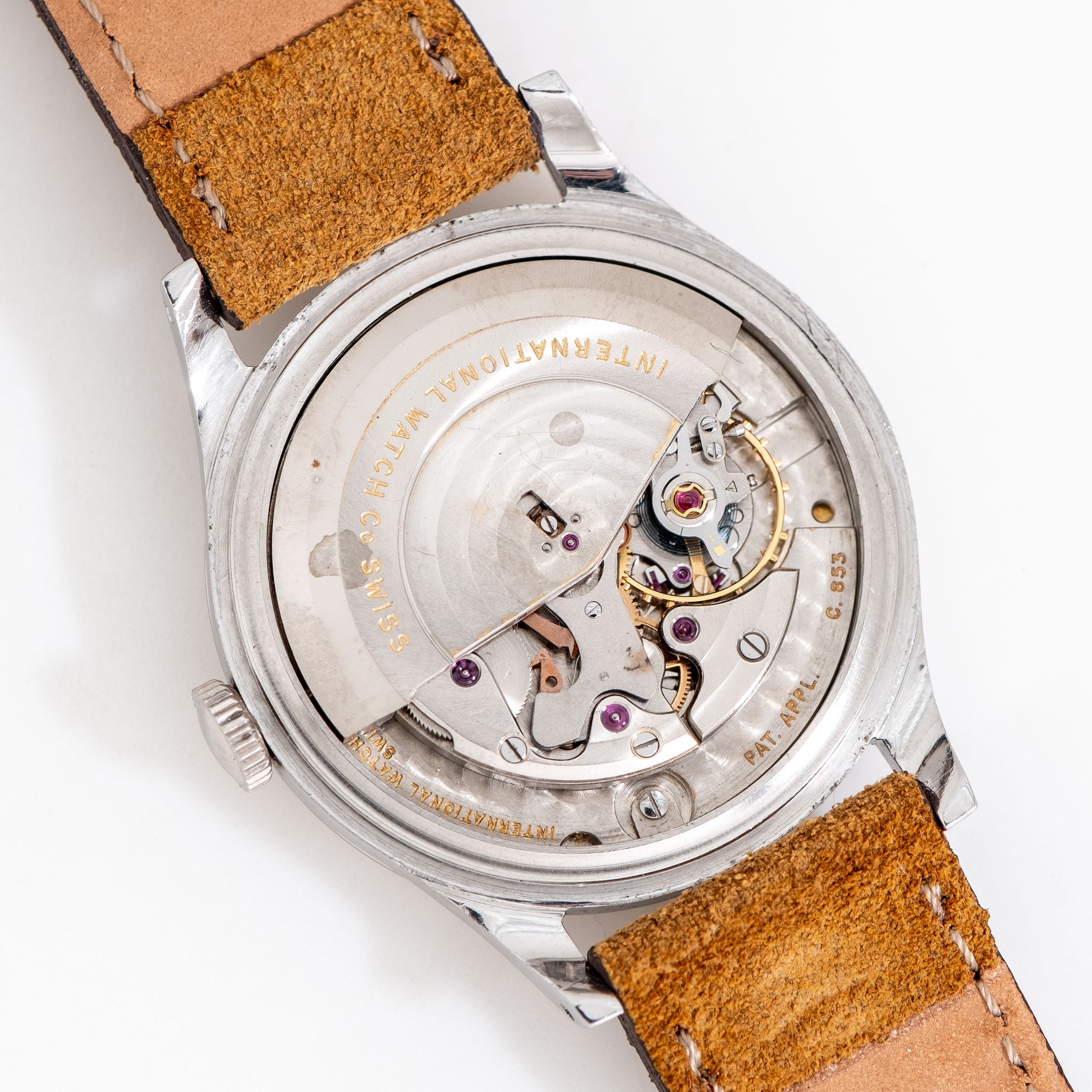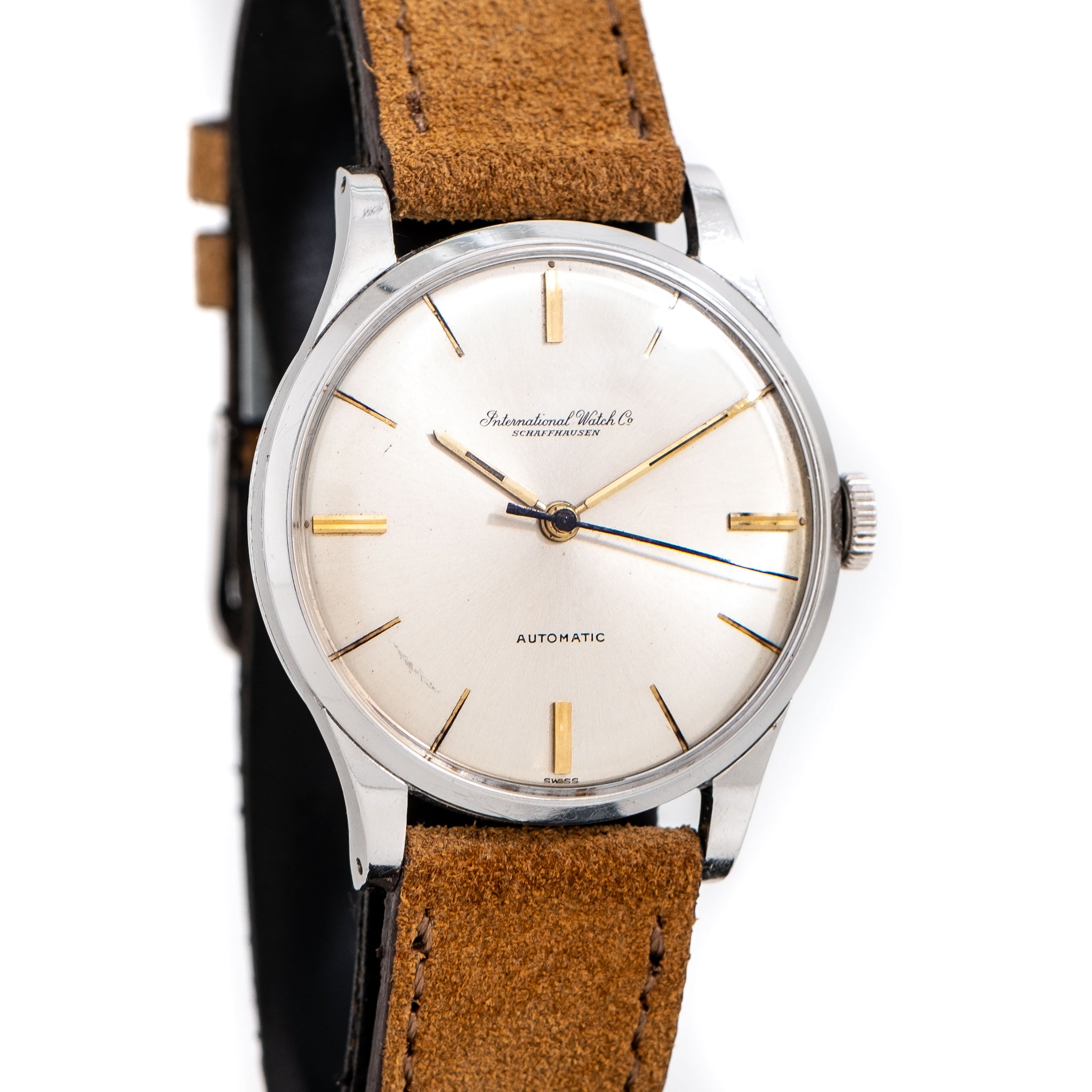 1960 Vintage IWC C. 853 Automatic Watch in Stainless Steel. Features an all Original Warm Aged Silver Dial in Good Condition with Applied Yellow Gold Colored Stick Hour Markers, and Yellow Gold Colored Stick Hands. Comes on a Genuine 18mm Suede Leather Brown Colored Strap. Powered by a 21 Jewel Caliber 853 Automatic Winding Movement. Triple Signed. Swiss Made.
