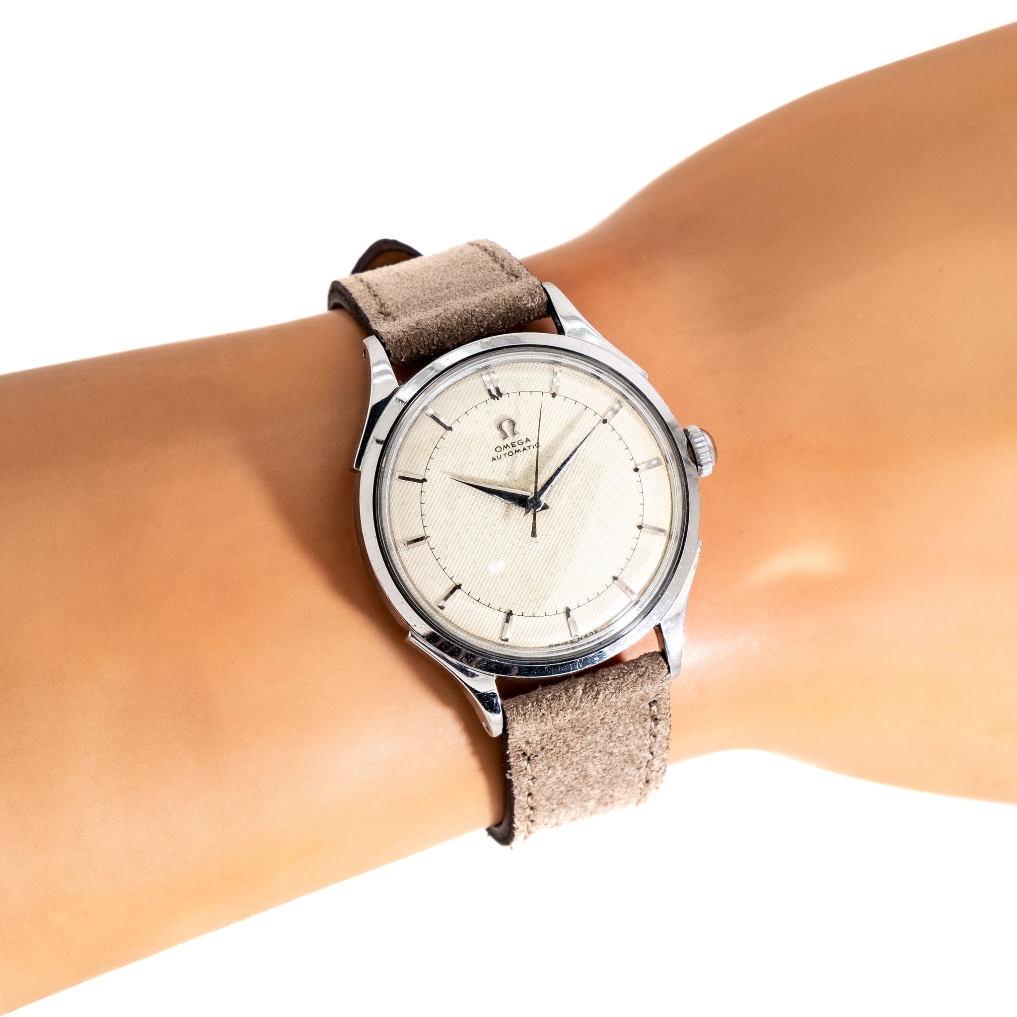 1952 Vintage Omega Waffle No Lume Dial Ref. 2637-5 SC Stainless Steel Watch. Features an all Original Warm Aged Silver Waffle Textured Dial with Beautifully Aged Patina, Applied Steel Colored Pointed Bar Markers, Printed Black Colored Minute Track, and Steel Colored Dauphine Hands. Comes on an 18mm Genuine Suede Leather Grey Colored Strap. Powered by a 17 Jewel Bumper Automatic Caliber 354 Movement. Triple Signed. Swiss Made.