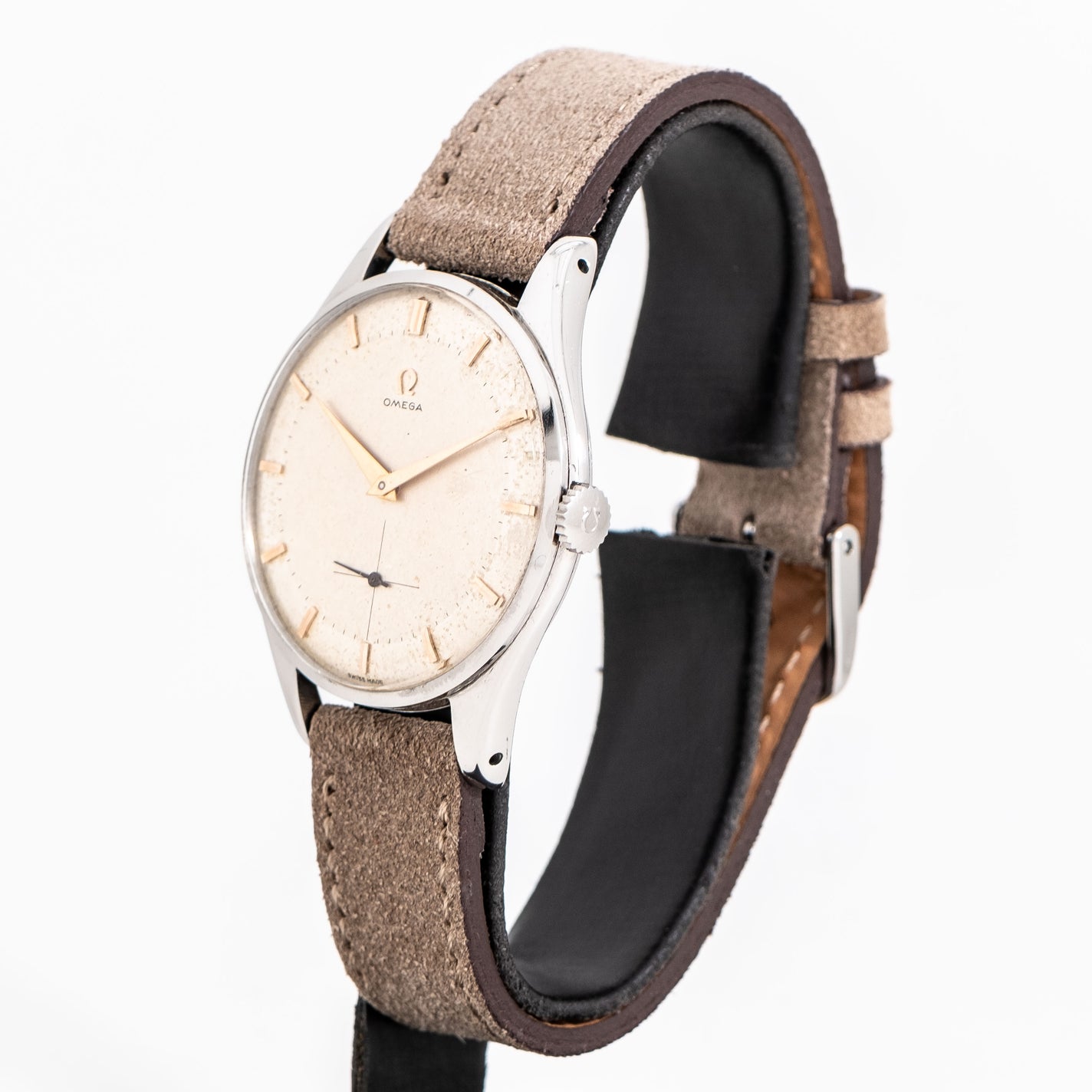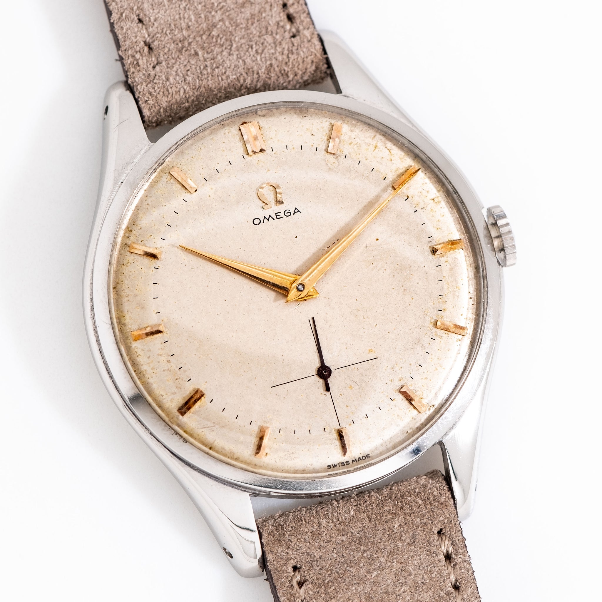 1950 Vintage Omega Jumbo Ref. 2505-21 in Stainless Steel. Features an Oversized "JUMBO" Case Measuring in at 38mm, not commonly seen for the Early 1950's, Original Omega Silver Dial with Subtle Patina, Applied Yellow Gold Colored Bar hour Markers, a Sub Seconds Dial at the 6 o Clock Position, and Yellow Gold Colored Dauphine Hands. Comes on an 18mm Genuine Suede Leather Grey Colored Strap. Powered by a 15 Jewel Caliber 266 Manual Winding Movement. Triple Signed. Swiss Made.