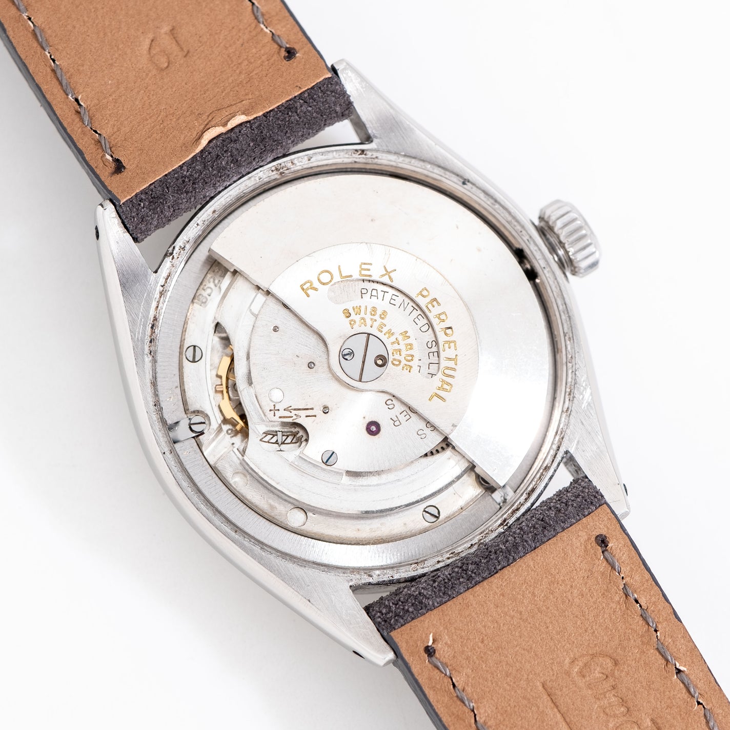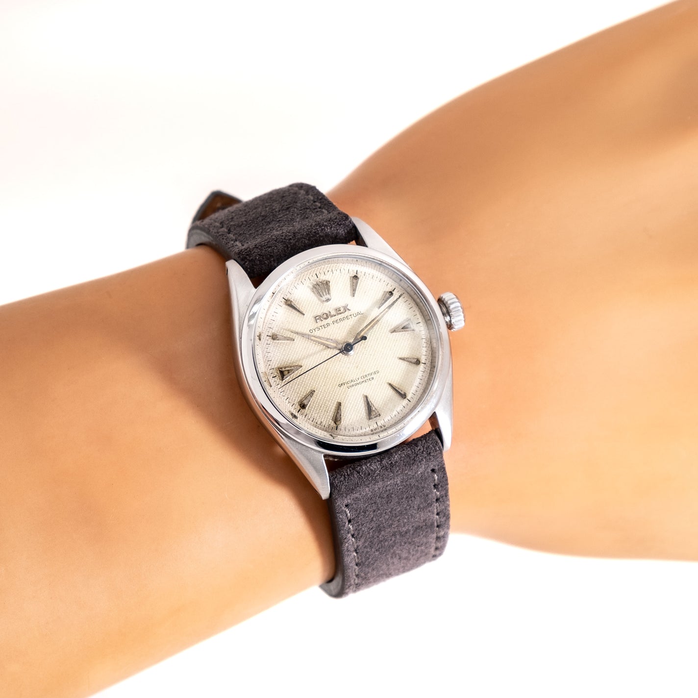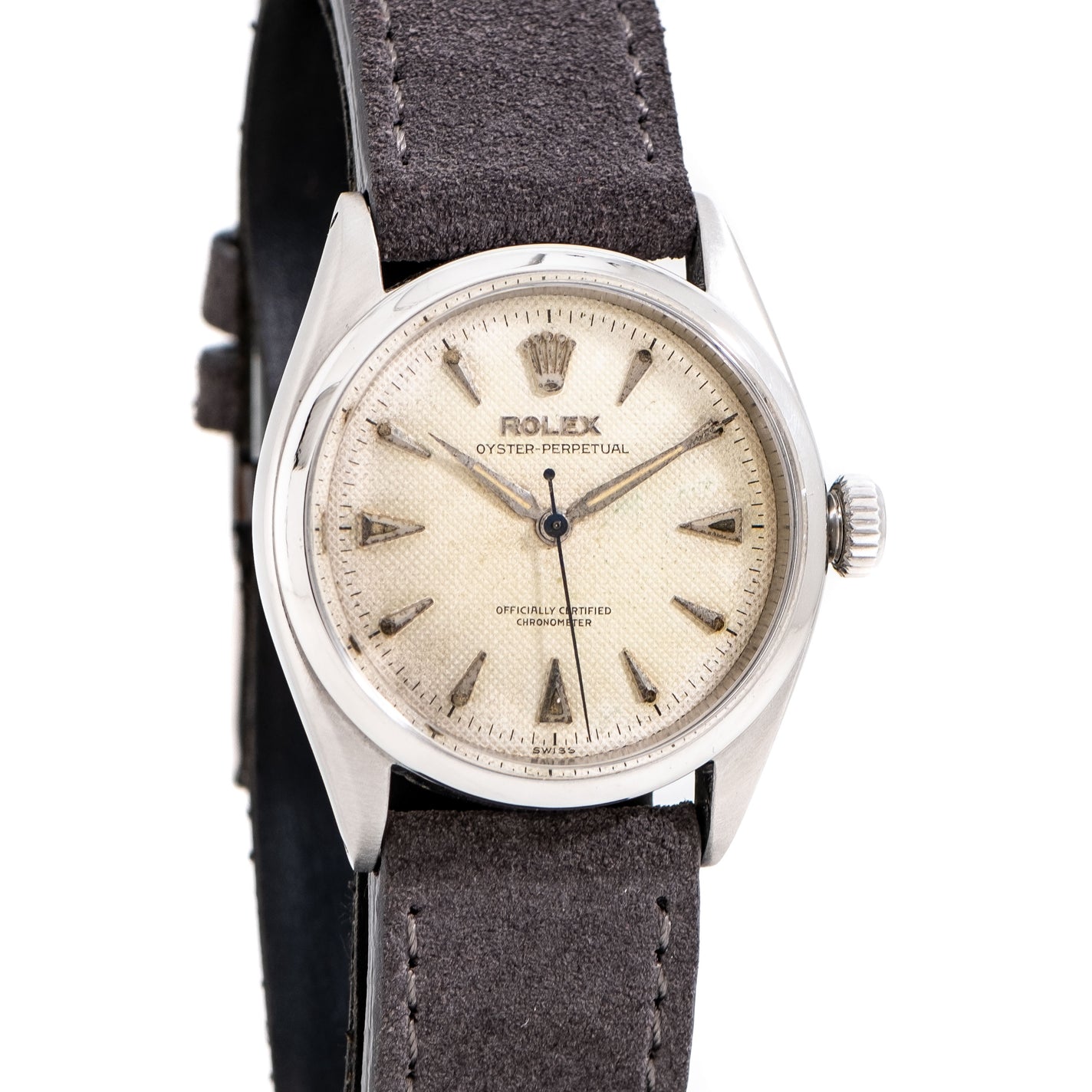1954 Vintage Rolex Oyster Perpetual 34 Waffle Dial Chronometer Ref. 6284 Watch in Stainless Steel. Features an all Original Rolex Aged Silver Waffle Textured Dial with Aged Patina, Applied Steel Pointed Hour Markers with Aged Luminous, Printed Black Colored Minute Track, and Steel Alpha Hands with Aged Luminous. Comes on a 19mm Genuine Suede Leather Grey Colored Strap. Powered by a 15 Jewel Caliber 645 Automatic Winding Movement. Triple Signed. Swiss Made.