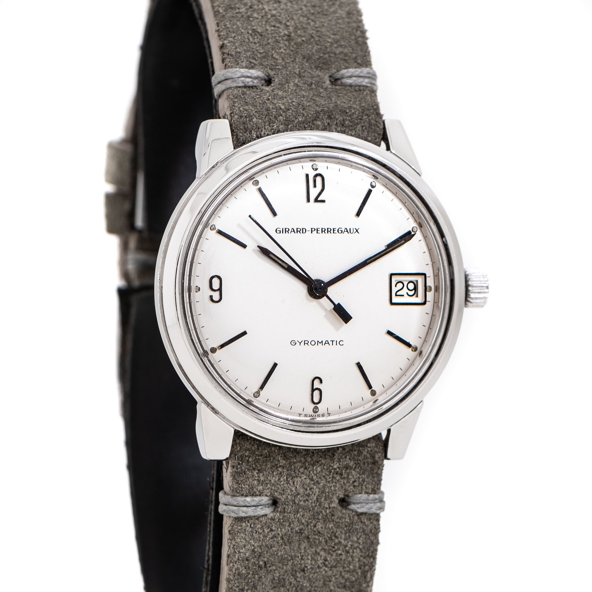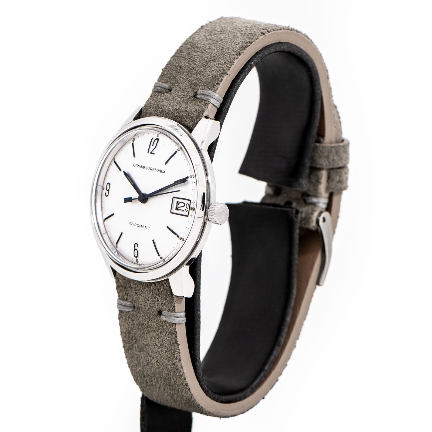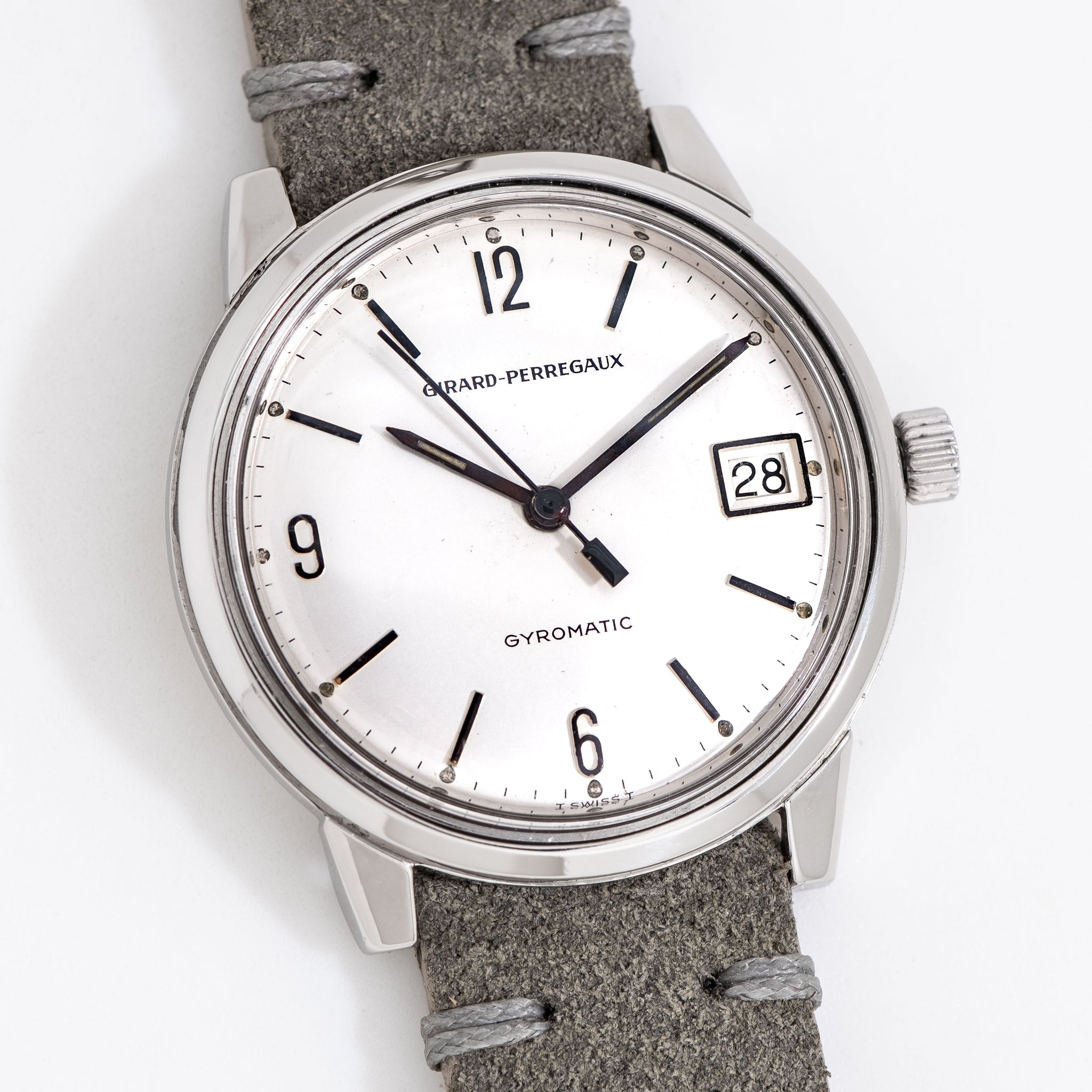 1960's Vintage Girard Perregaux Gyromatic Stainless Steel Watch. Features an all Original Silver Dial in Very Good Condition with Applied Black Colored Arabic Numerals 12, 6, 9, a Date Window at the 3 o Clock Position, and Black Colored Stick Hands with Aged Luminous. Comes on a 17mm Genuine Suede Leather Grey Colored Strap. Powered by a 17 Jewel Caliber 32.09 Automatic Winding Movement. Triple Signed. Swiss Made.