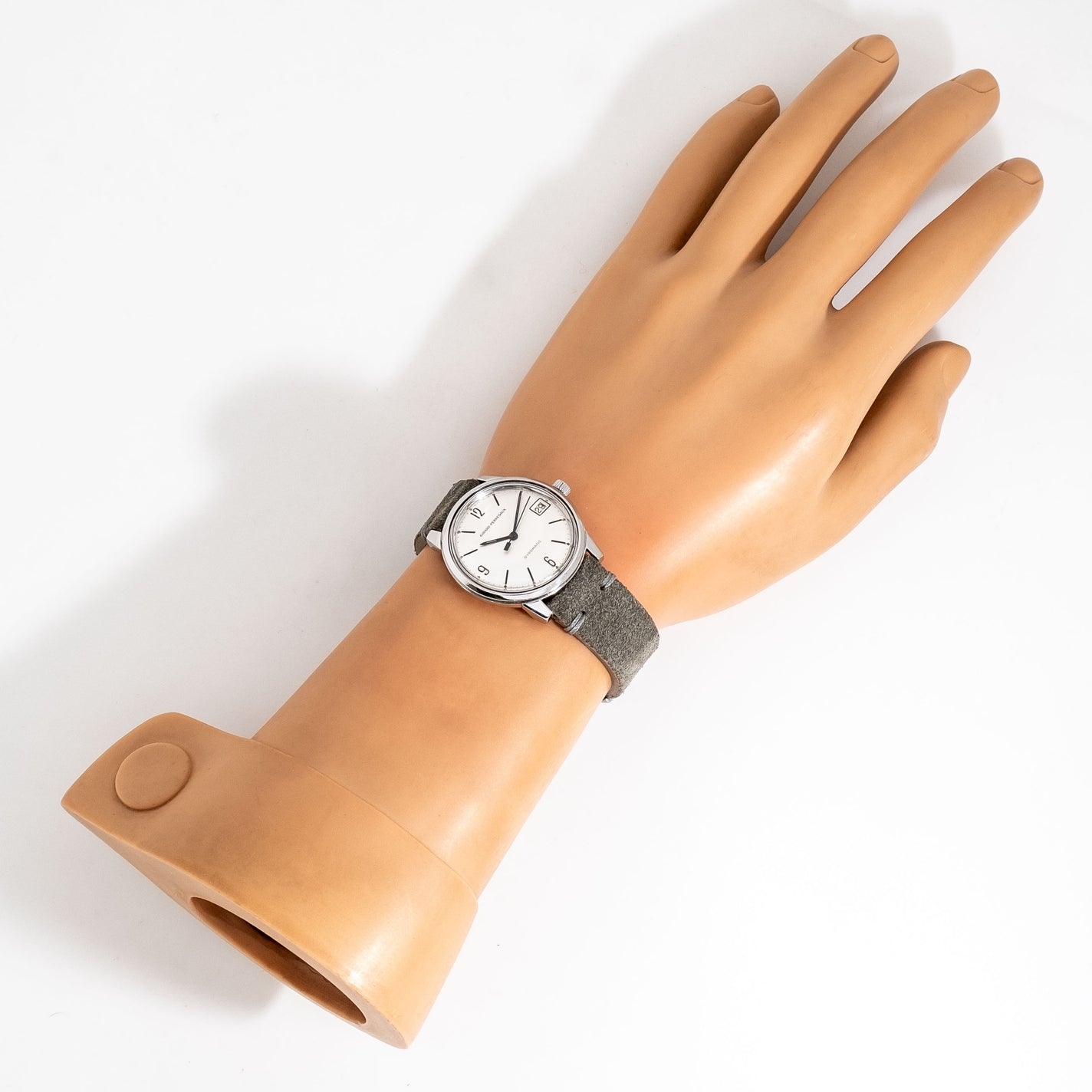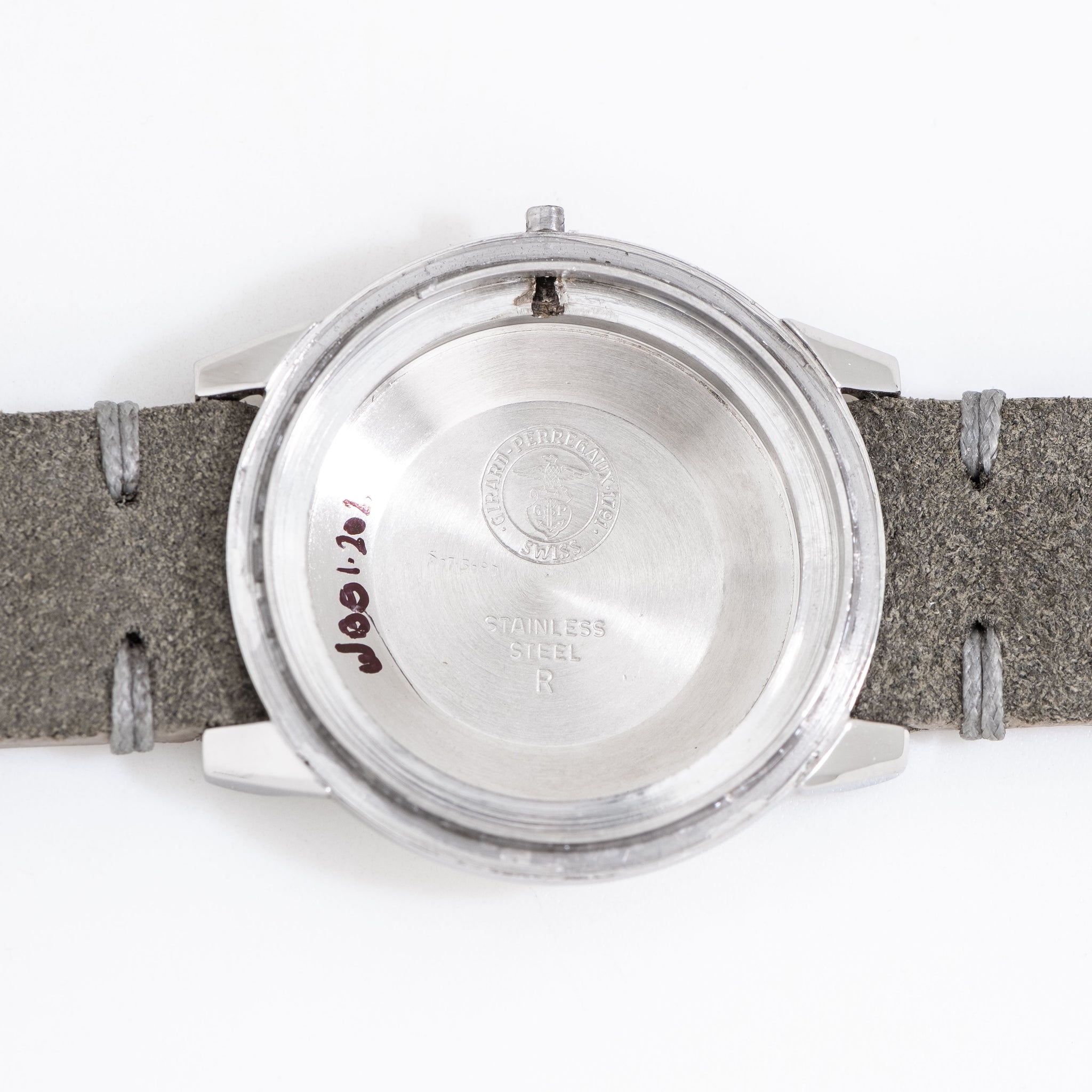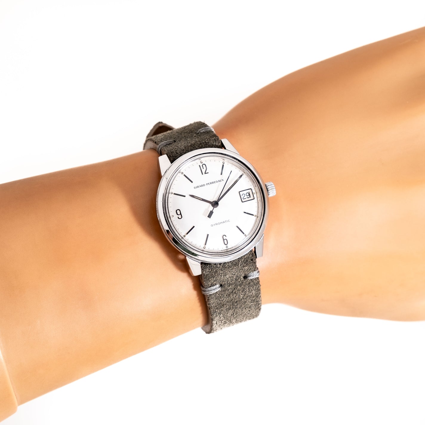 1960's Vintage Girard Perregaux Gyromatic Stainless Steel Watch. Features an all Original Silver Dial in Very Good Condition with Applied Black Colored Arabic Numerals 12, 6, 9, a Date Window at the 3 o Clock Position, and Black Colored Stick Hands with Aged Luminous. Comes on a 17mm Genuine Suede Leather Grey Colored Strap. Powered by a 17 Jewel Caliber 32.09 Automatic Winding Movement. Triple Signed. Swiss Made.