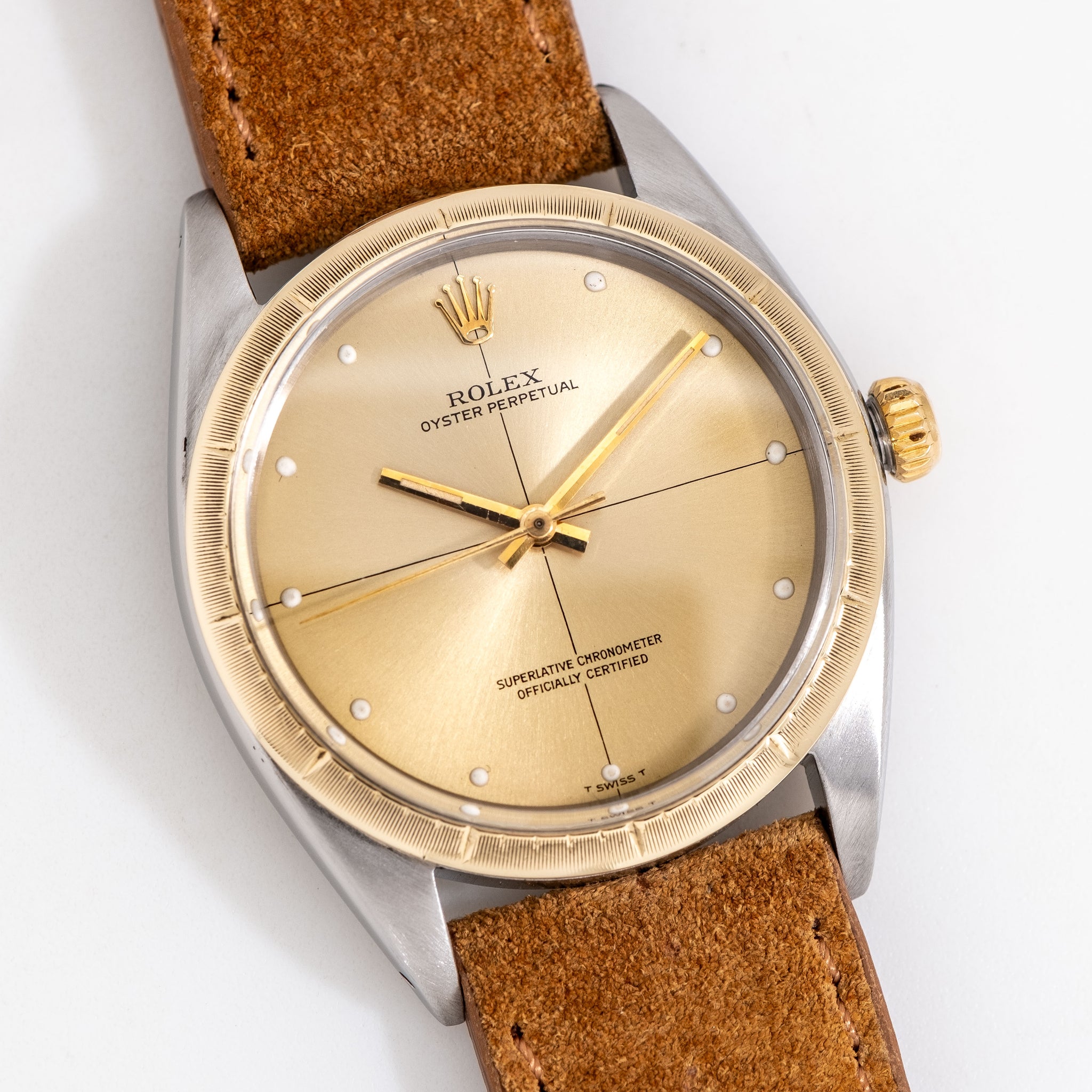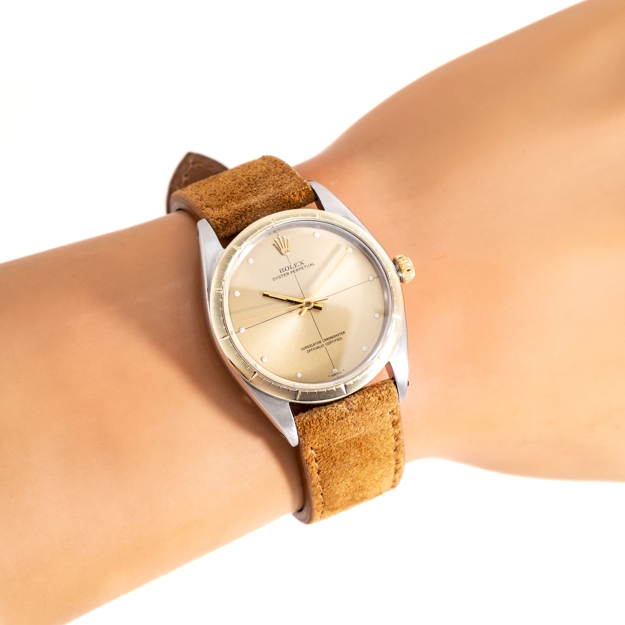 1960 Vintage Rolex Zephyr Ref. 1008 in 14k Yellow Gold & Stainless Steel. Features an all Original Champagne / Gold Colored Dial in Excellent Condition with a Crosshair Design, Painted Luminous Plots, Applied Rolex Emblem at the 12 o Clock Position, and Yellow Gold Colored Baton Hands with Luminous. Comes on a 19mm Genuine Suede Leather Brown Colored Strap. Powered by a 25 Jewel Caliber 1560 Automatic Winding Movement. Triple Signed. Swiss Made.