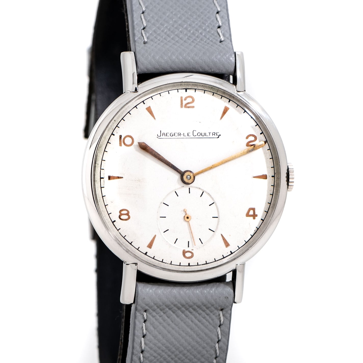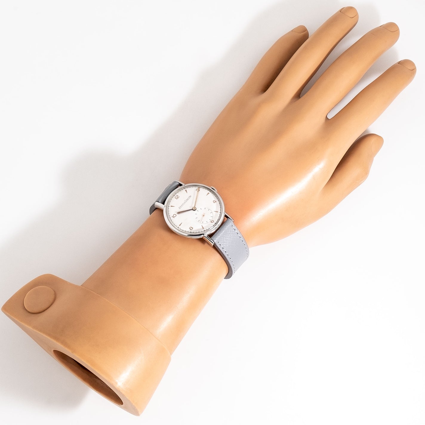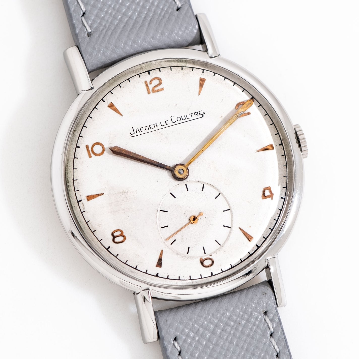 1960's Vintage LeCoultre Cal. P469/C Stainless Steel Watch. Features an all Original Professionally Restored White Colored Dial in Very Good Condition Applied Rose Gold Colored Arabic Numerals & Pointed Arrow Markers, Printed Black Colored Minute Track, Sub Seconds, and Rose Gold Colored Sword Hands. Comes on a 17mm Genuine "Saffiano" Style Leather Grey Colored Strap. Powered by a 17 Jewel Caliber P469/C Manual Winding Movement. Triple Signed. Swiss Made.