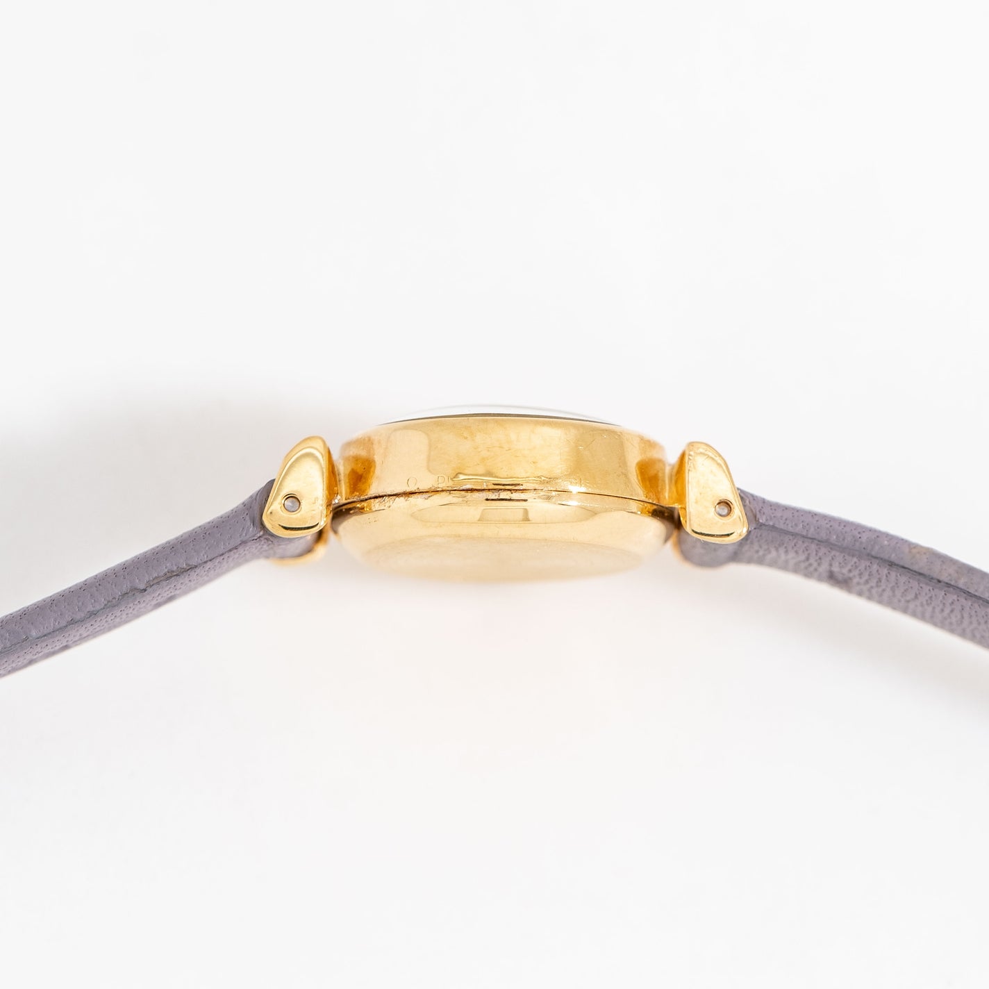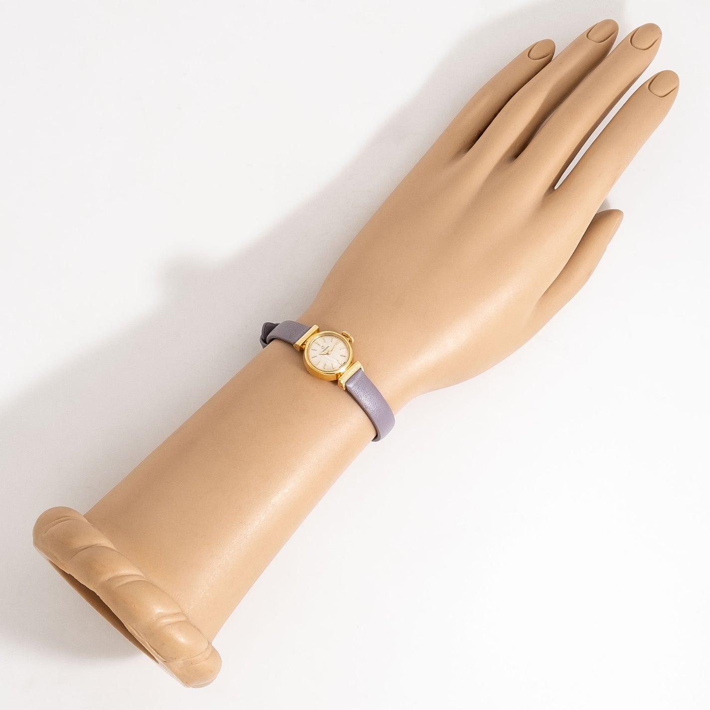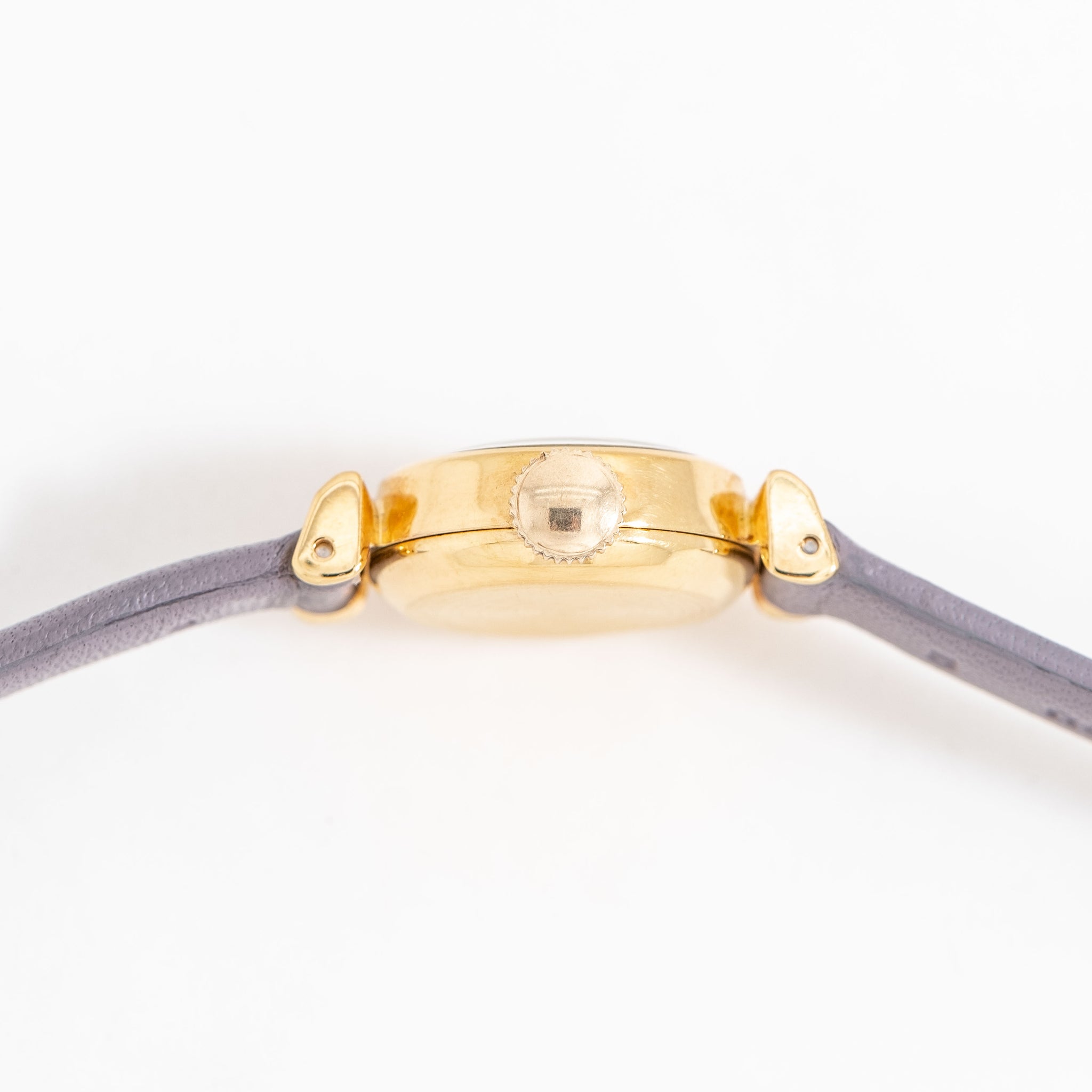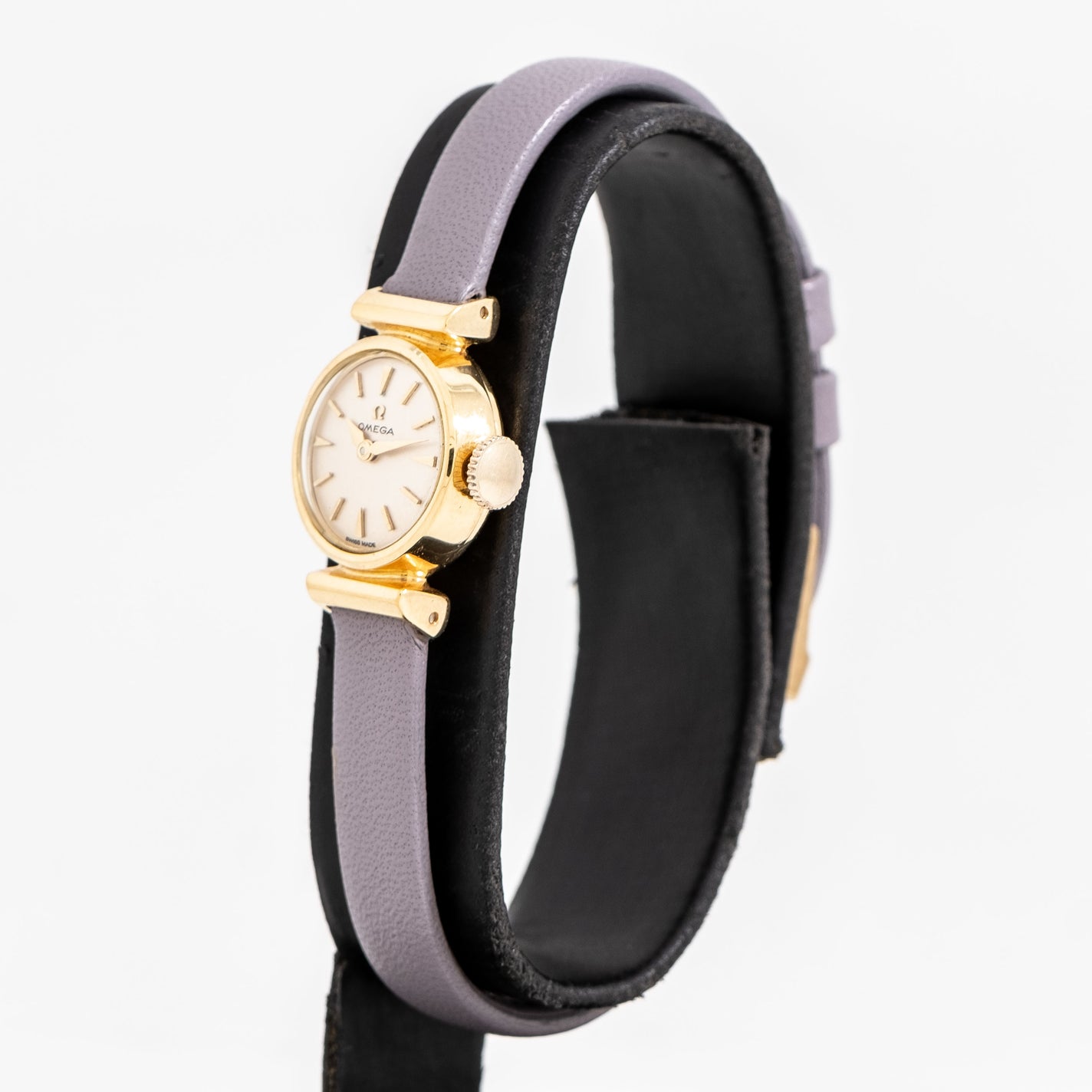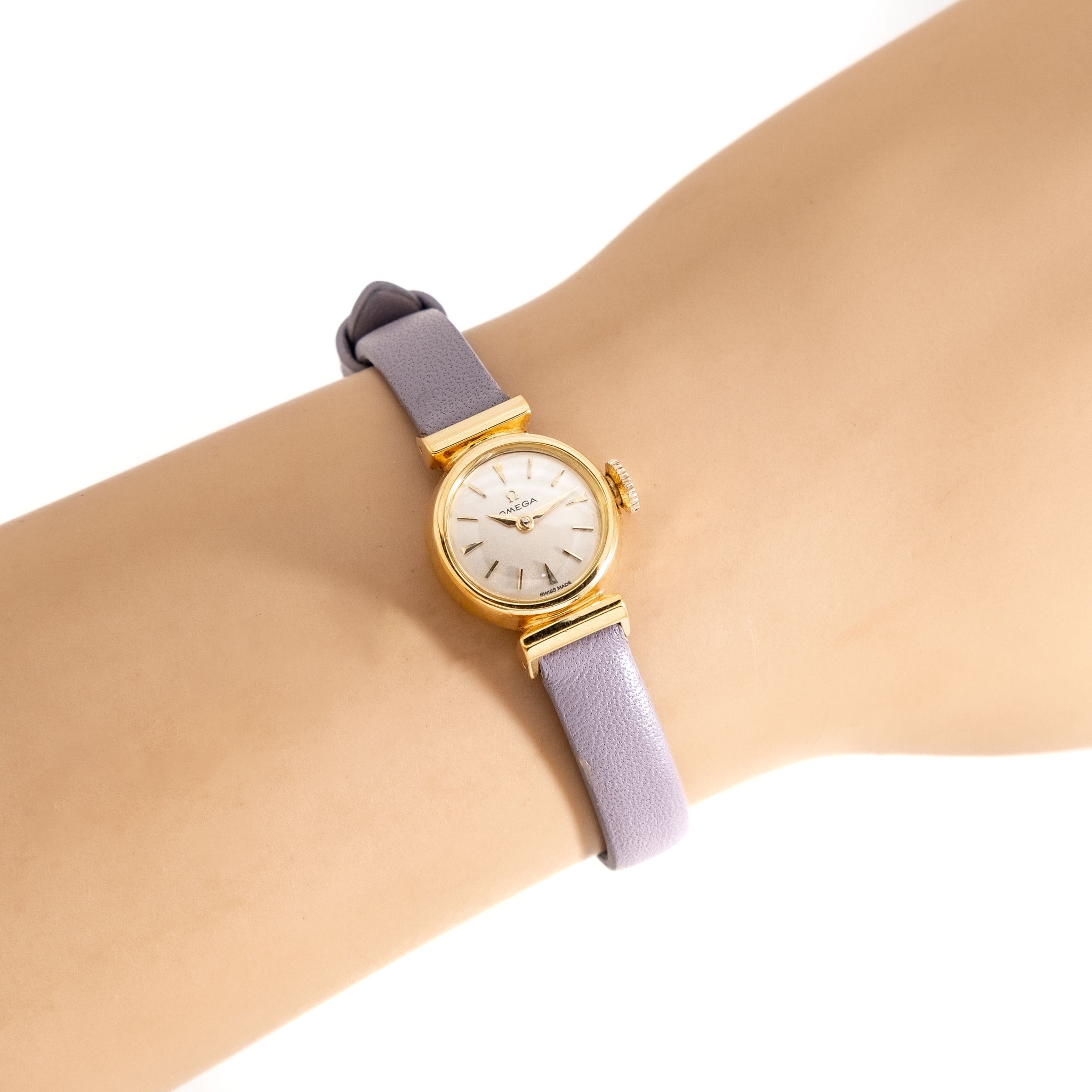 1961 Vintage Ladies Omega Ref. 2963-61 14k Yellow Gold Filled Watch. Features an all Original Silver Dial in Very Good Condition with Applied Yellow Gold Colored Stick Hour Markers, Applied Yellow Gold Colored Omega Emblem, and Yellow Gold Colored Dauphine Hands. Comes on an 8mm Genuine Leather Purple Colored Strap with an Omega Yellow Gold Plated Buckle. Powered by a 17 Jewel Caliber 483 Manual Winding Movement. Triple Signed. Swiss Made.