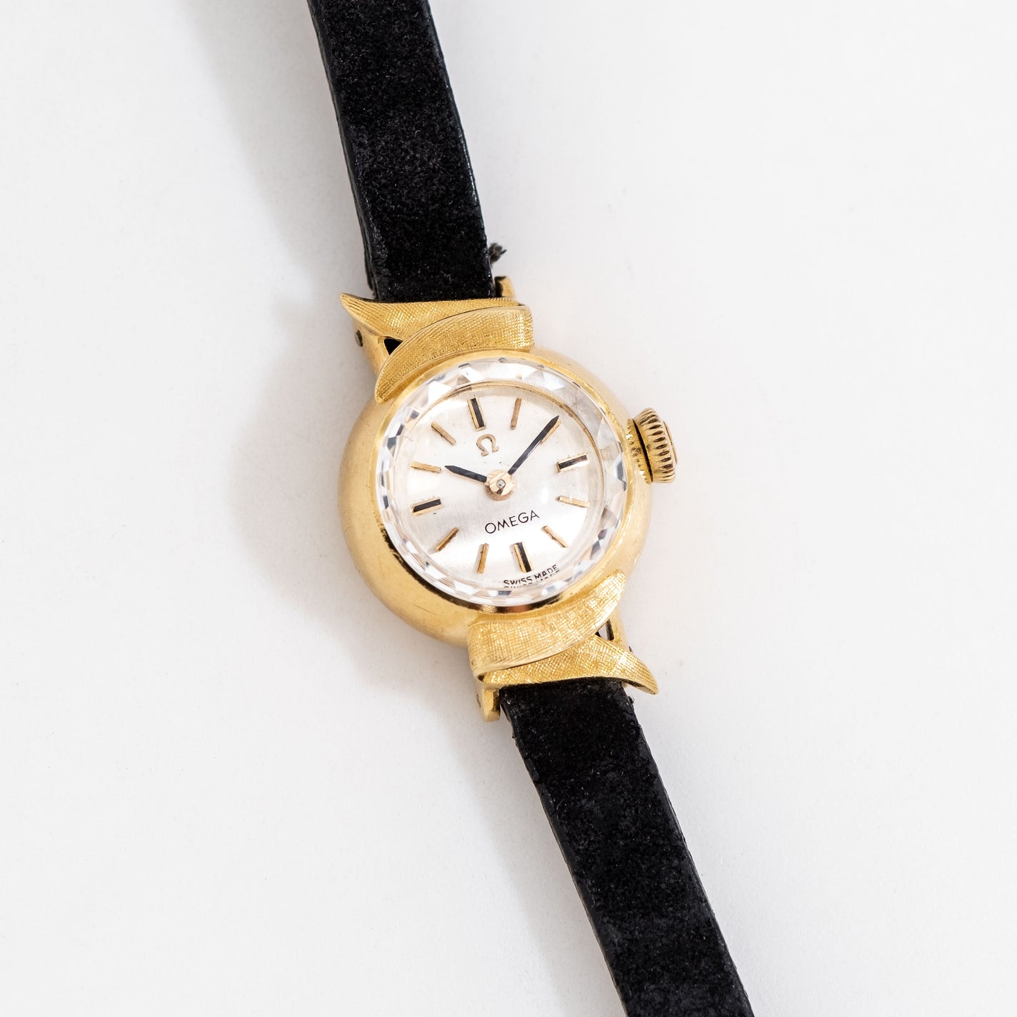 1961 Vintage Ladies Omega Solid 18k Yellow Gold Watch. Features an all Original Silver Dial in Very Good Condition with Applied Yellow Gold Colored Stick Hour Markers with Black Colored Accents, Fancy Hooded Lugs, and Black Colored Stick Hands. Comes on a 6mm Genuine Suede Leather Black Colored Strap with an Omega Gold Plated Buckle. Powered by a 17 Jewel Caliber 580 Manual Winding Movement. Triple Signed. Swiss Made.