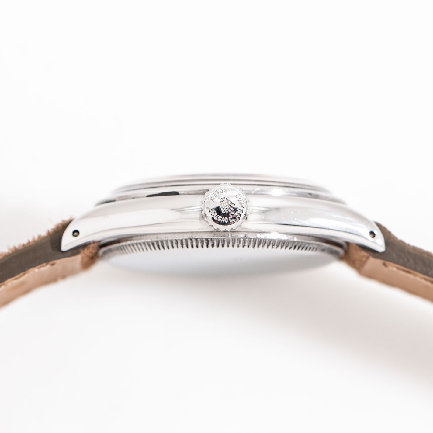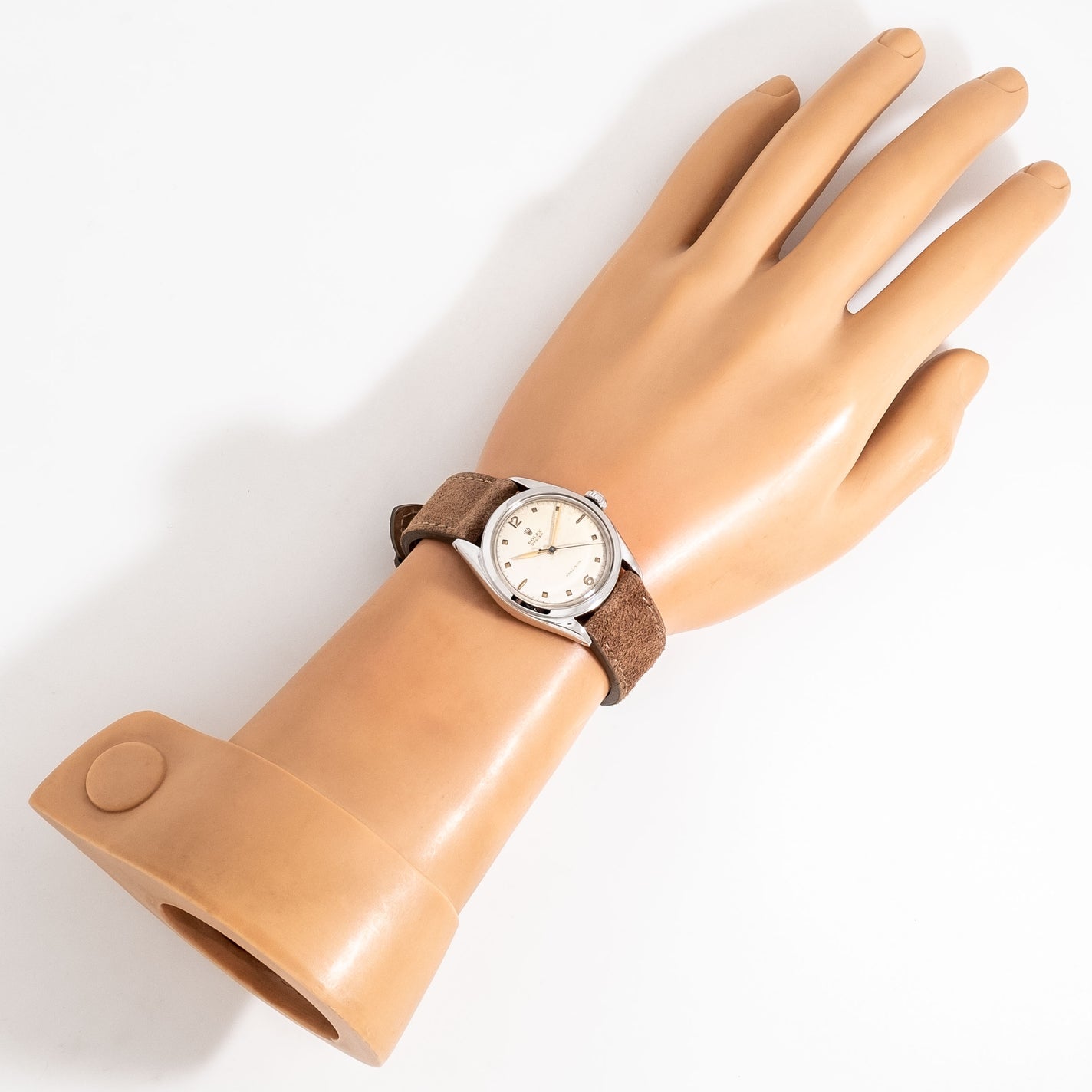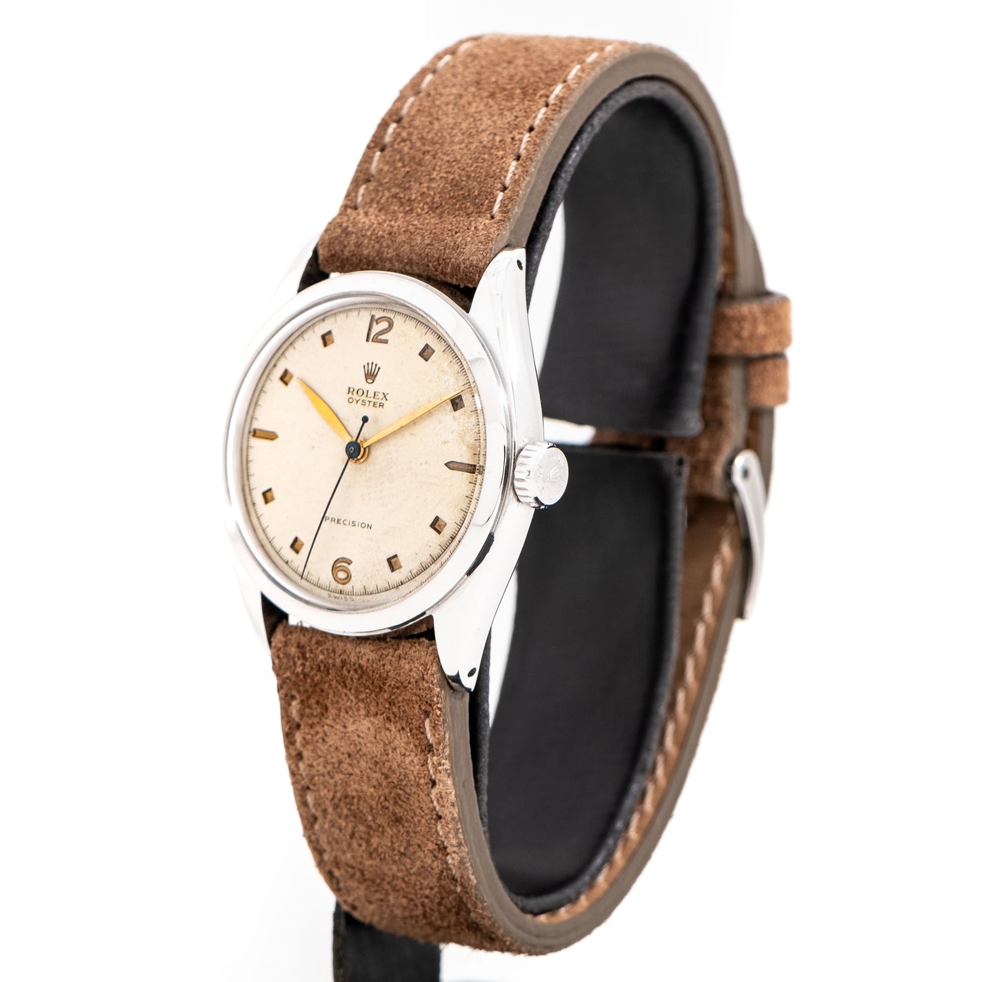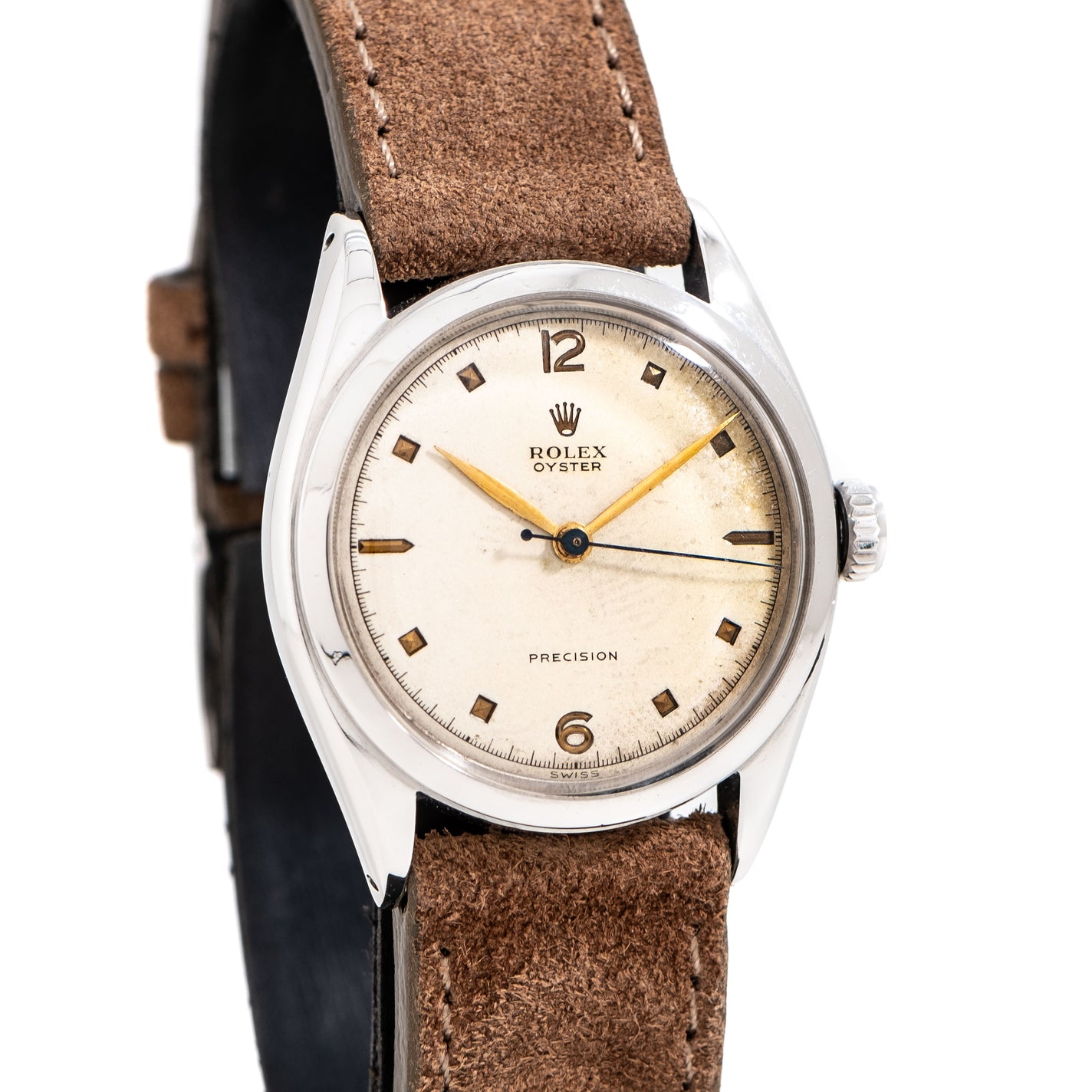1952 Vintage Rolex Oyster Ref. 6022 Stainless Steel Watch. Features an all Original Dial with Aged Warm Aged Patina, Recessed Block Hour Markers, Recessed 12, 6, Arabic Numerals, a Printed Black Colored Minute Track, and Yellow Gold Colored Leaf Hands. Comes on a 19mm Genuine Suede Leather Brown Colored Strap. Powered by a 17 Jewel 10 1/2 H Manual Winding Rolex Movement. Triple Signed. Swiss Made.