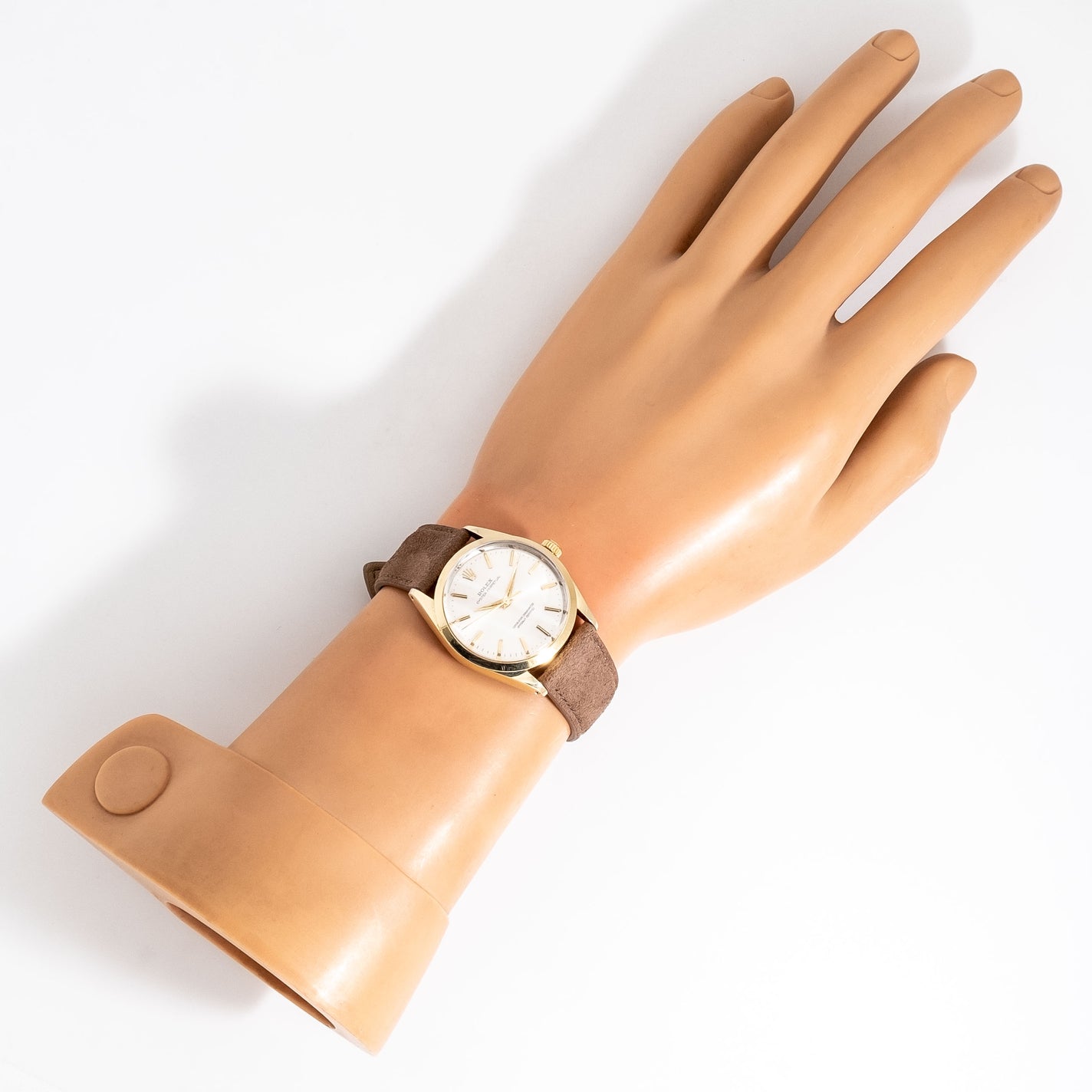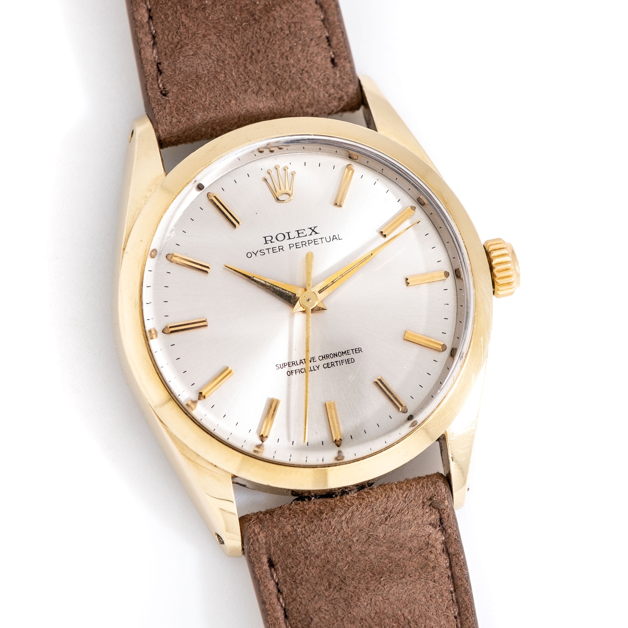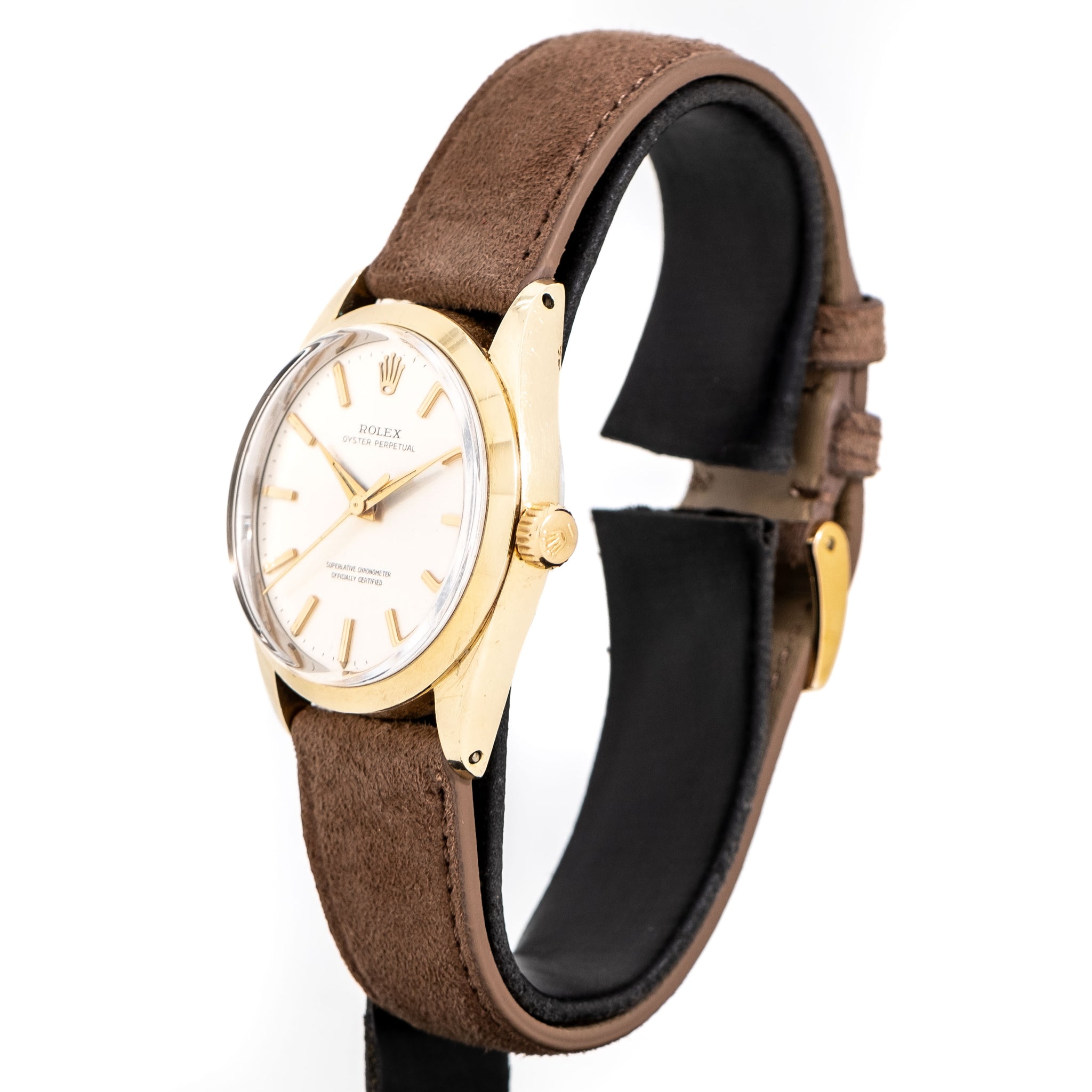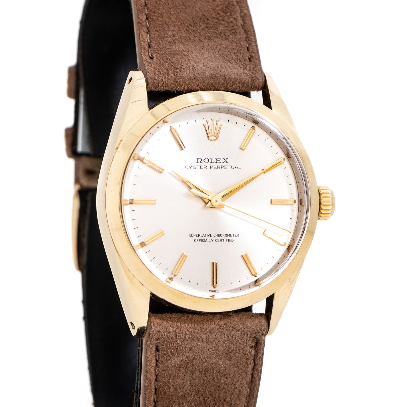 1963 Vintage Rolex Oyster Perpetual Ref. 1024 14k Gold Shell Over Stainless Steel Watch. Features an all Original Silver Dial in Very Good Condition with Applied Yellow Gold Colored Bar Markers with Warm Aged Luminous Plots, Printed Black Colored Minute Track, and Yellow Gold Colored Dauphine Hands with Luminous. Comes on a 19 mm Genuine Suede Leather Brown Colored Strap with a Yellow Gold Plated Rolex Signed Buckle. Powered by a 26 Jewel Caliber 1560 Automatic Winding Movement. Triple Signed. Swiss Made.