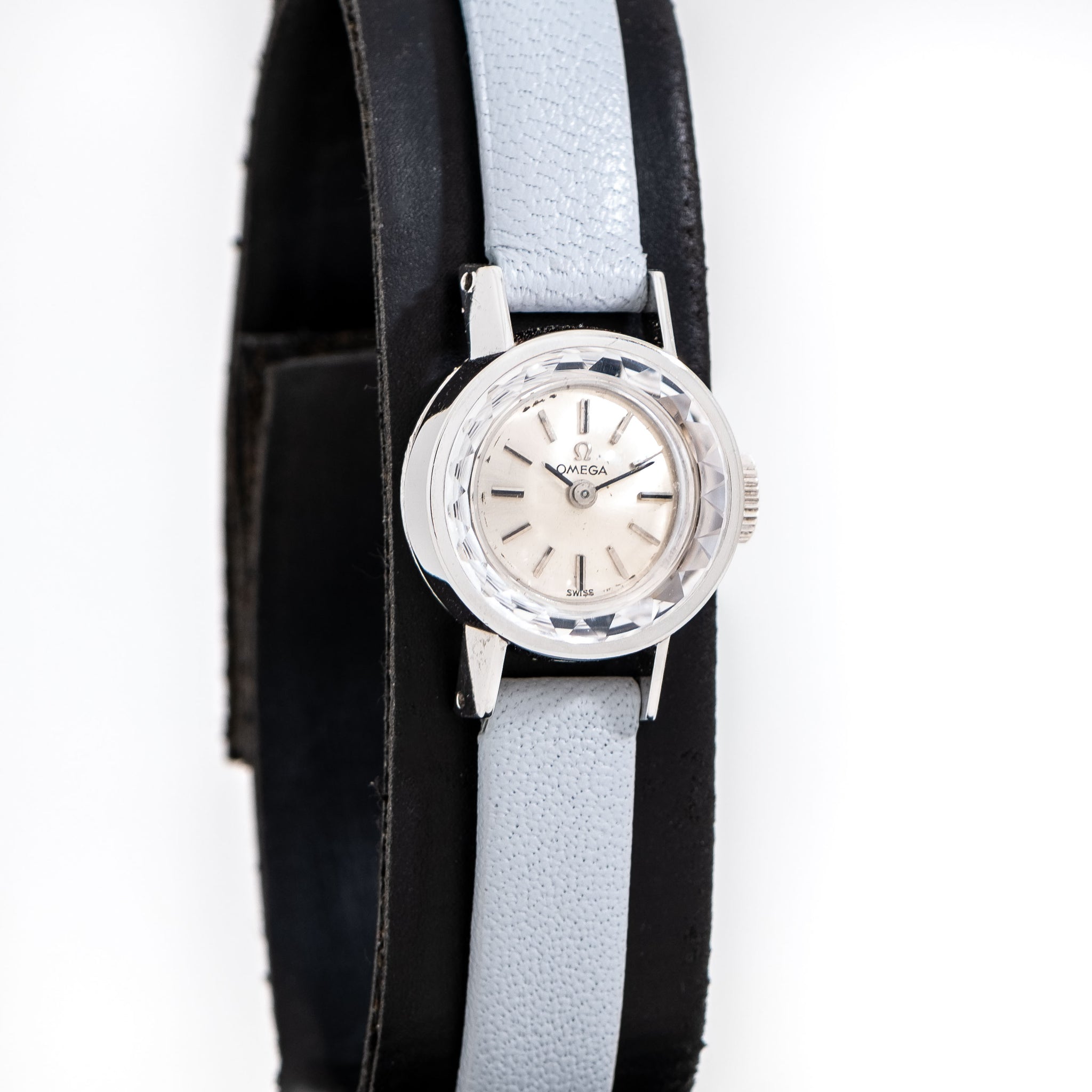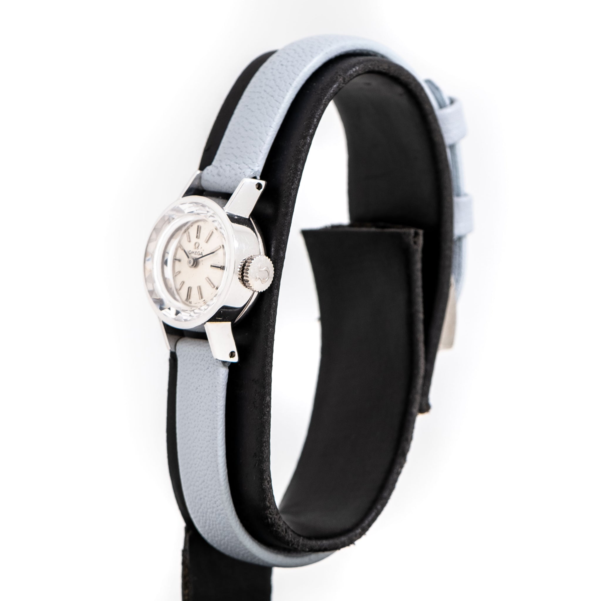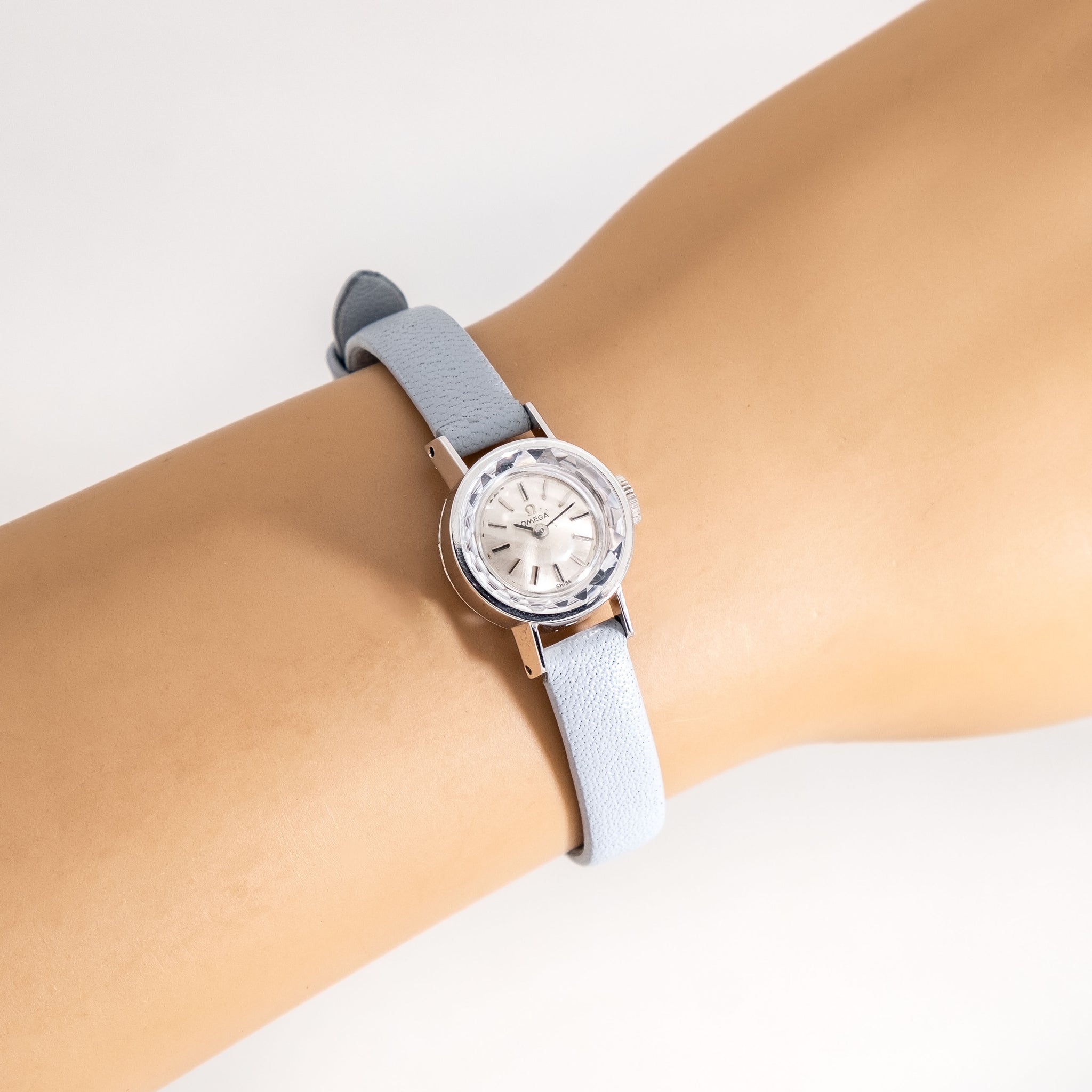 1965 Vintage Ladies Omega Solid 18k White Gold Watch. Features an all Original Silver Dial in Good Condition with Applied Steel Stick Hour Markers with Black Colored Accents, an Applied Omega Emblem, and Black Colored Stick Hands. Comes on an 8mm Genuine Leather Light Gray Colored Strap with an Omega Stainless Steel Buckle. Powered by a 17 Jewel Caliber 484 Manual Winding Movement. Triple Signed. Swiss Made.