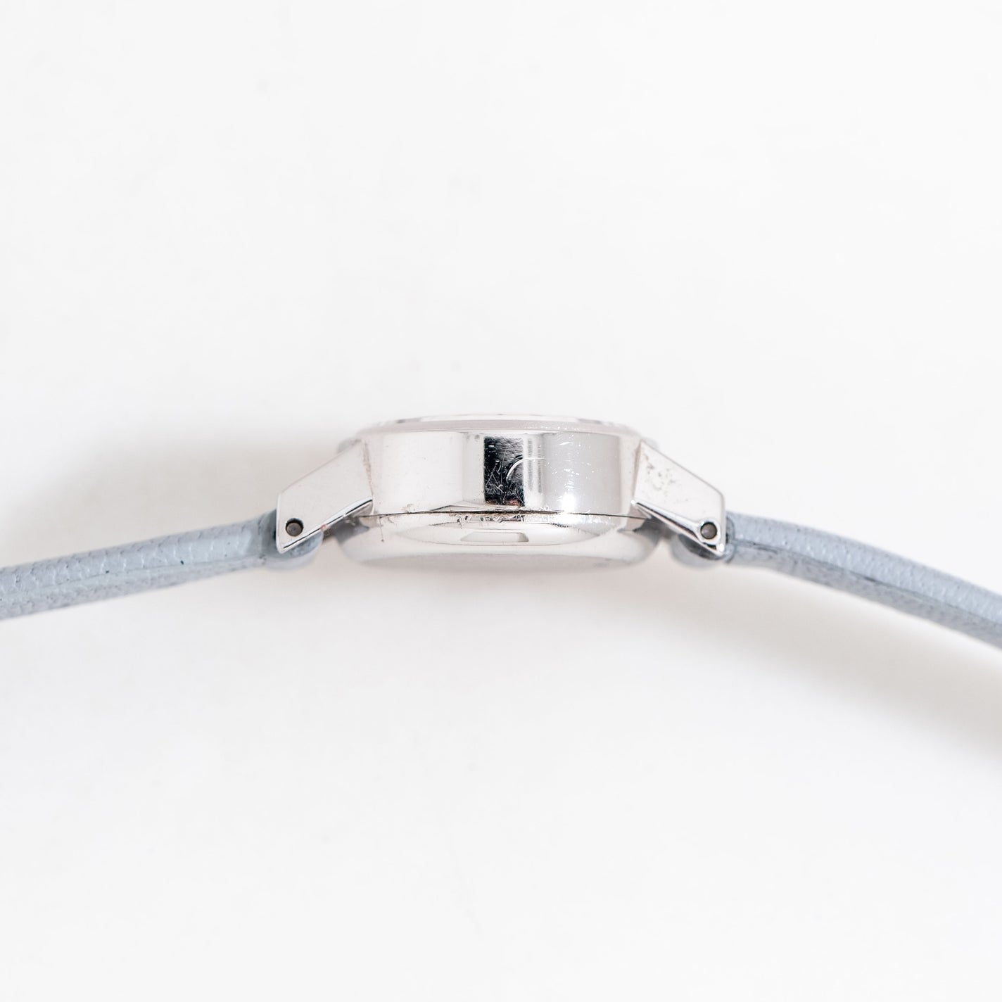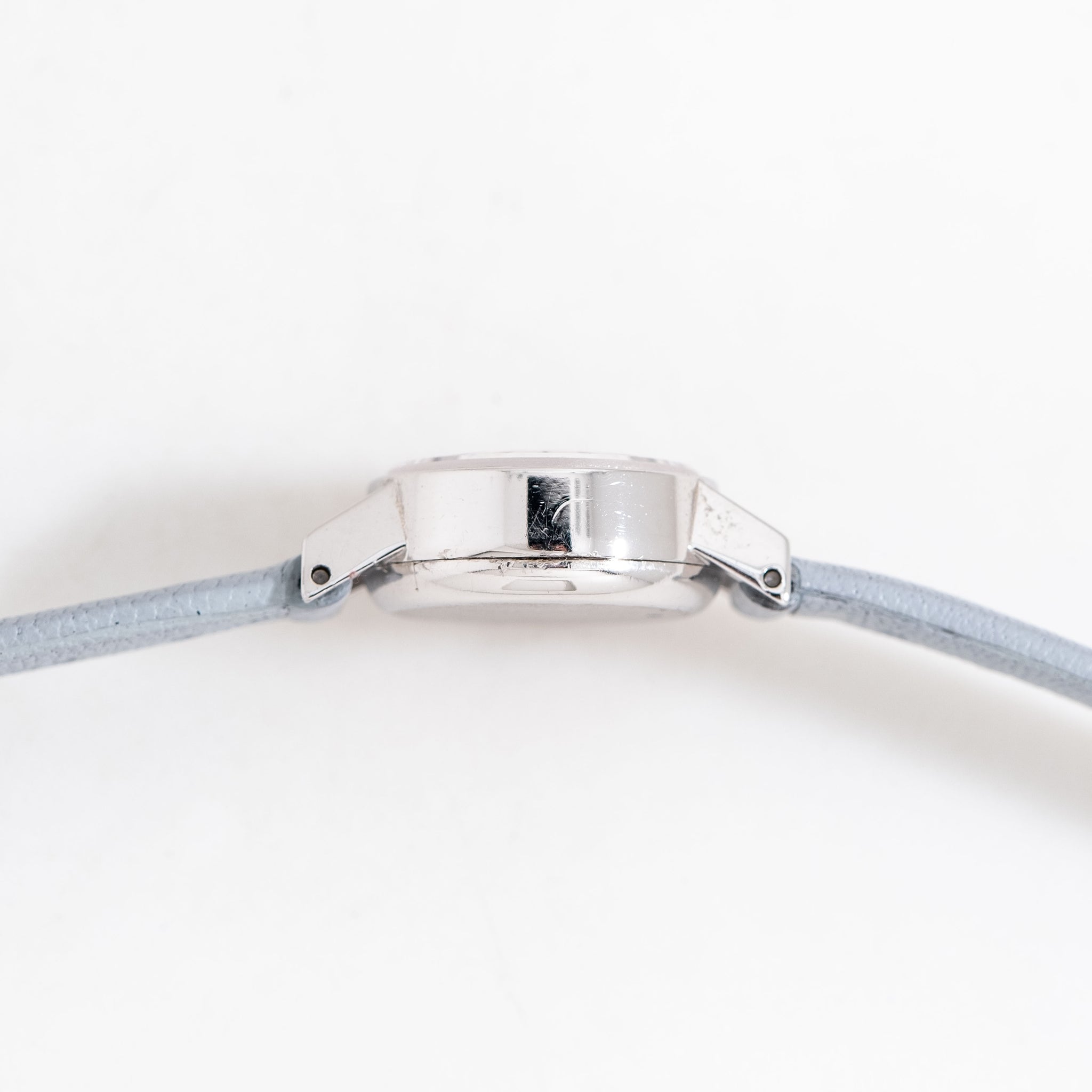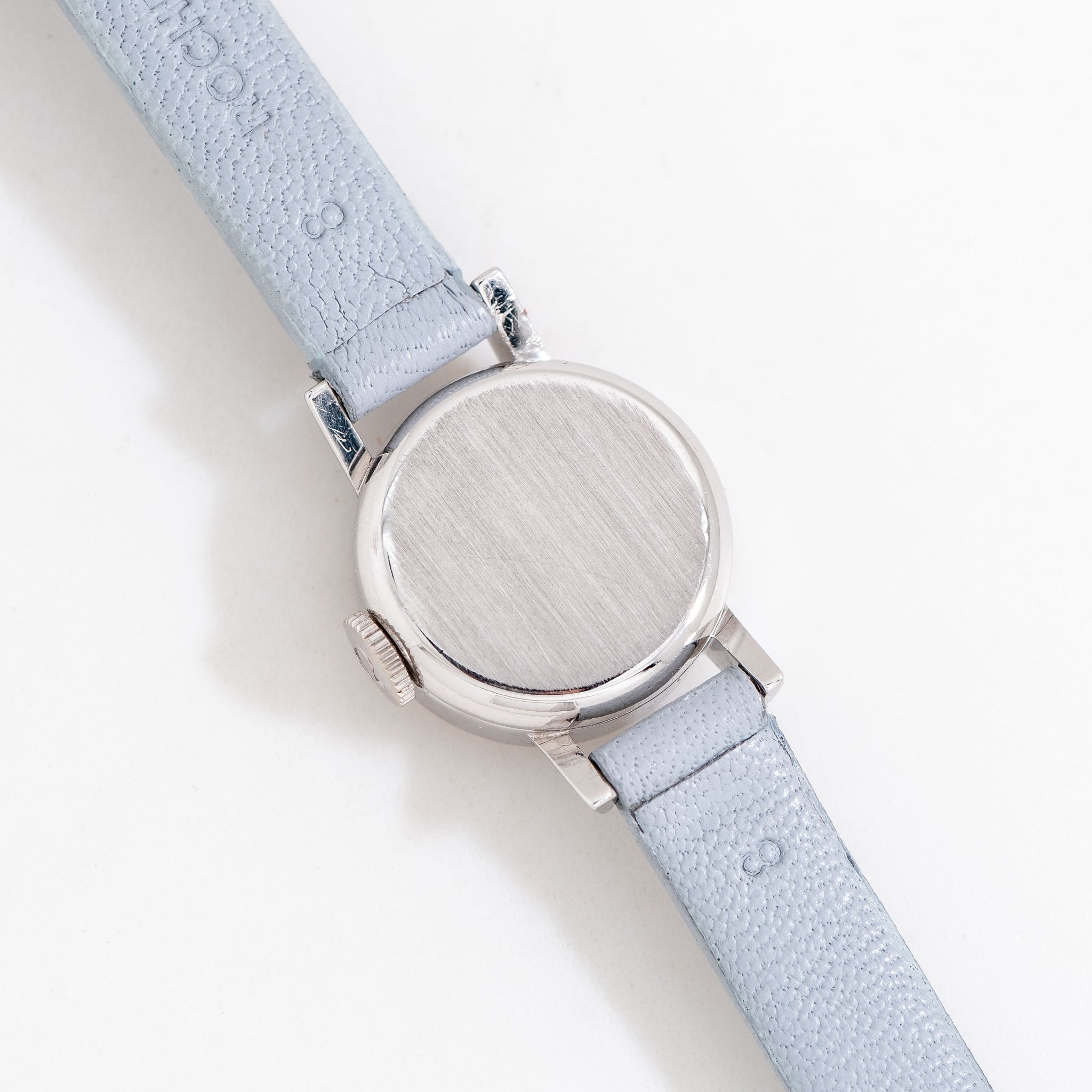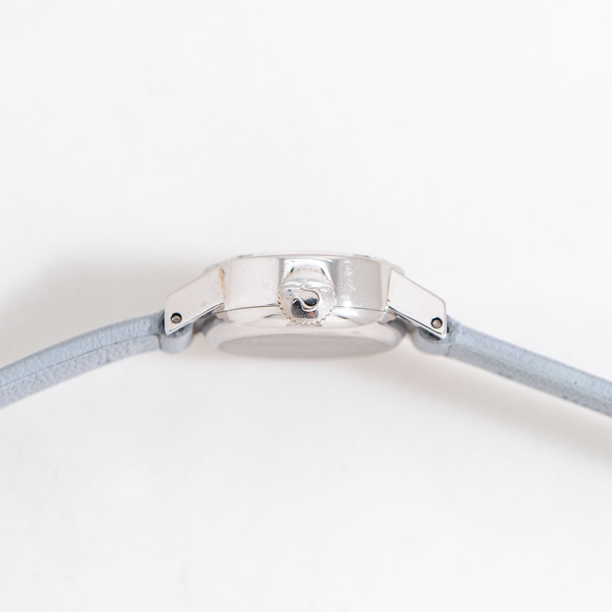 1965 Vintage Ladies Omega Solid 18k White Gold Watch. Features an all Original Silver Dial in Good Condition with Applied Steel Stick Hour Markers with Black Colored Accents, an Applied Omega Emblem, and Black Colored Stick Hands. Comes on an 8mm Genuine Leather Light Gray Colored Strap with an Omega Stainless Steel Buckle. Powered by a 17 Jewel Caliber 484 Manual Winding Movement. Triple Signed. Swiss Made.